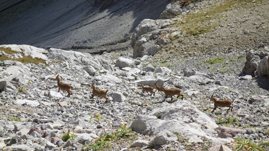Langs de bergwand komen we diverse kuddes mannelijke steenbokken tegen, grazend of liggend. Die hoorns zijn echt wel indrukwekkend. Wat afstand houden is wel aangewezen.