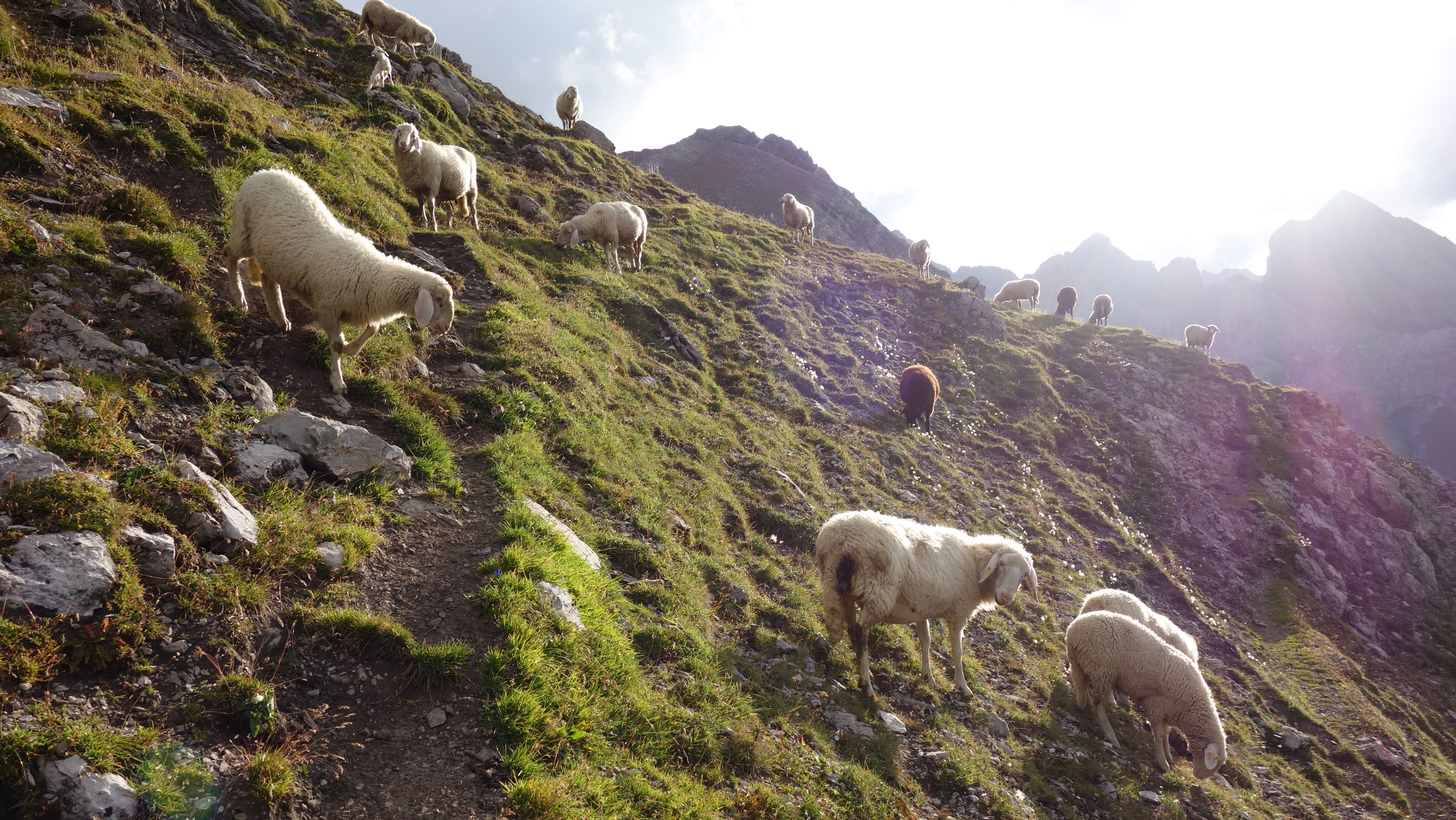 Aan de andere kant van het diepe en groene Parseiertal staat de Memminger Hütte. Even zitten we terug onder de boomgrens. Een troep gemzen zet het op een lopen. Het pad zigzagt de steile flank omhoog.
