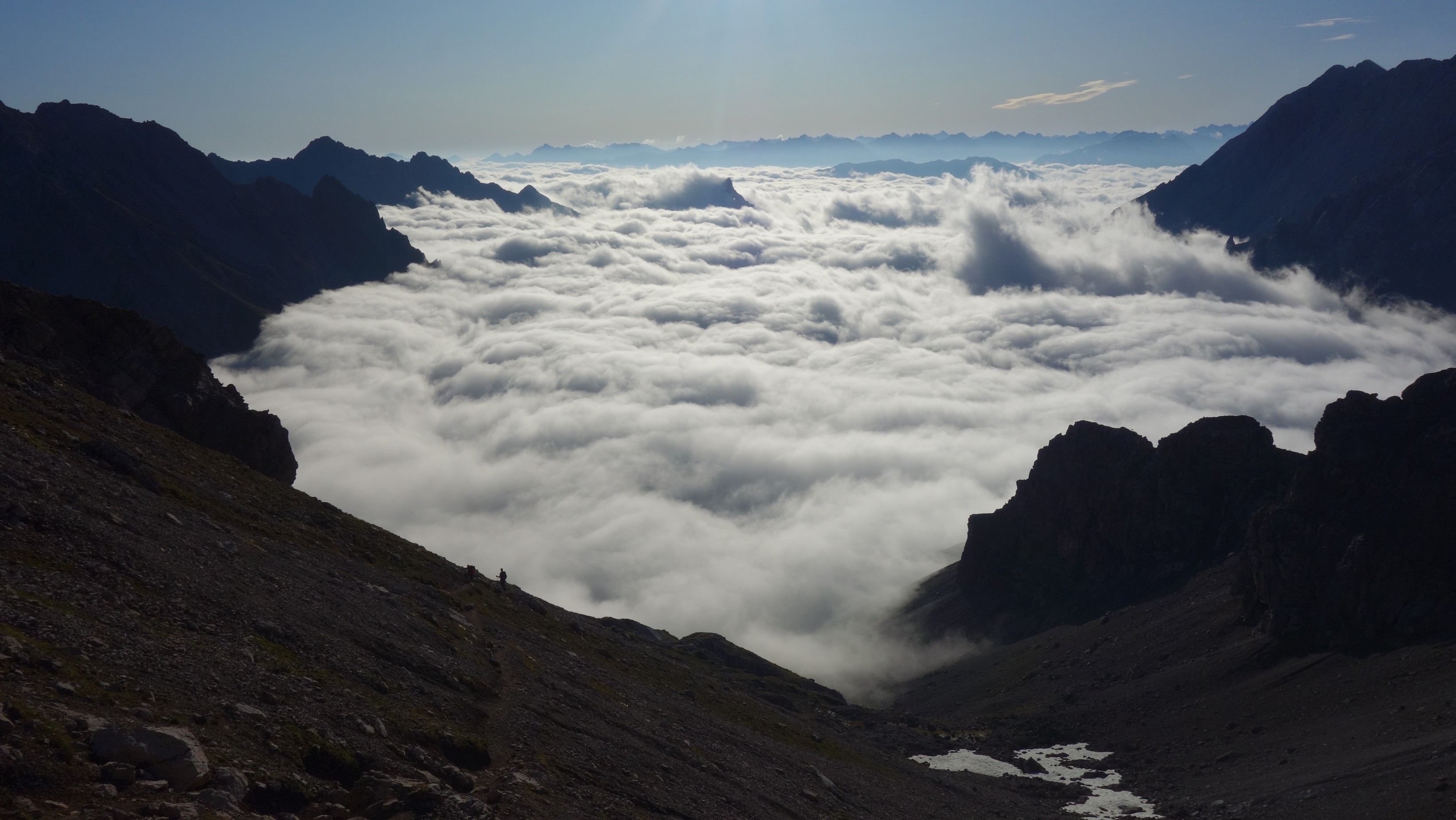 Gelukkig daalt iedereen daarna af, en lopen we alleen naar de Großbergkopf. Het zicht over de ‘mer de nuages’ is ronduit adembenemend. Dit wolkenmeer ontstaat door inversie, als de koude en vochtige lucht gevangen zit in het dal.