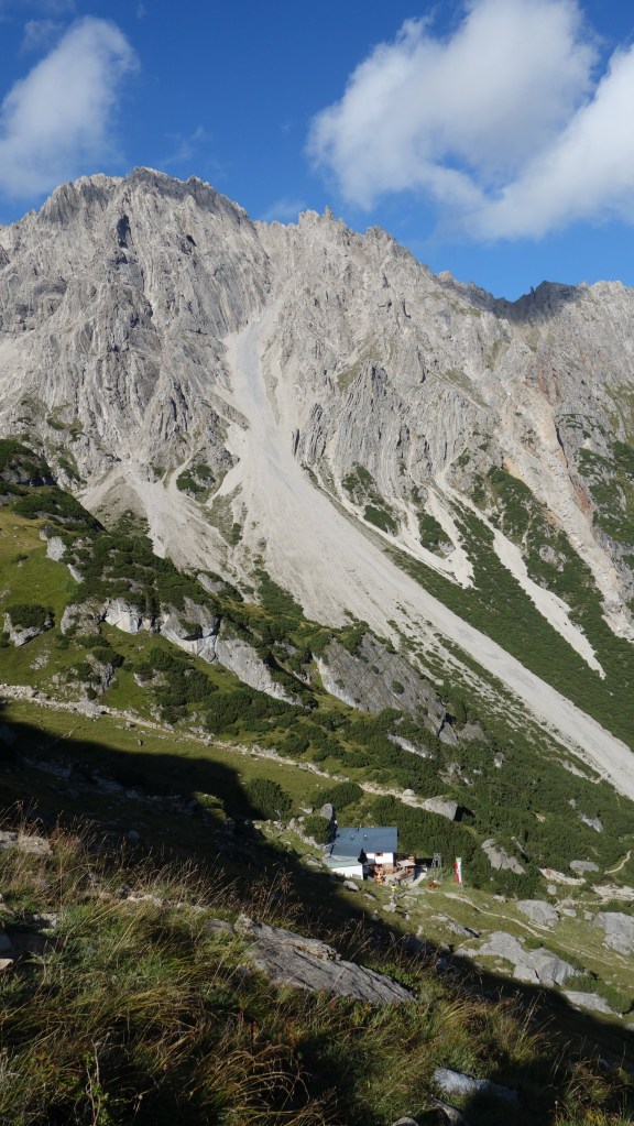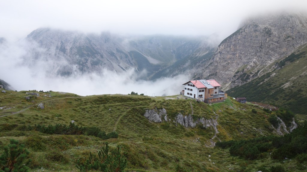 De laatste bergtop van vandaag is de Samspitze. Daar zien we de berghut al liggen en veel verder had die niet hoeven te staan.