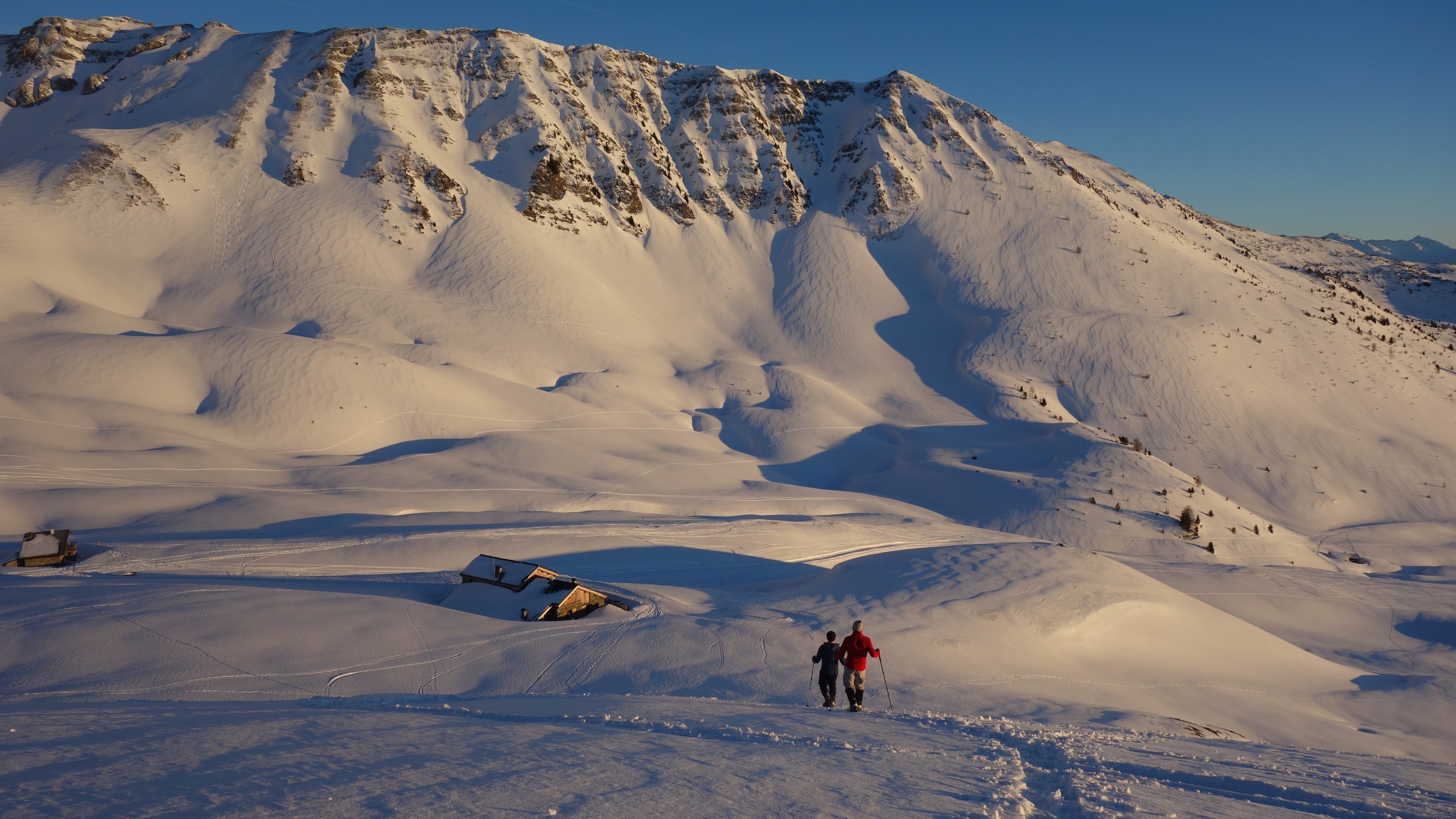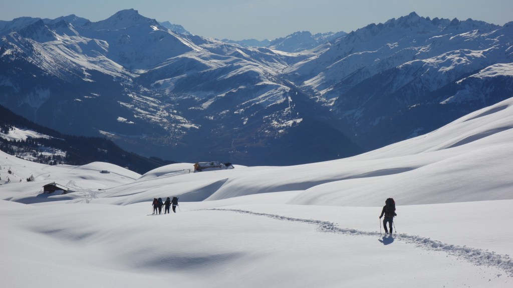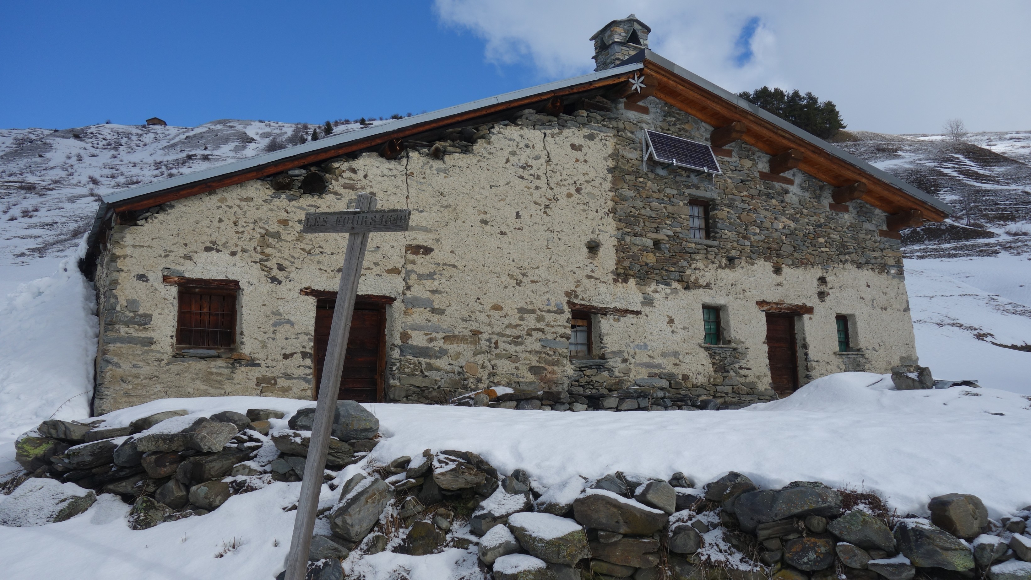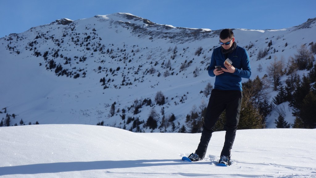 Nabij het gehuchtje ‘la Lance’ kunnen de sneeuwschoenen eindelijk aan. We lopen van de ene naar de andere verlaten boerderij. Na de lunch gaan we aan de slag met lawinebieps, sonde en schop. Een bruikbare opfrissing, veel leuker dan in het zand, en ook een ideaal moment om in groep te leren samenwerken. Zo kan ik met een gerust hart op stap en erop vertrouwen dat mijn deelnemers mij terugvinden in geval van een lawine… Ik volg de redenering niet van sommige gidsen die verklaren: “Le risque d’avalanche, c’est mon problème.”