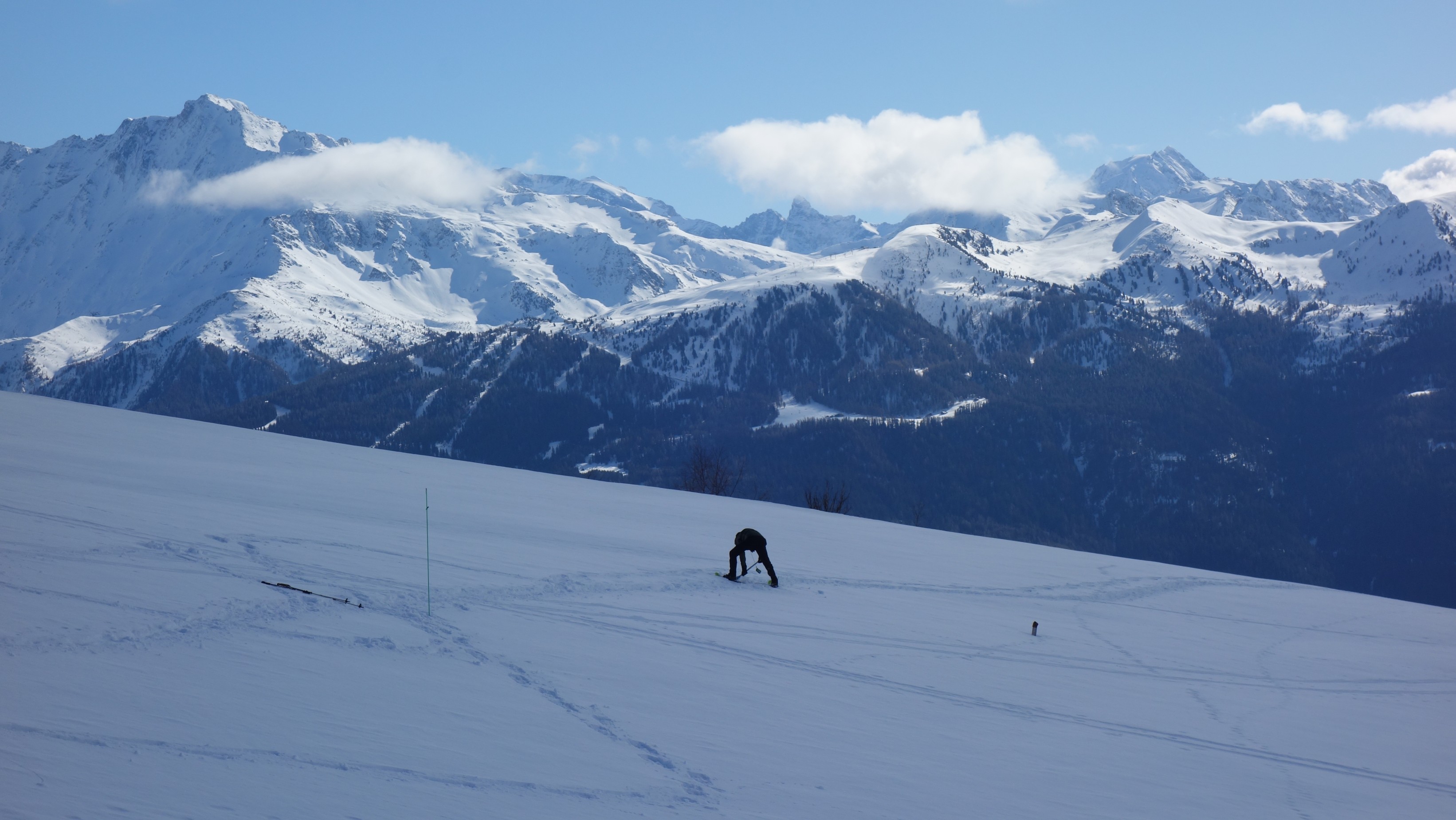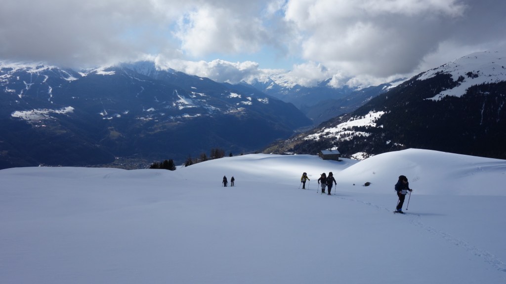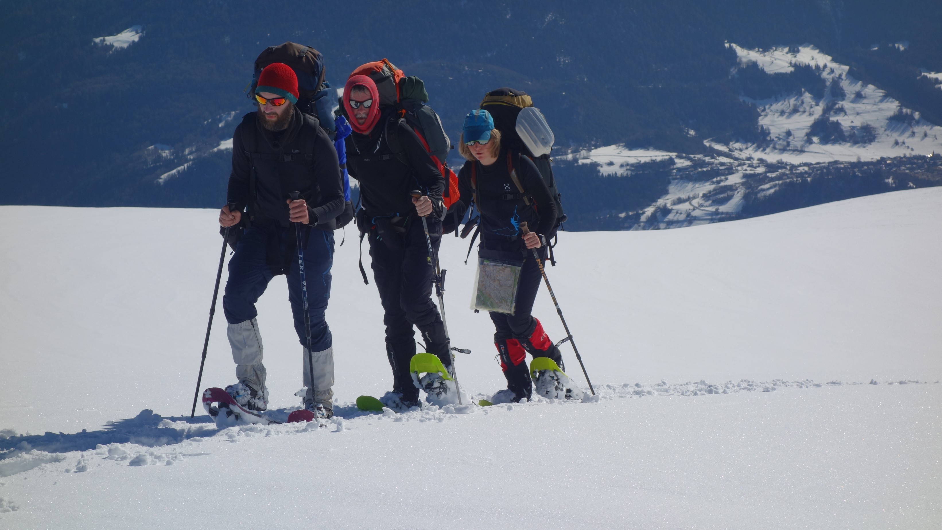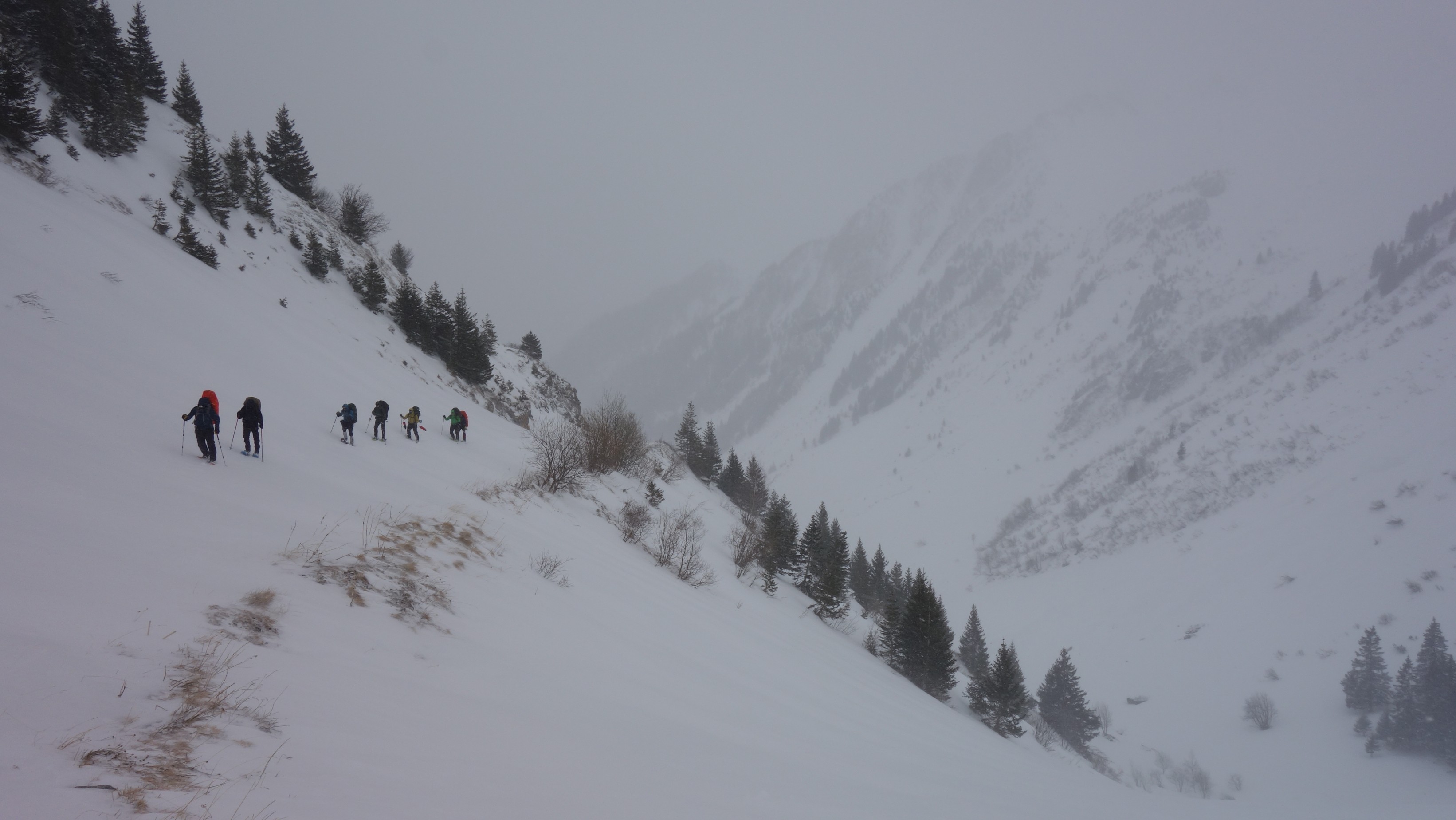 Nabij het gehuchtje ‘la Lance’ kunnen de sneeuwschoenen eindelijk aan. We lopen van de ene naar de andere verlaten boerderij. Na de lunch gaan we aan de slag met lawinebieps, sonde en schop. Een bruikbare opfrissing, veel leuker dan in het zand, en ook een ideaal moment om in groep te leren samenwerken. Zo kan ik met een gerust hart op stap en erop vertrouwen dat mijn deelnemers mij terugvinden in geval van een lawine… Ik volg de redenering niet van sommige gidsen die verklaren: “Le risque d’avalanche, c’est mon problème.”