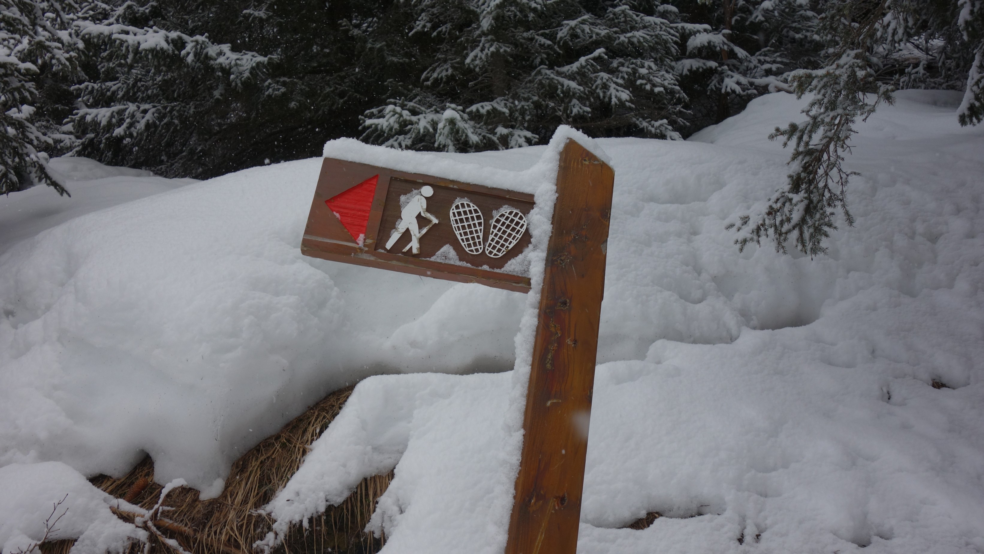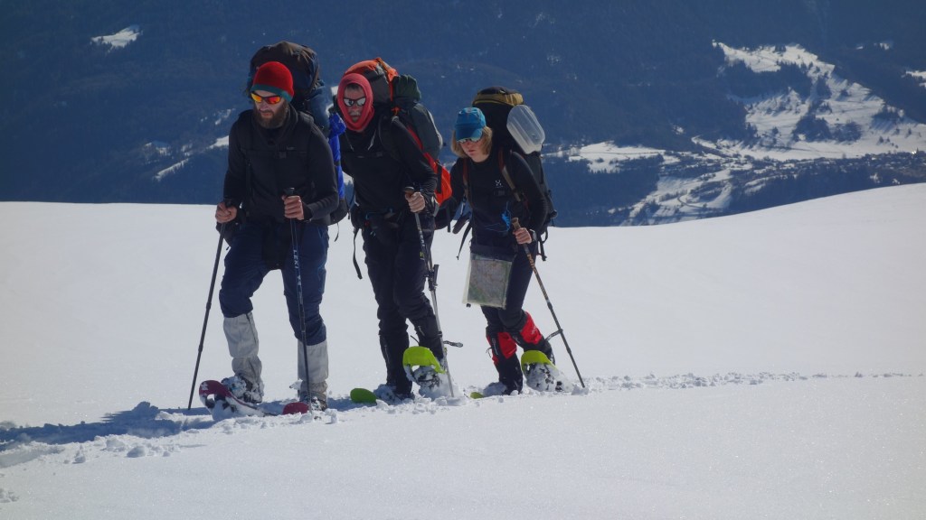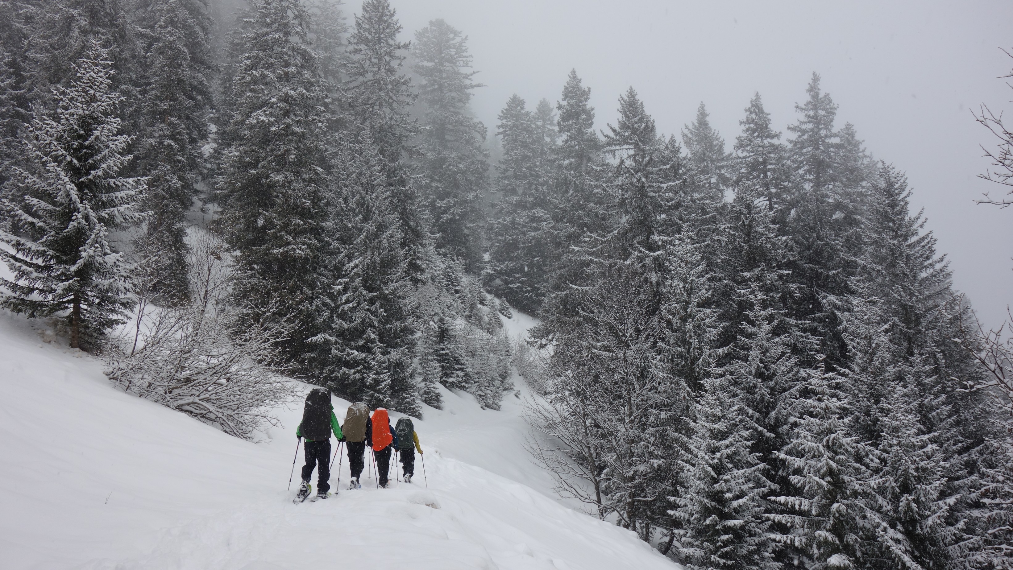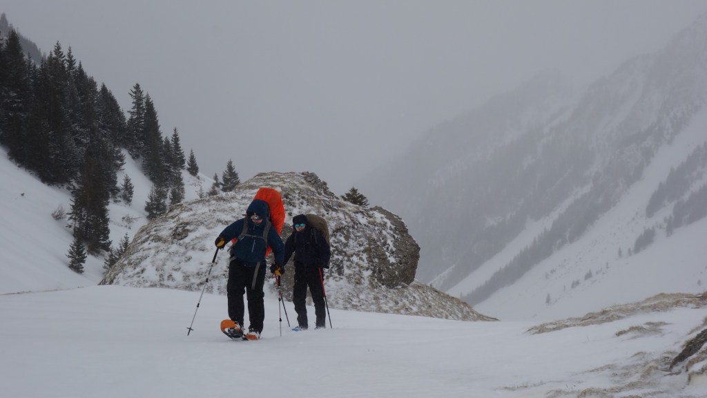 De eerste uren hebben we nog wat beschutting van het naaldwoud, daarna zijn we onderworpen aan wind en sneeuw. De ongemarkeerde toerskiroute, die met een blauwe lijn op de stafkaart is aangeduid, was onze eerste optie, maar gezien de autoweg goed verijsd is en dus minder lawinegevaarlijk dan verwacht, lijkt dit met sneeuwschoenen de meest comfortabele weg om te volgen. Meestal dan toch, want er blijken enkele passages waar de weg zo ingesneeuwd is dat ik met heel wat moeite een spoor moet maken langs een steile flank. Iedereen volgt gedwee, en dat met voldoende tussenafstand, om het risico te verlagen dat een lawine vertrekt en dat we er met z’n allen onder liggen.