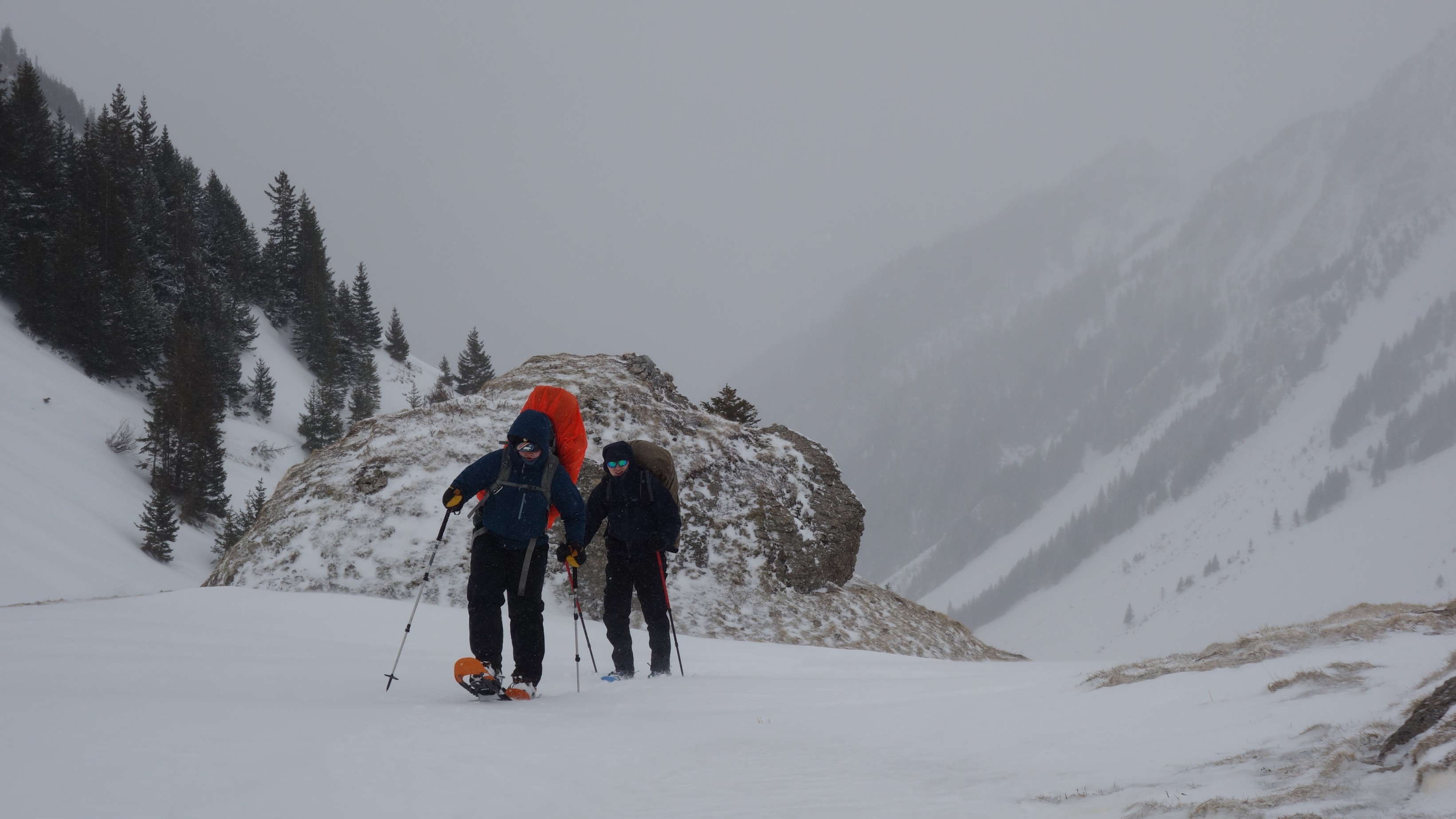 De sneeuw valt met bakken uit de lucht, zoals voorspeld. Regenbroek- en jas gaan dus aan. Daaronder houden we het op één basislaag want met zo’n zware rugzak is het al snel zweten, en dan dreigt je isolatielaag nat en onbruikbaar te worden. Zeker bij het bivakkeren een aandachtspunt want kledij krijg je door de koude temperaturen vaak niet meer droog.