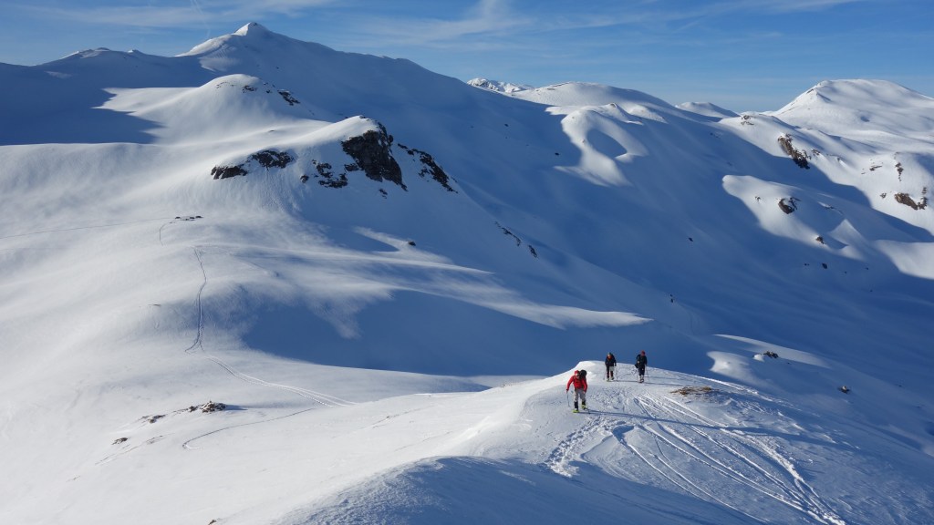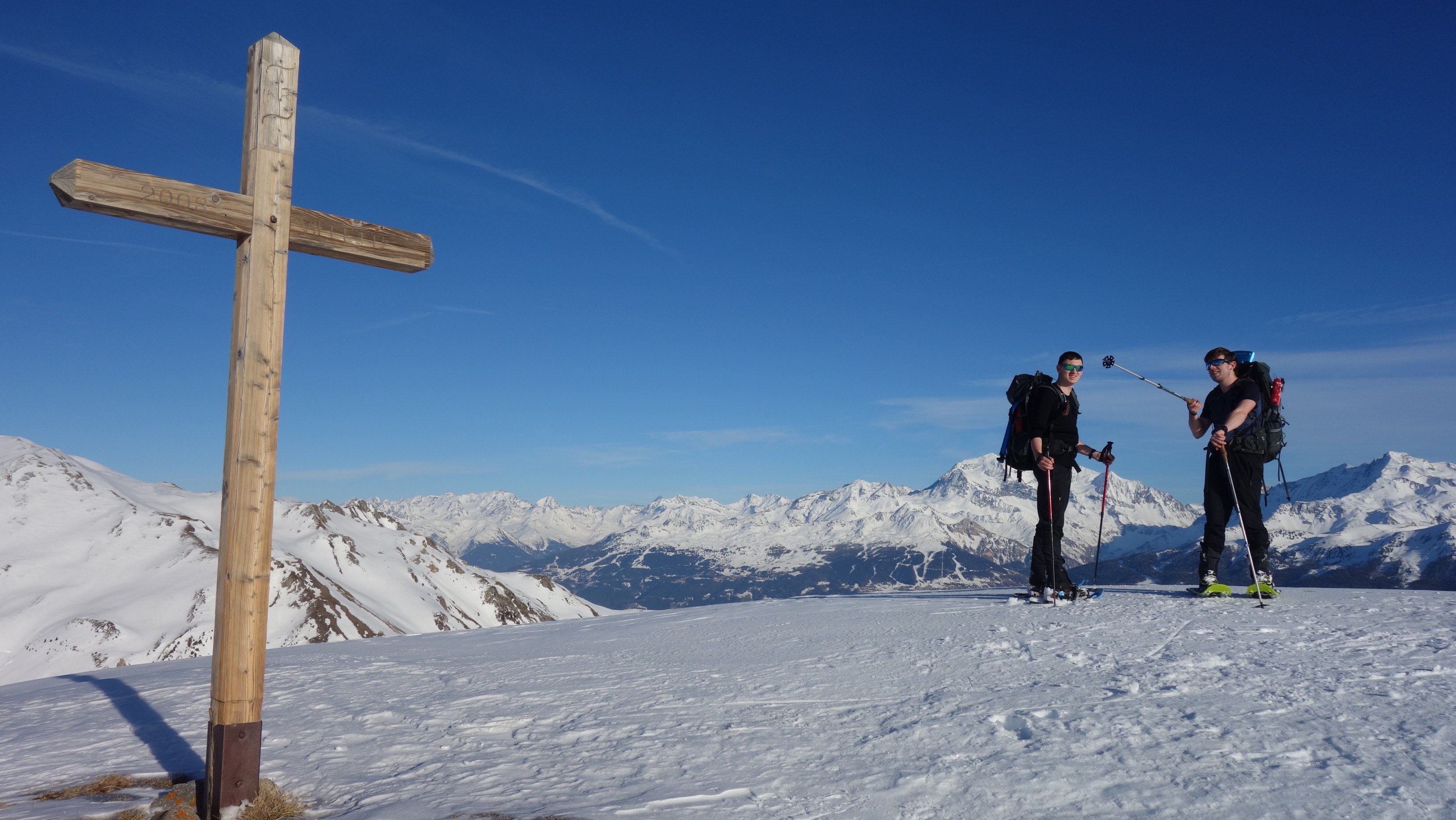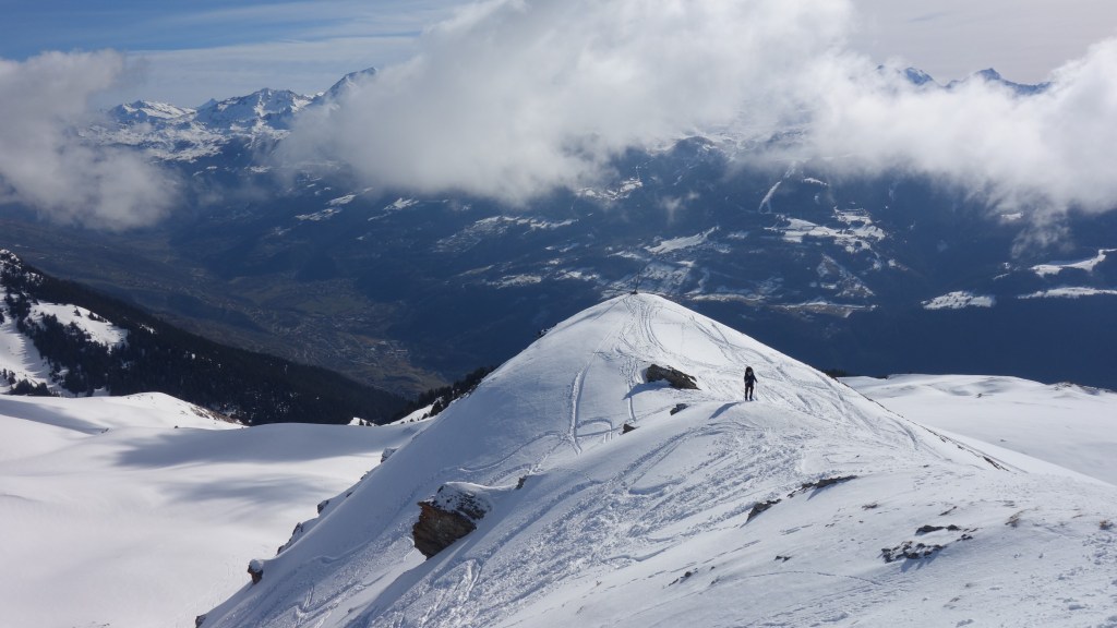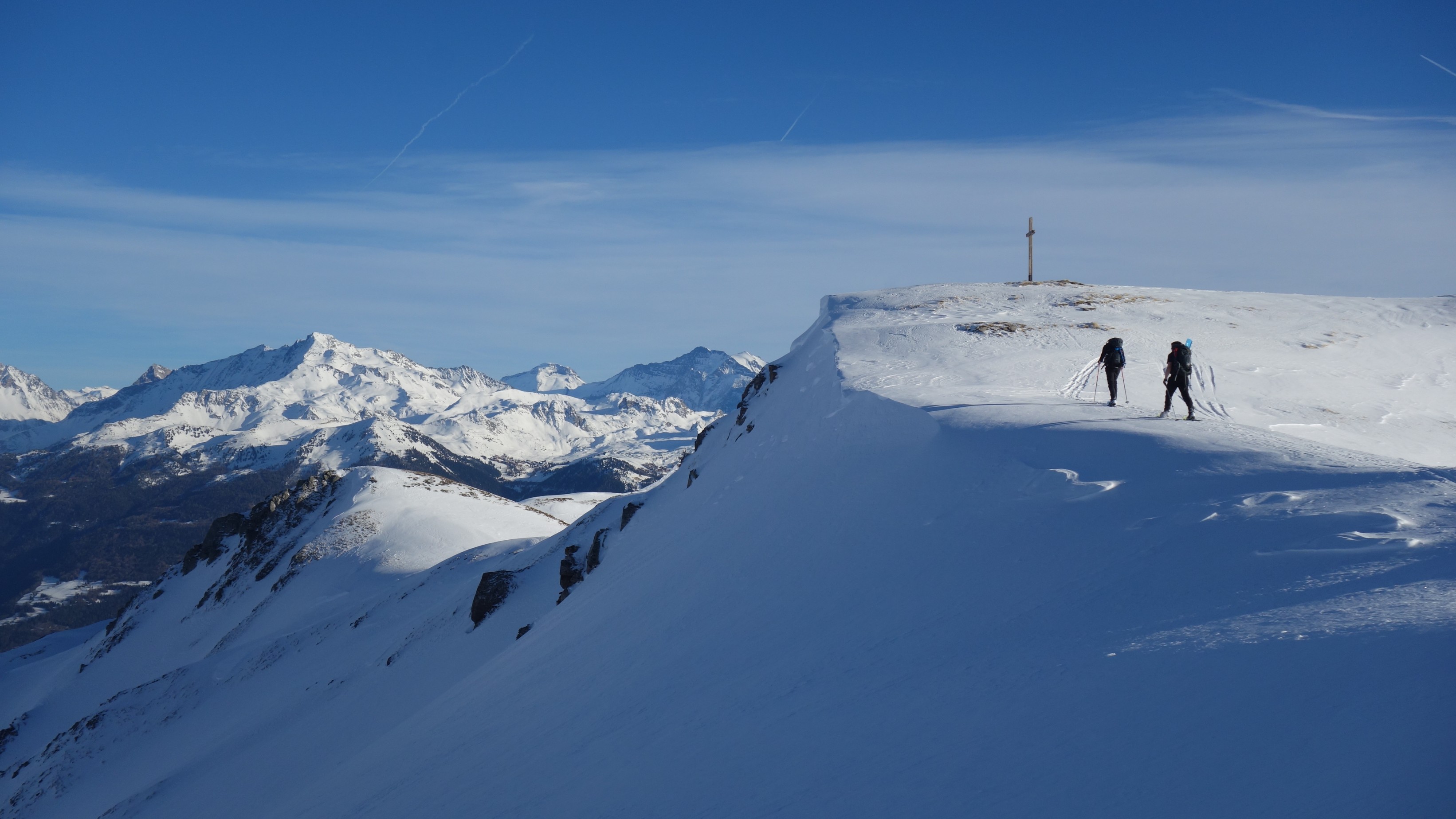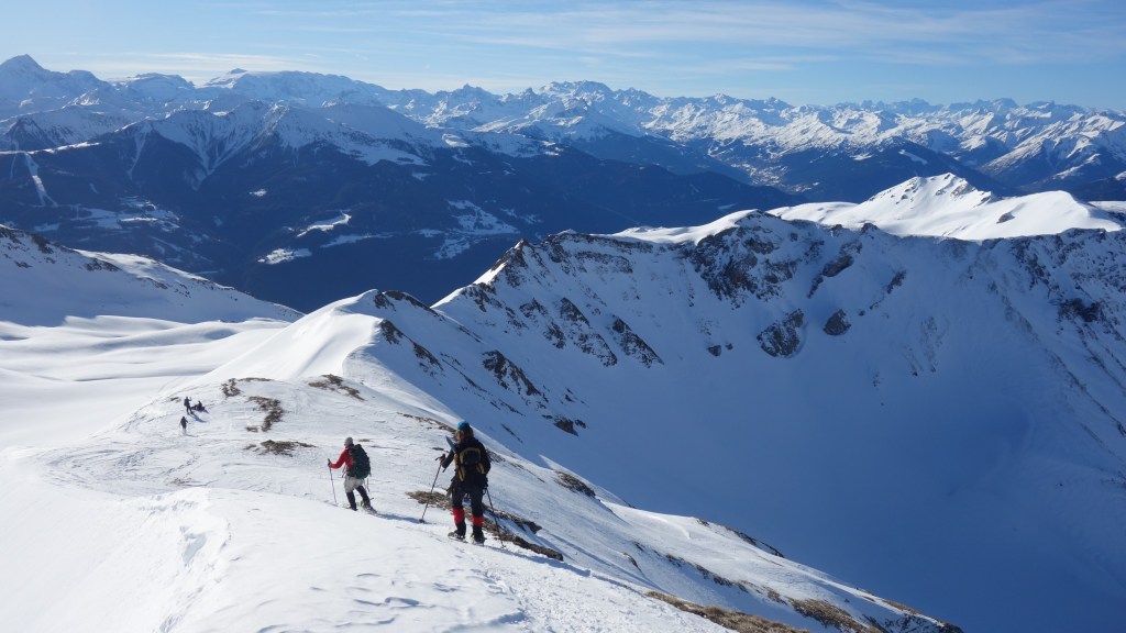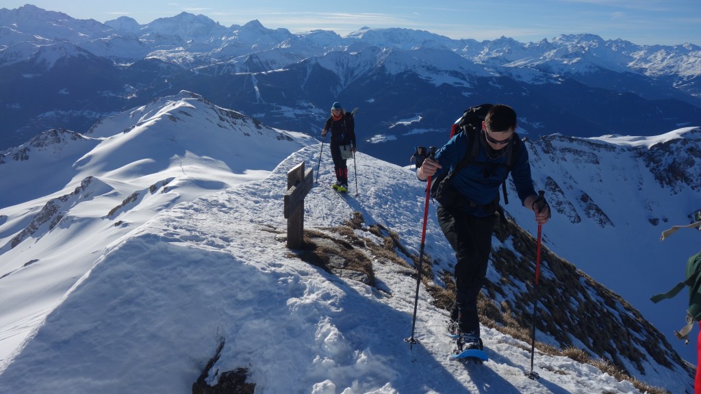 Alvorens de afdaling in te zetten, gaan we voor onze laatste bergtop: Pointe du Dzjonfié. We hadden hem al van de andere kant mogen aanschouwen, en nu kunnen we eindelijk op de top gaan staan. De laatste tientallen meters gaan over een nauwe en wat verijsde bergrug maar de sneeuwschoenen hebben voldoende grip. Het Mont Blanc-massief staat nog wat prominenter aan de horizon te pronken.