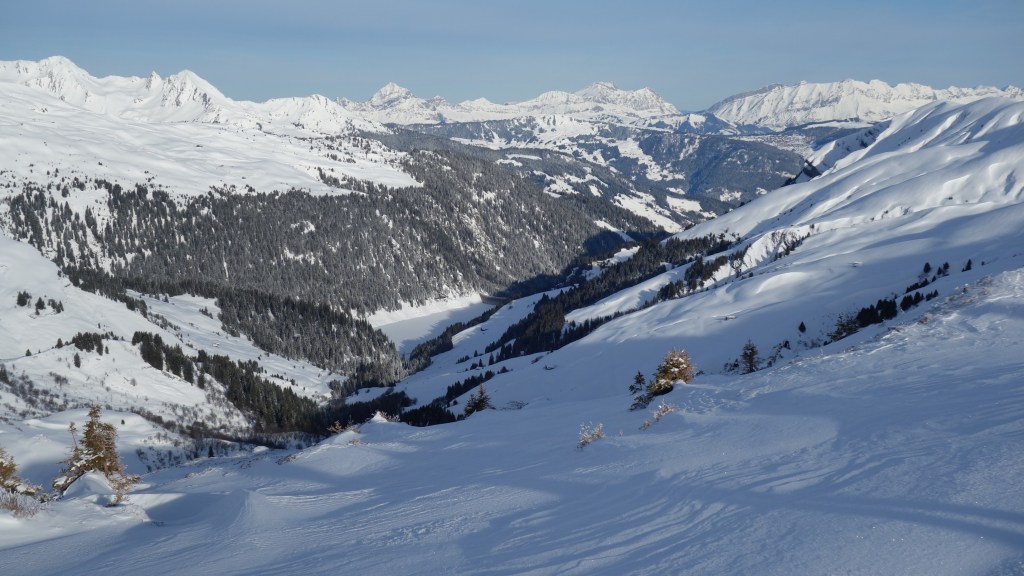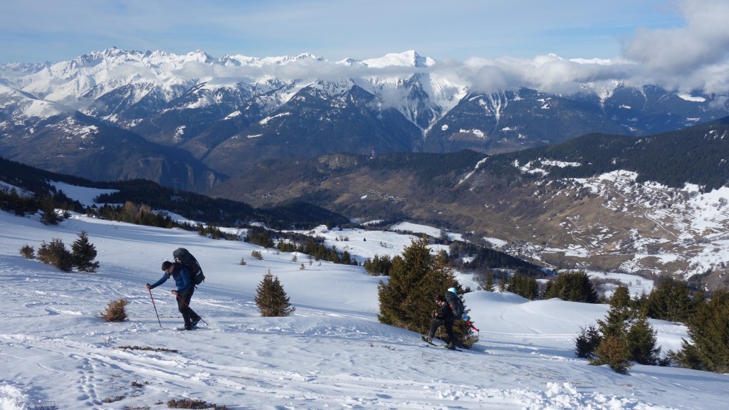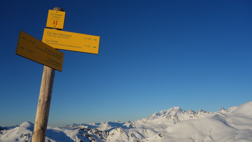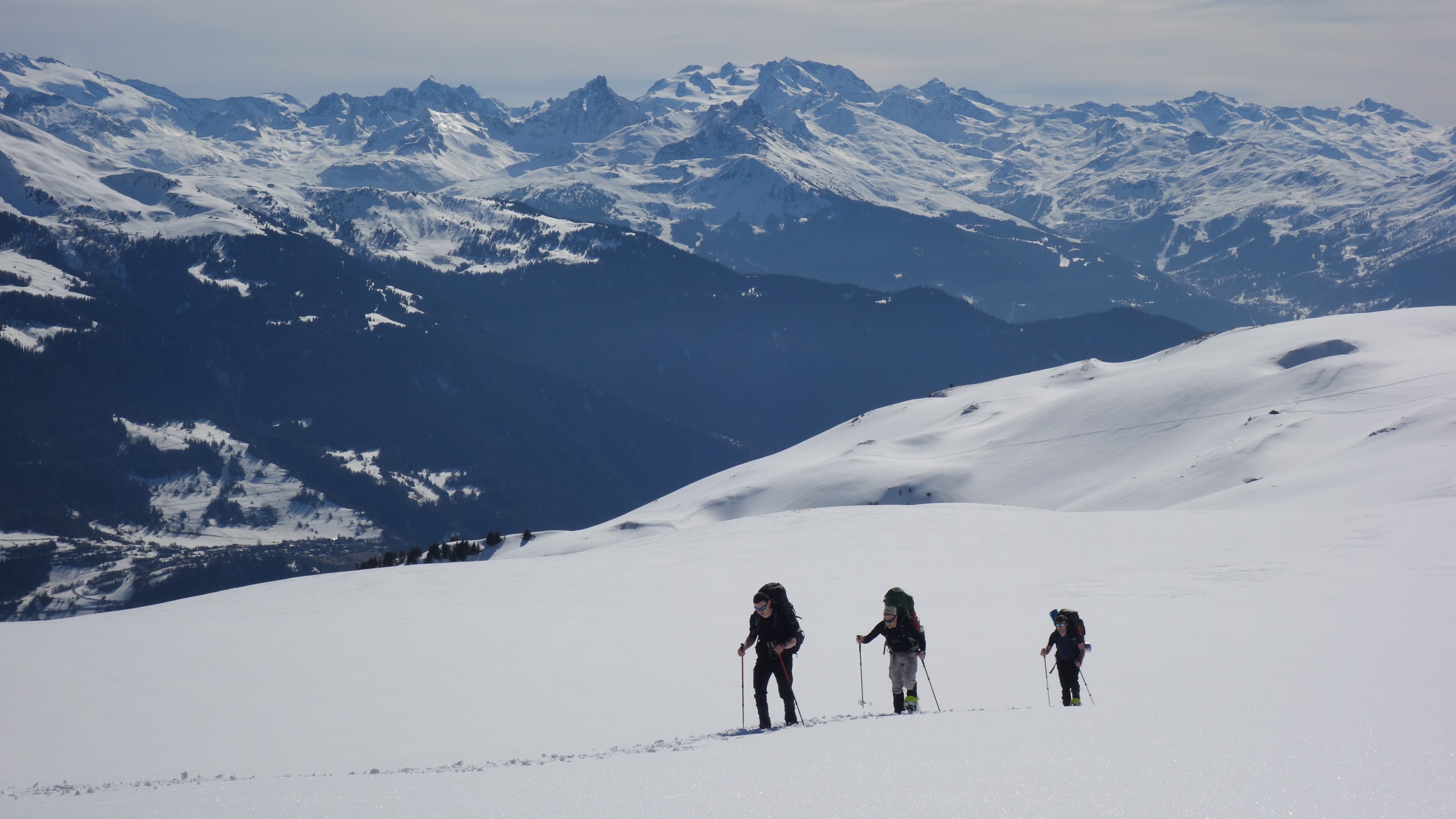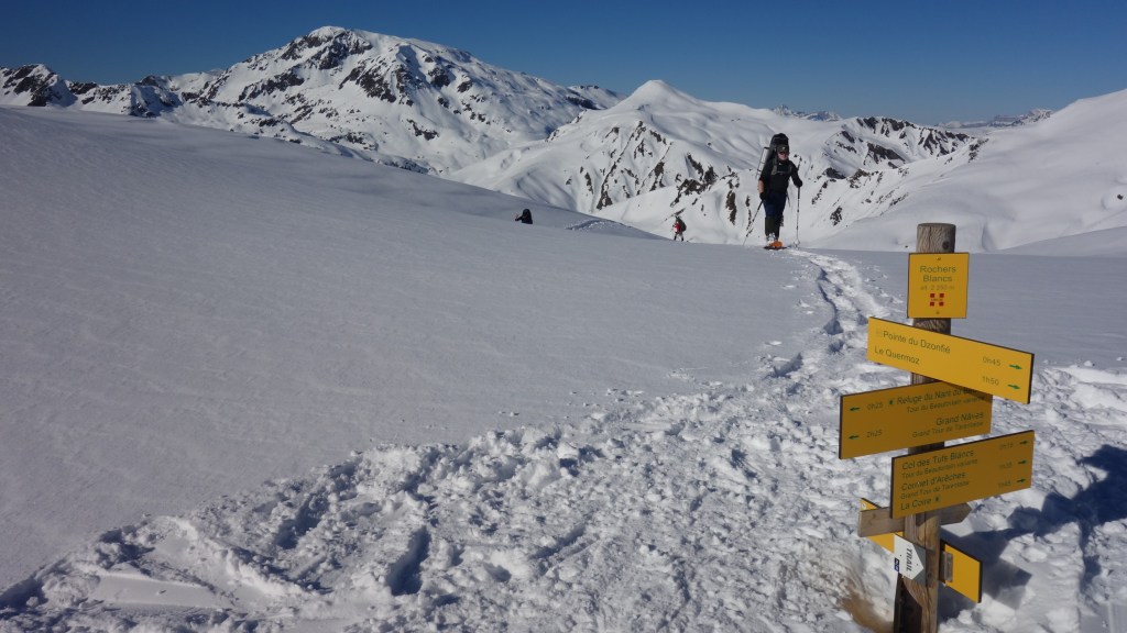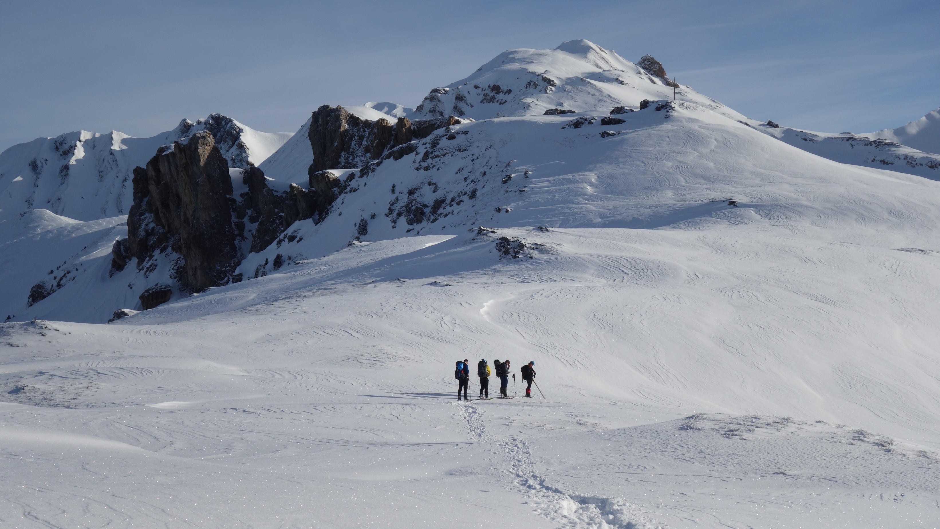 Alvorens de afdaling in te zetten, gaan we voor onze laatste bergtop: Pointe du Dzjonfié. We hadden hem al van de andere kant mogen aanschouwen, en nu kunnen we eindelijk op de top gaan staan. De laatste tientallen meters gaan over een nauwe en wat verijsde bergrug maar de sneeuwschoenen hebben voldoende grip. Het Mont Blanc-massief staat nog wat prominenter aan de horizon te pronken.