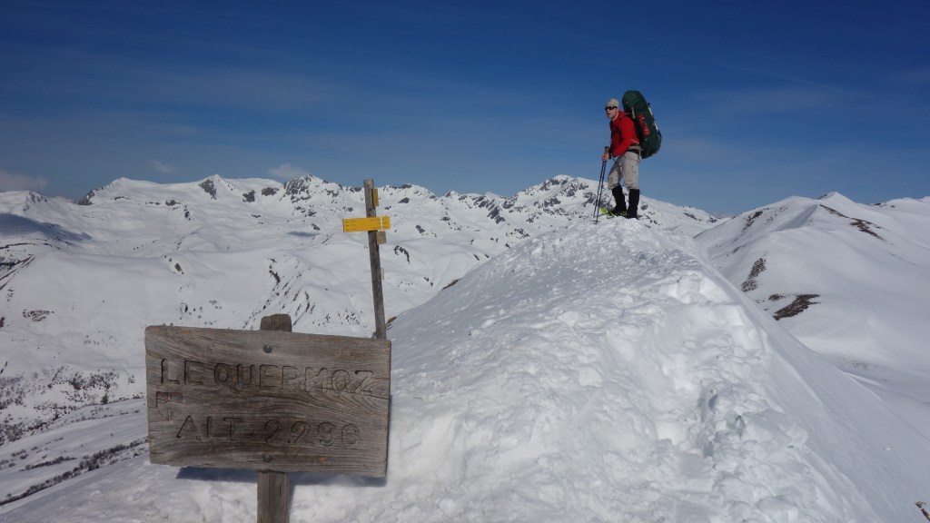 We staan op onder ‘Le Grand Beau’. Met een lichte rugzak klimmen we via de bergrug omhoog naar Croix du Berger, een bergtop ten noorden van de hut, en met een zicht op de winterse bergen en Lac du St Guérin. Zon, schaduw en sneeuw leveren prachtige beelden op!