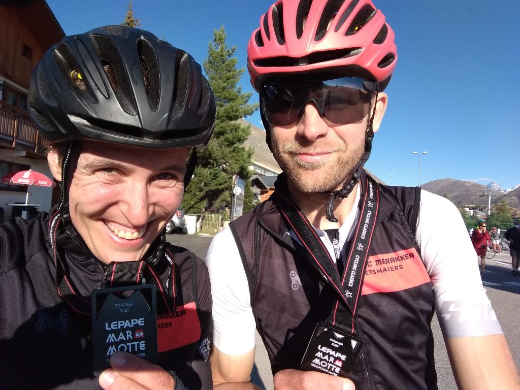 In de bijna vlakke bochten drink ik wat bij en schakel ik een tandje hoger. Het terugschakelen loopt steeds stroever. Door bijna continu op mijn kleinste versnelling te rijden, zit er geen olie meer op het tandwiel denk ik. Mijn lijf begint stilaan wat meer pijn te doen, maar de aankomst lonkt. Volk langs de weg die aan het applaudisseren is. Als ik de laatste rechte lijn inzet, word ik zelfs een beetje emotioneel. Ivo staat me aan de meet op te wachten. Ik bol met een officiële tijd van 8u55 over de meet (excl. neutralisatie van de Glandon), en dat binnen de tijdslimiet van 9u27 voor alle vrouwen van 18 tot 39 jaar. Hij deed er 1u20 sneller over, mijn kampioen!