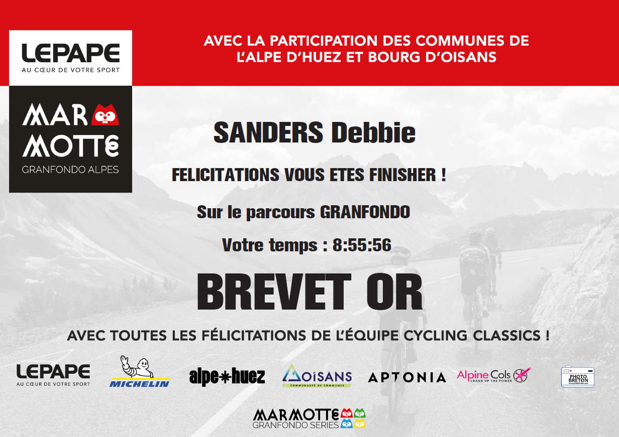 In de bijna vlakke bochten drink ik wat bij en schakel ik een tandje hoger. Het terugschakelen loopt steeds stroever. Door bijna continu op mijn kleinste versnelling te rijden, zit er geen olie meer op het tandwiel denk ik. Mijn lijf begint stilaan wat meer pijn te doen, maar de aankomst lonkt. Volk langs de weg die aan het applaudisseren is. Als ik de laatste rechte lijn inzet, word ik zelfs een beetje emotioneel. Ivo staat me aan de meet op te wachten. Ik bol met een officiële tijd van 8u55 over de meet (excl. neutralisatie van de Glandon), en dat binnen de tijdslimiet van 9u27 voor alle vrouwen van 18 tot 39 jaar. Hij deed er 1u20 sneller over, mijn kampioen!