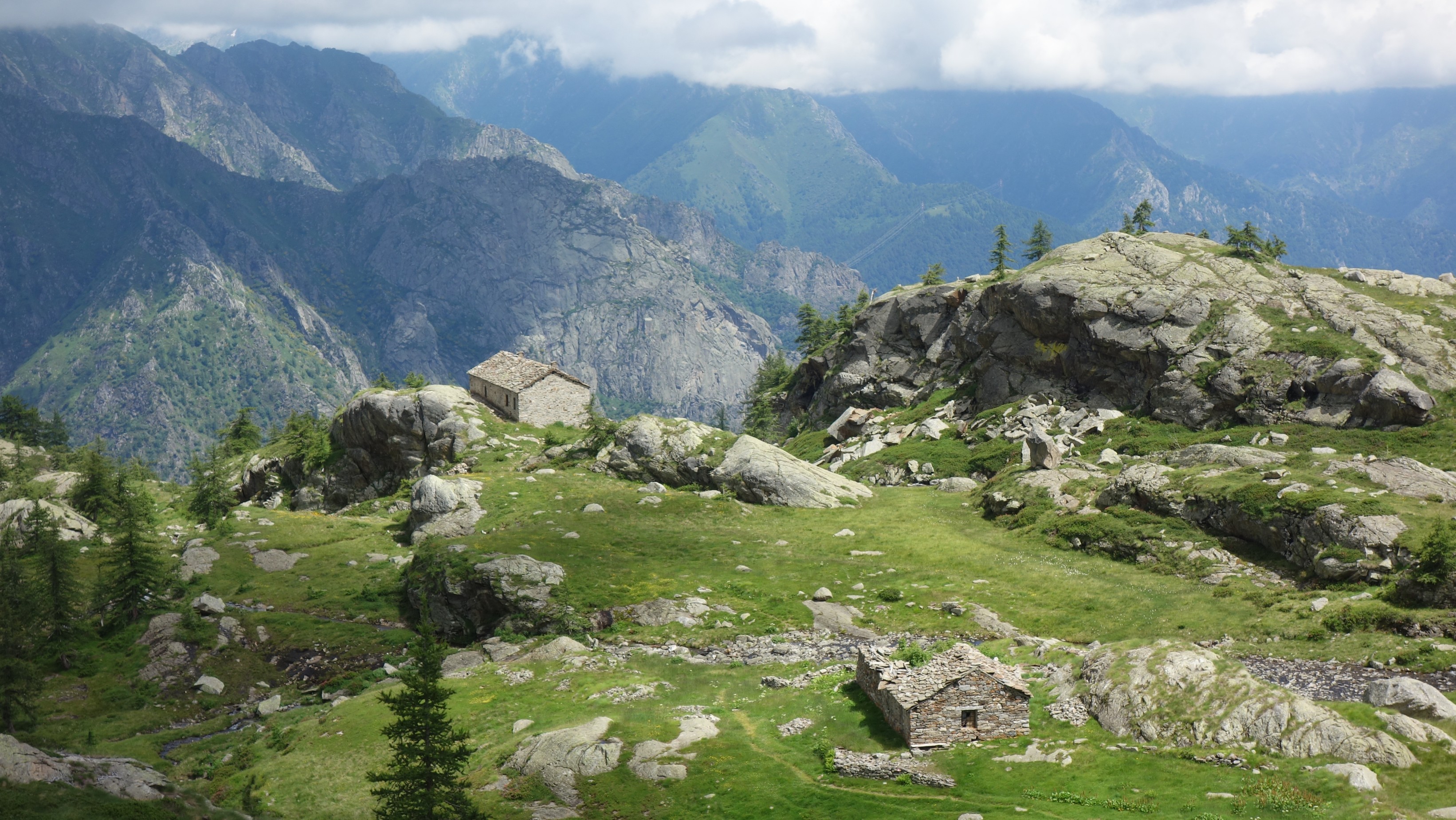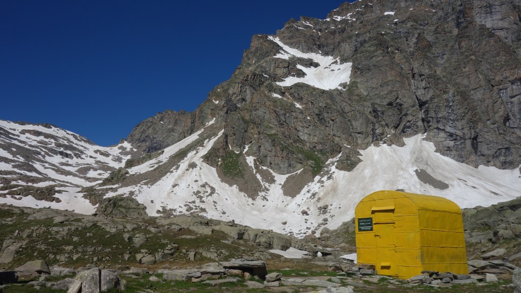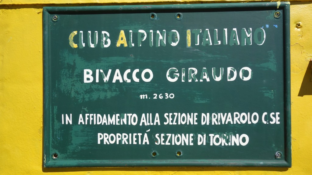Bivacco Giraudo is een geel geverfd blikken bivakhutje temidden een impressionant keteldal. Drieduizenders liggen als een hoefijzer rond ons heen. Watervallen storten zich van de steile rotsen. Vanaf het kleine plateau hebben we een open zicht zuidwaarts richting de Povlakte waar cumuluswolken zich terug aan het vormen zijn door de stijgende warme lucht. Voorlopig blijven ze ginder, de vraag is voor hoe lang nog.