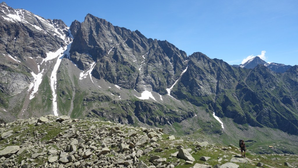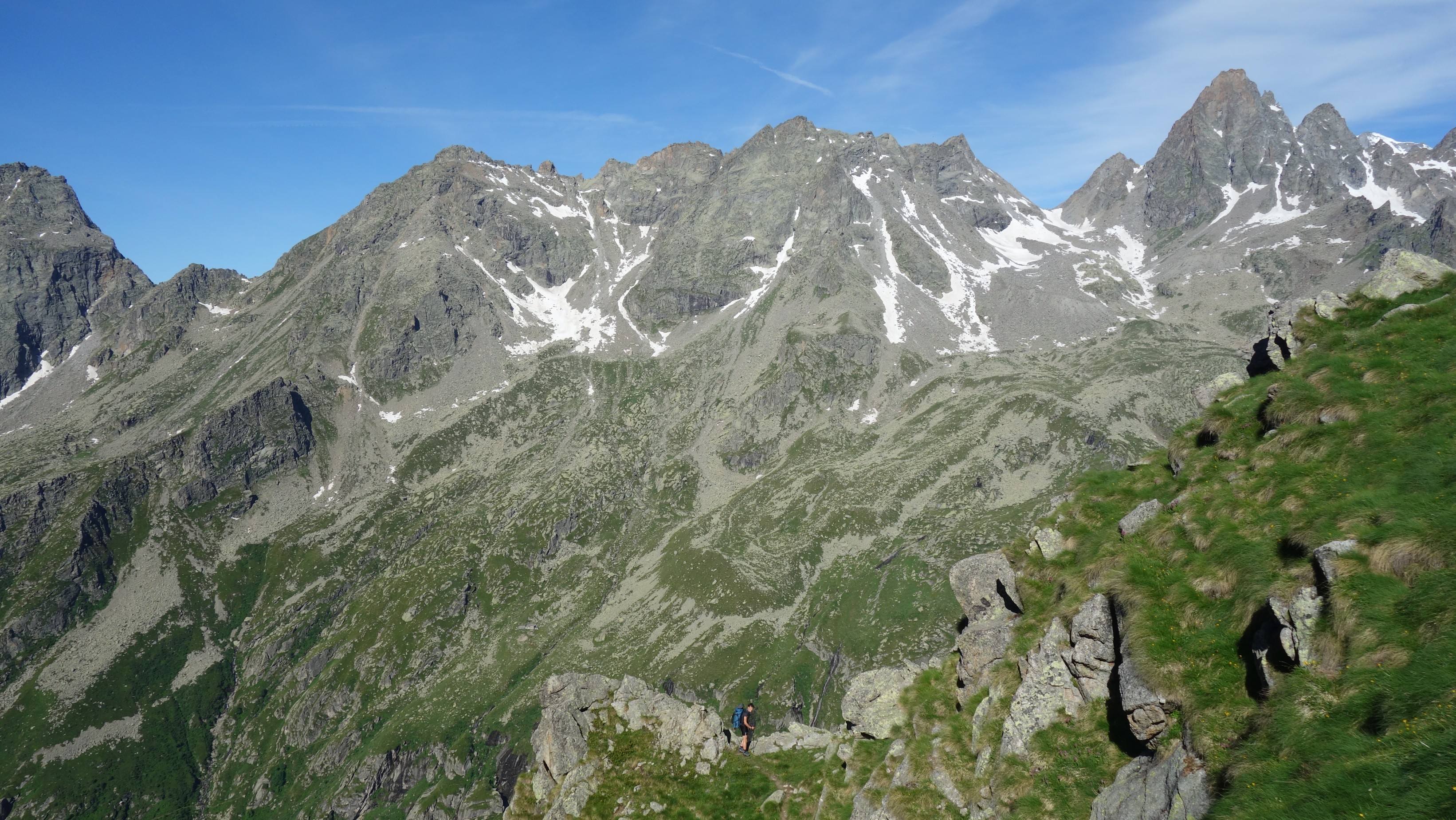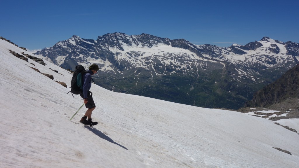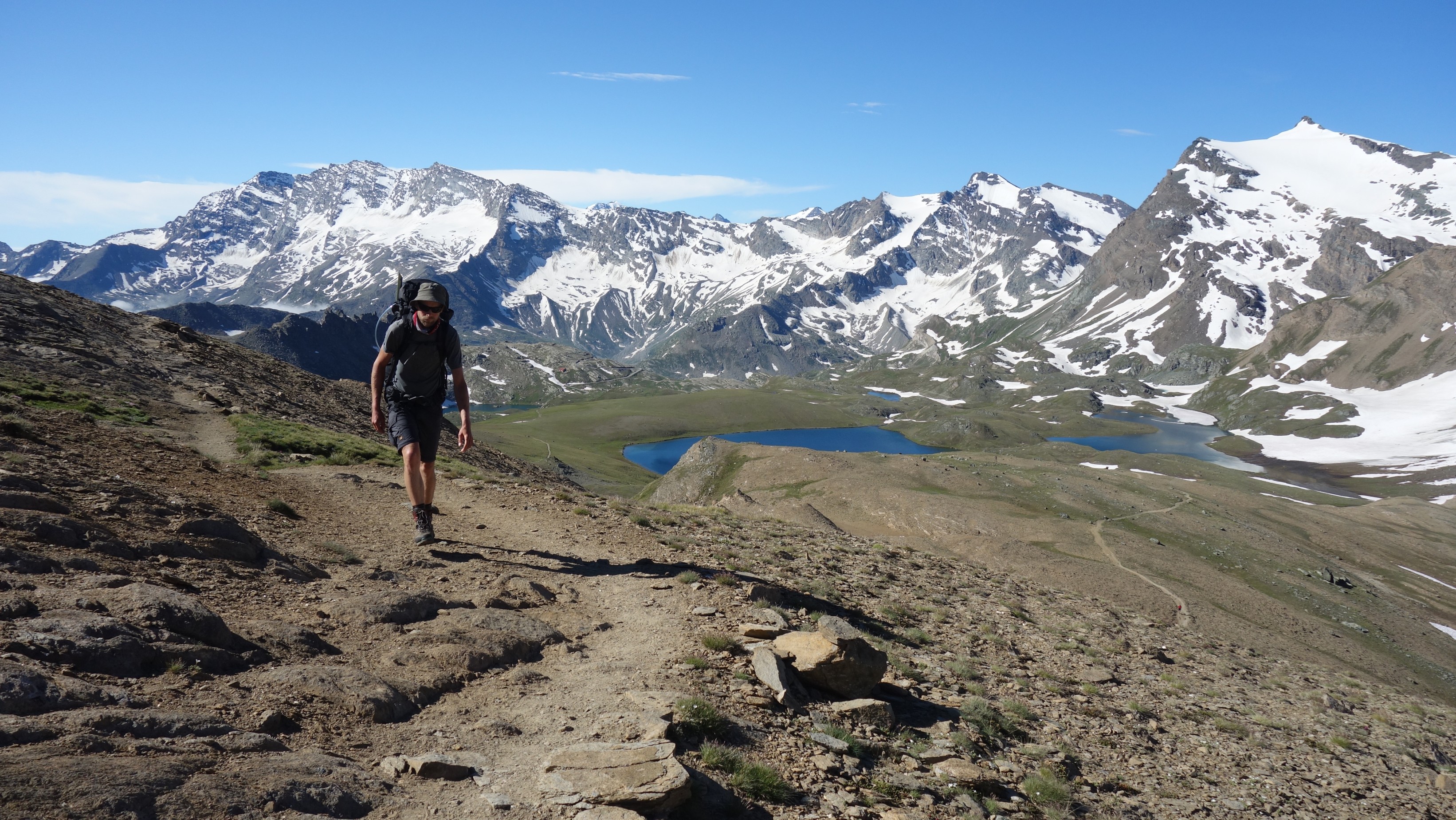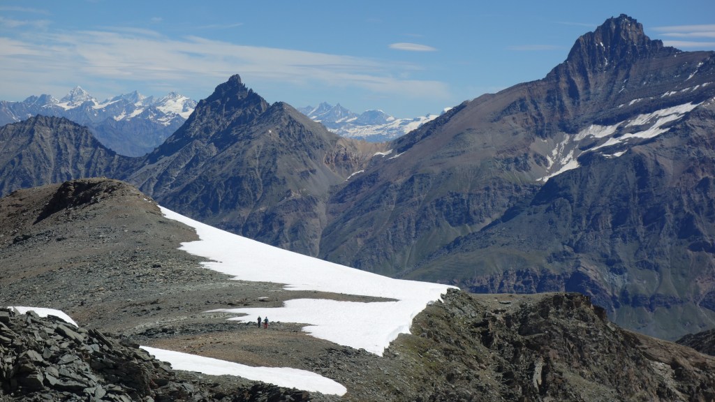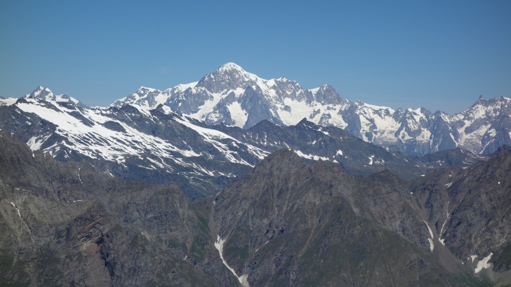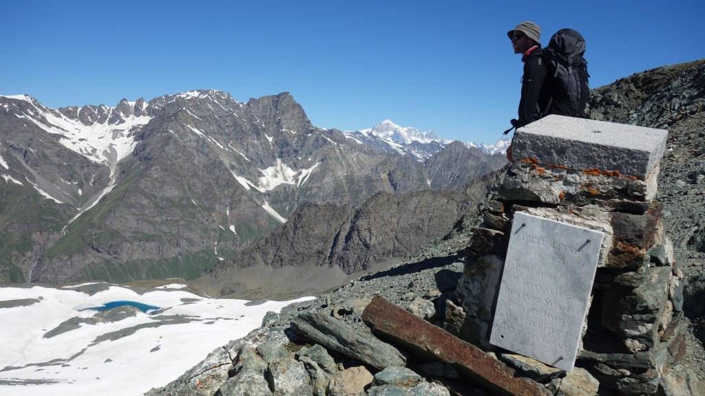 Oostwaarts pronkt de Gran Paradiso die tot 4.061m reikt en best populair is bij alpinisten. Westelijk zien we het ganse Mont Blanc-massief liggen met zijn gletsjers en steile rotswanden. Er staat geen vleugje wind en het is verleidelijk om een lange siësta te nemen, maar er staat nog een serieuze afdaling te wachten.