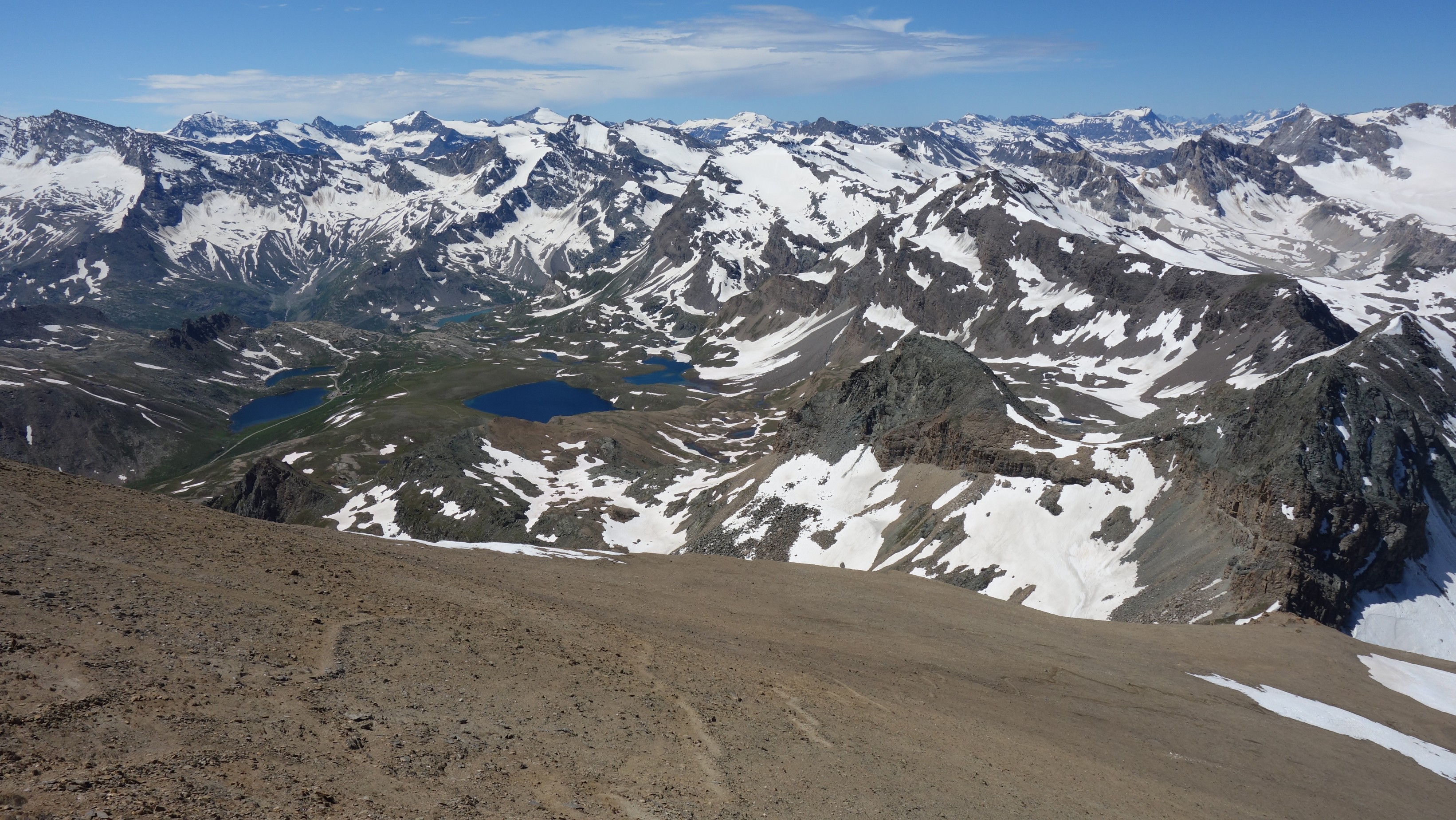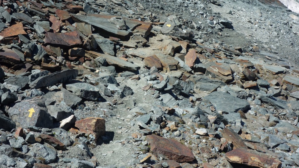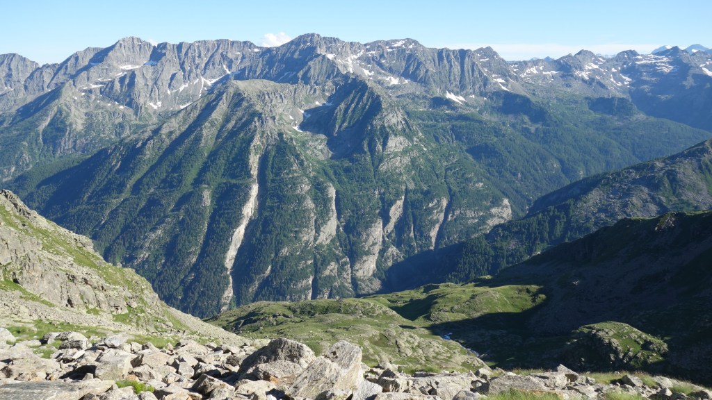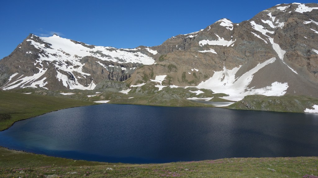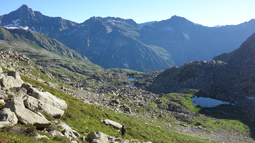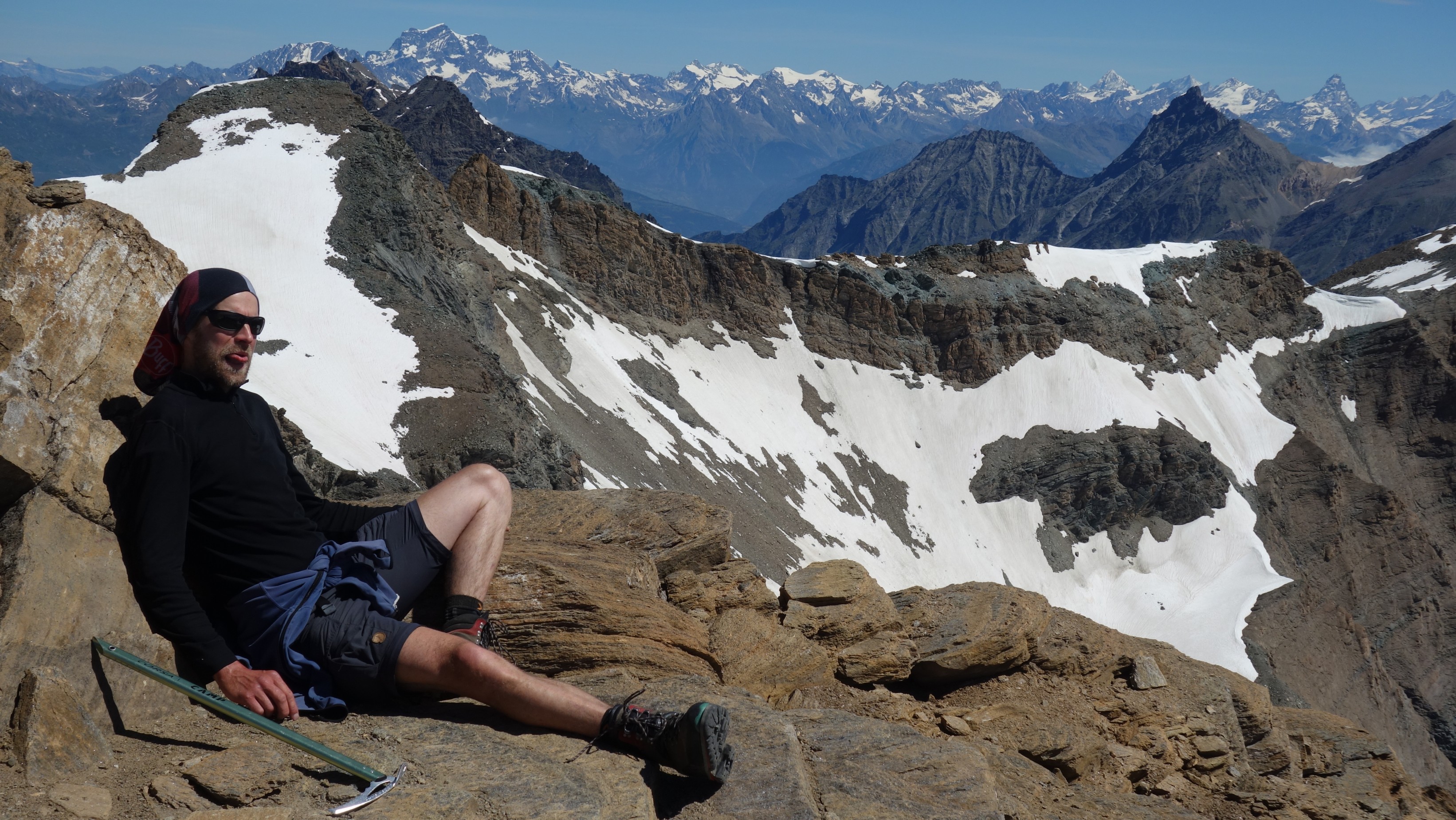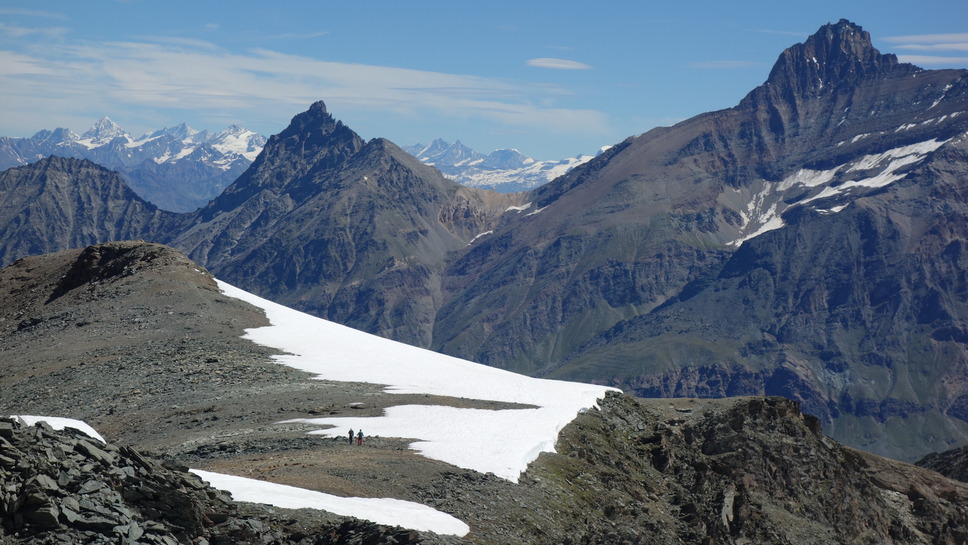 Oostwaarts pronkt de Gran Paradiso die tot 4.061m reikt en best populair is bij alpinisten. Westelijk zien we het ganse Mont Blanc-massief liggen met zijn gletsjers en steile rotswanden. Er staat geen vleugje wind en het is verleidelijk om een lange siësta te nemen, maar er staat nog een serieuze afdaling te wachten.