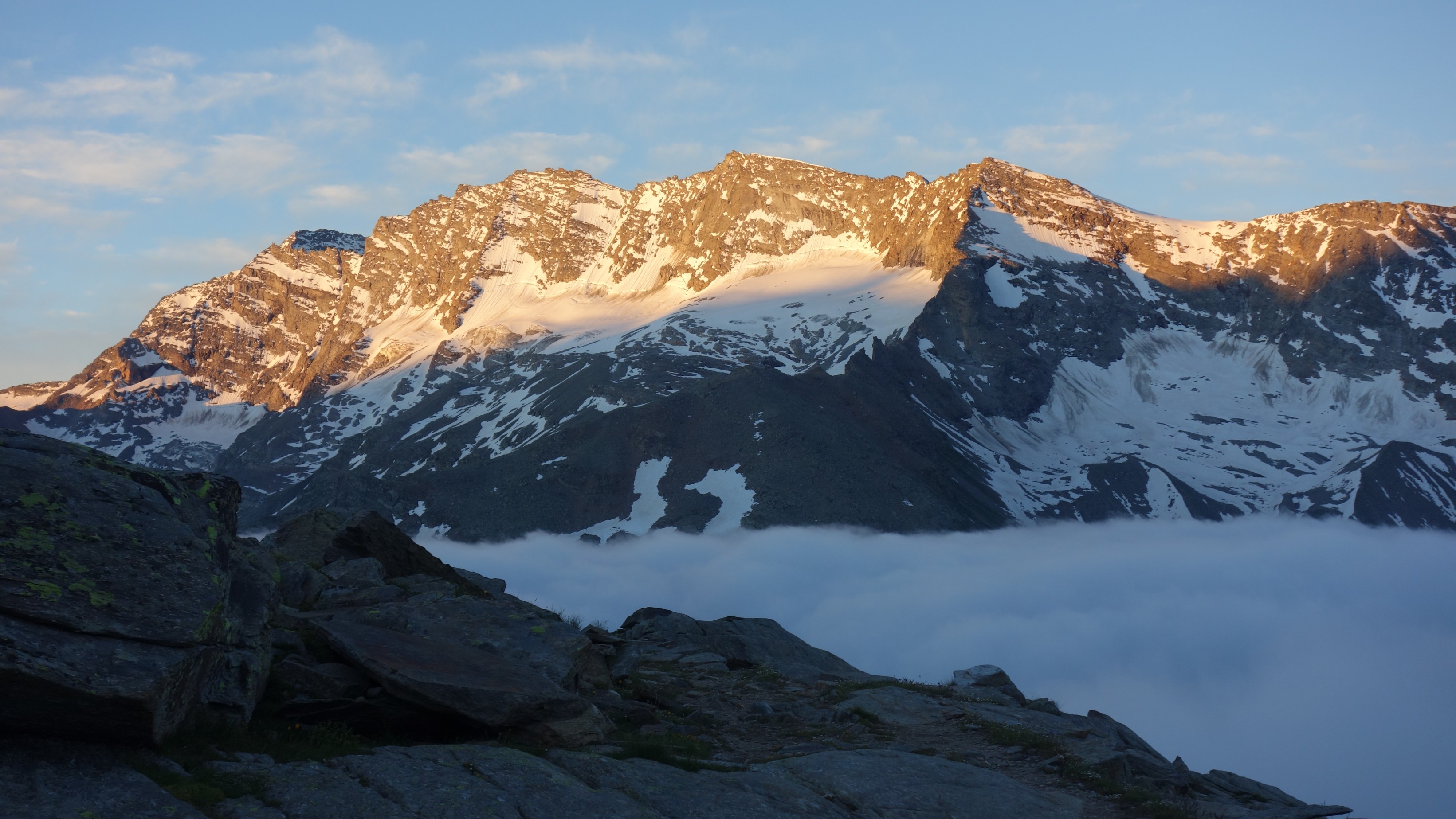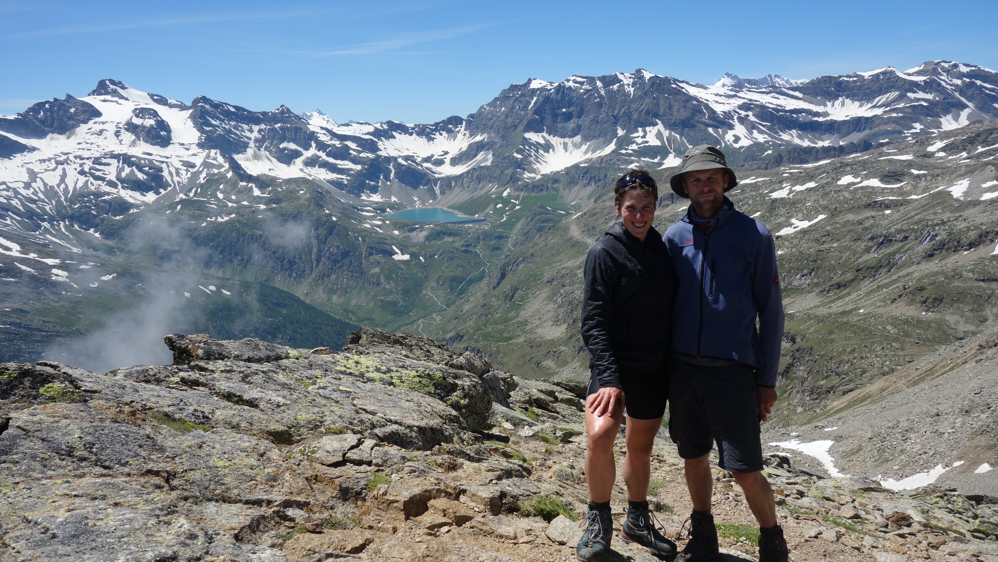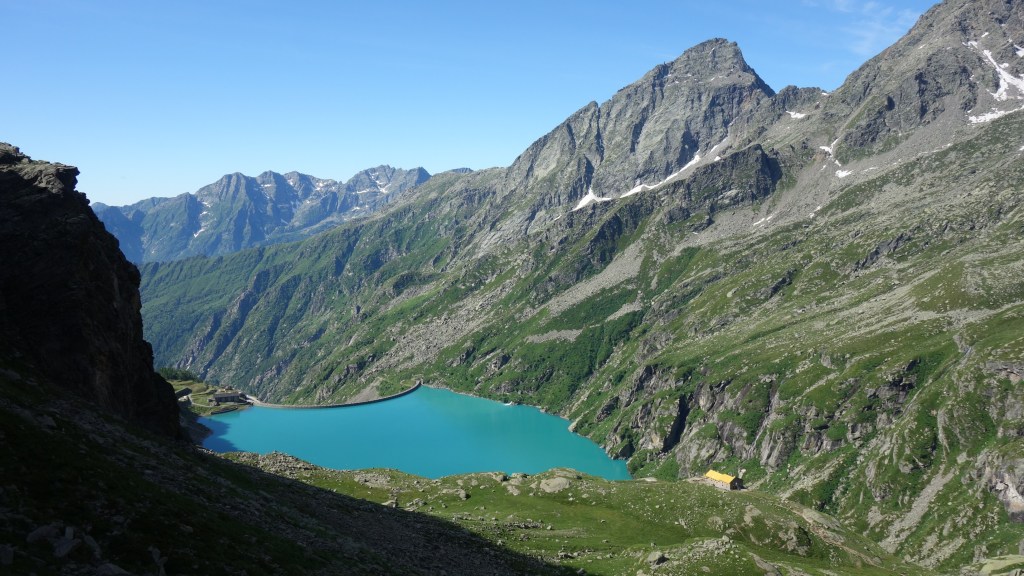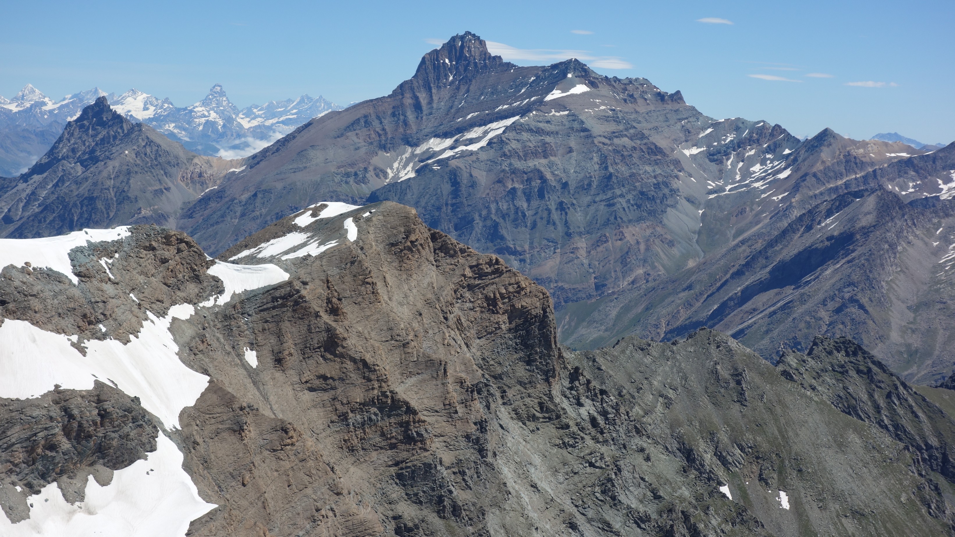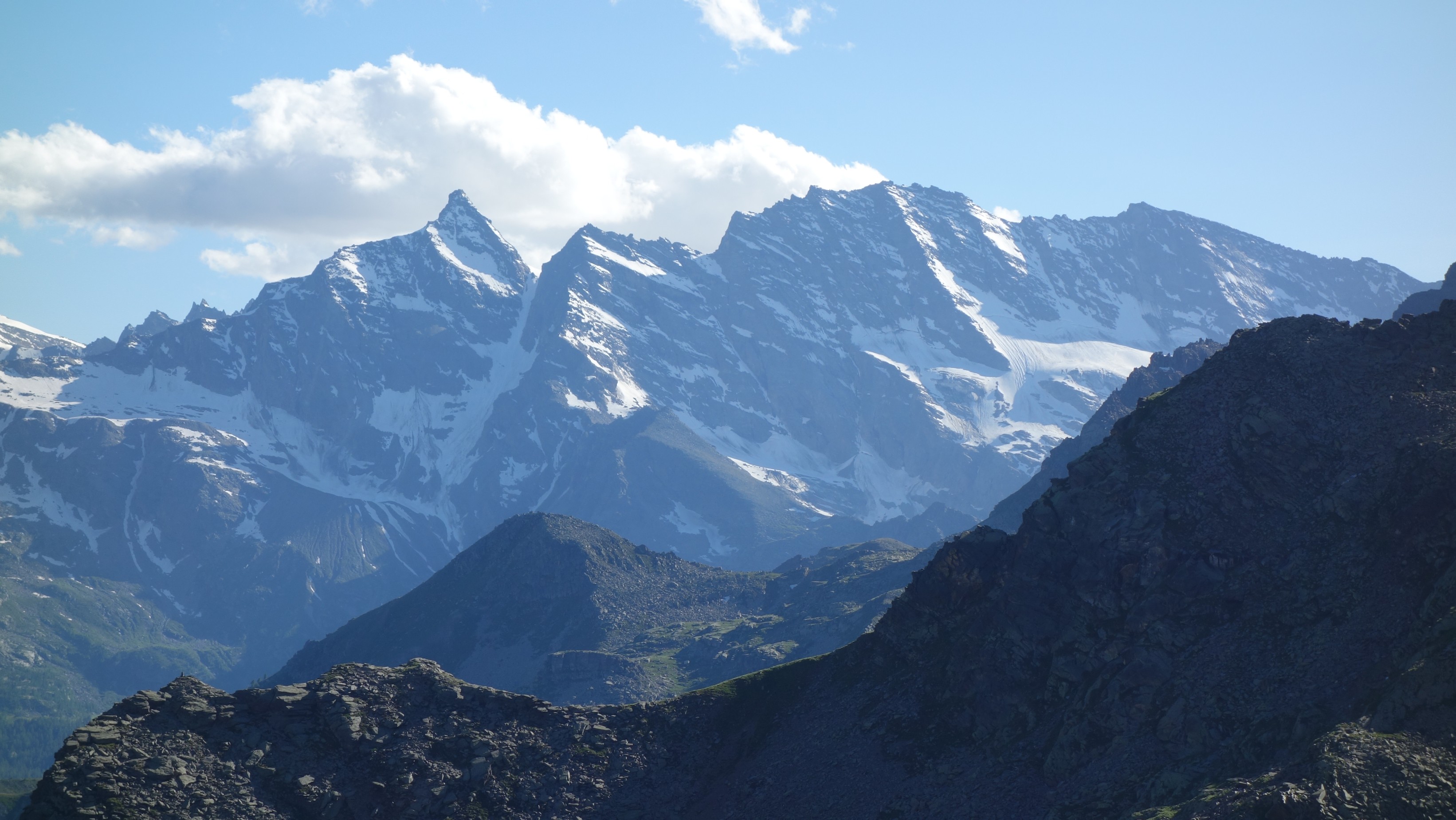 Oostwaarts pronkt de Gran Paradiso die tot 4.061m reikt en best populair is bij alpinisten. Westelijk zien we het ganse Mont Blanc-massief liggen met zijn gletsjers en steile rotswanden. Er staat geen vleugje wind en het is verleidelijk om een lange siësta te nemen, maar er staat nog een serieuze afdaling te wachten.