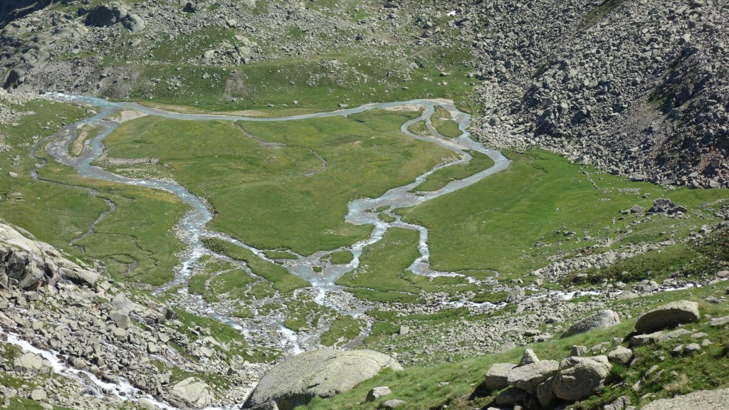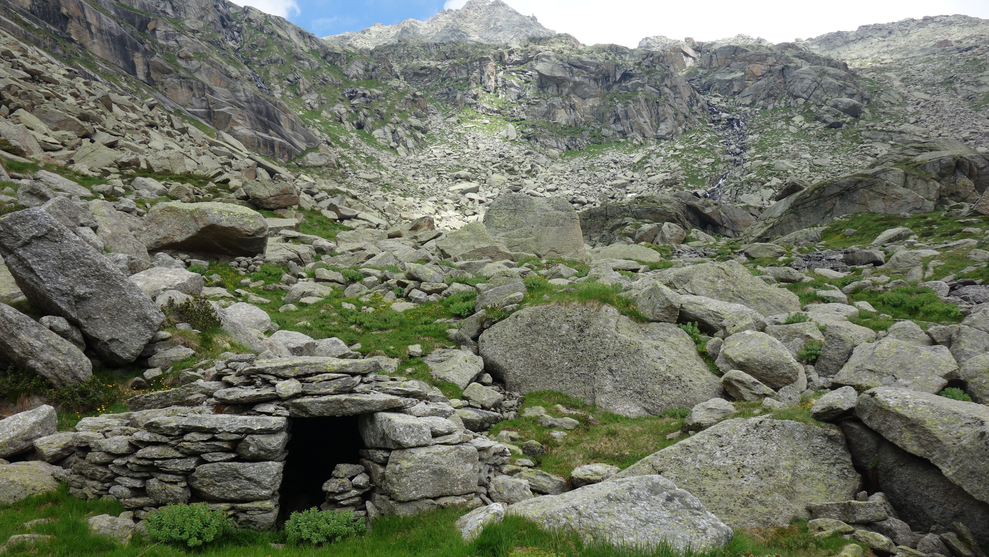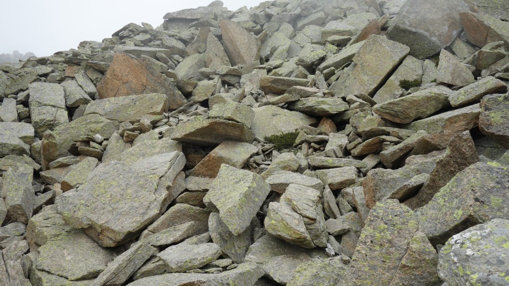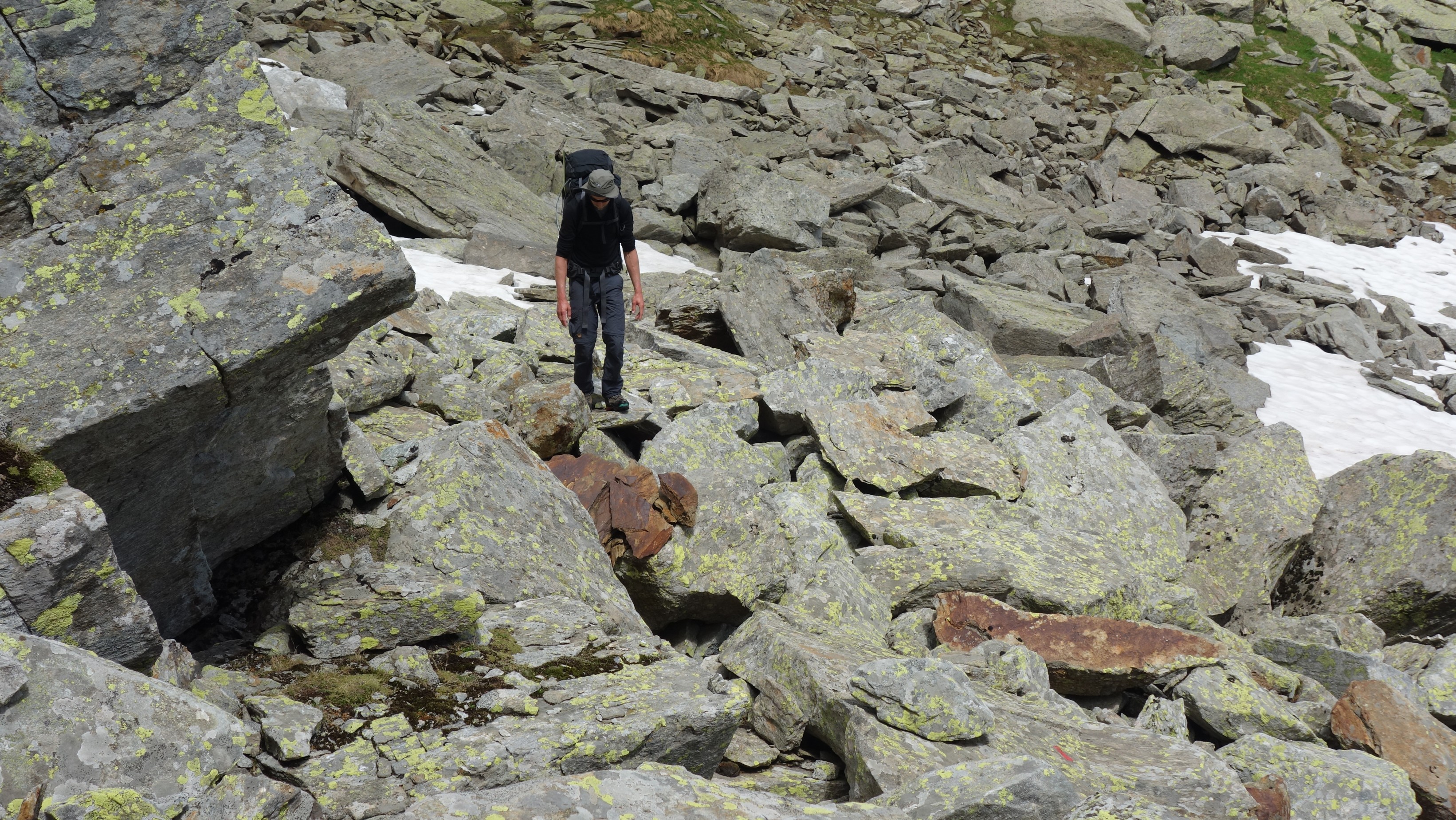 Vanaf nu zijn we op onze eigen ervaring aangewezen om ons een weg te zoeken naar Passio dell’Alpuggio. Op de kaart lijkt de steiltegraad mee te vallen maar het terrein is best chaotisch. We banen ons een weg langs gigantische rotsplaten, gladgepolijst door verdwenen gletsjers. Af en toe springen we eens een riviertje over. Daarna zijn het blokken, blokken en nog eens blokken op weg naar de pas.