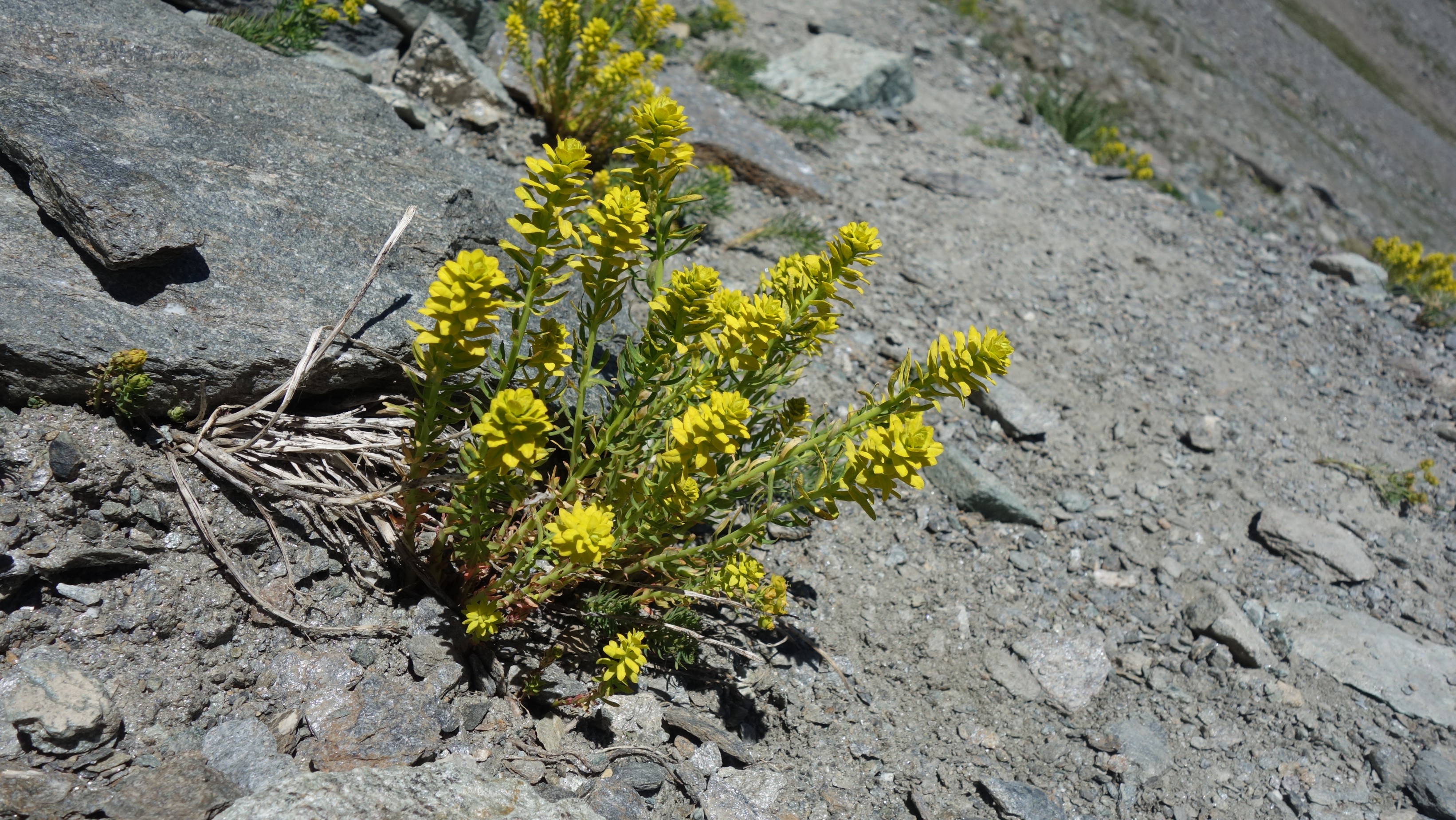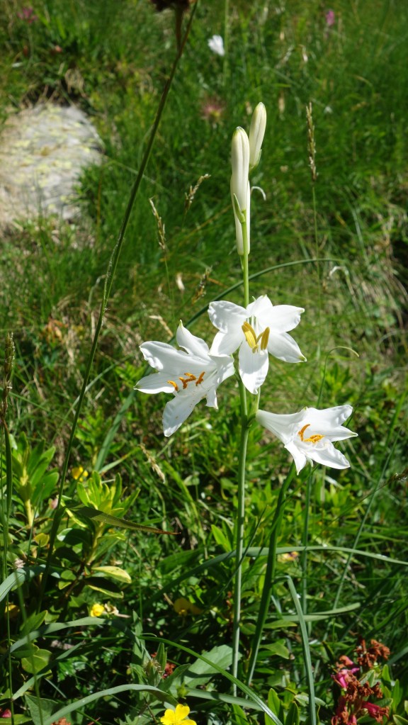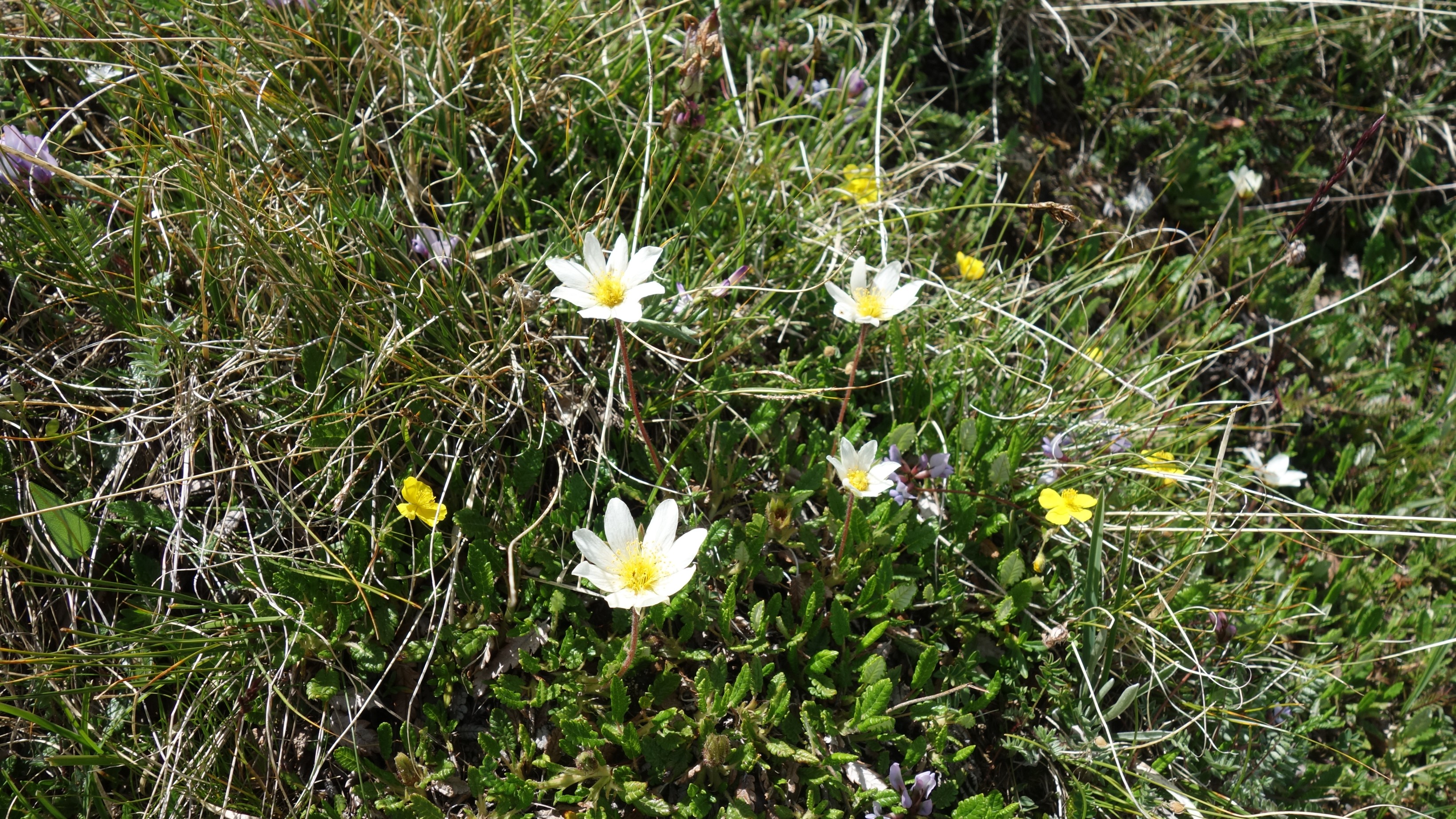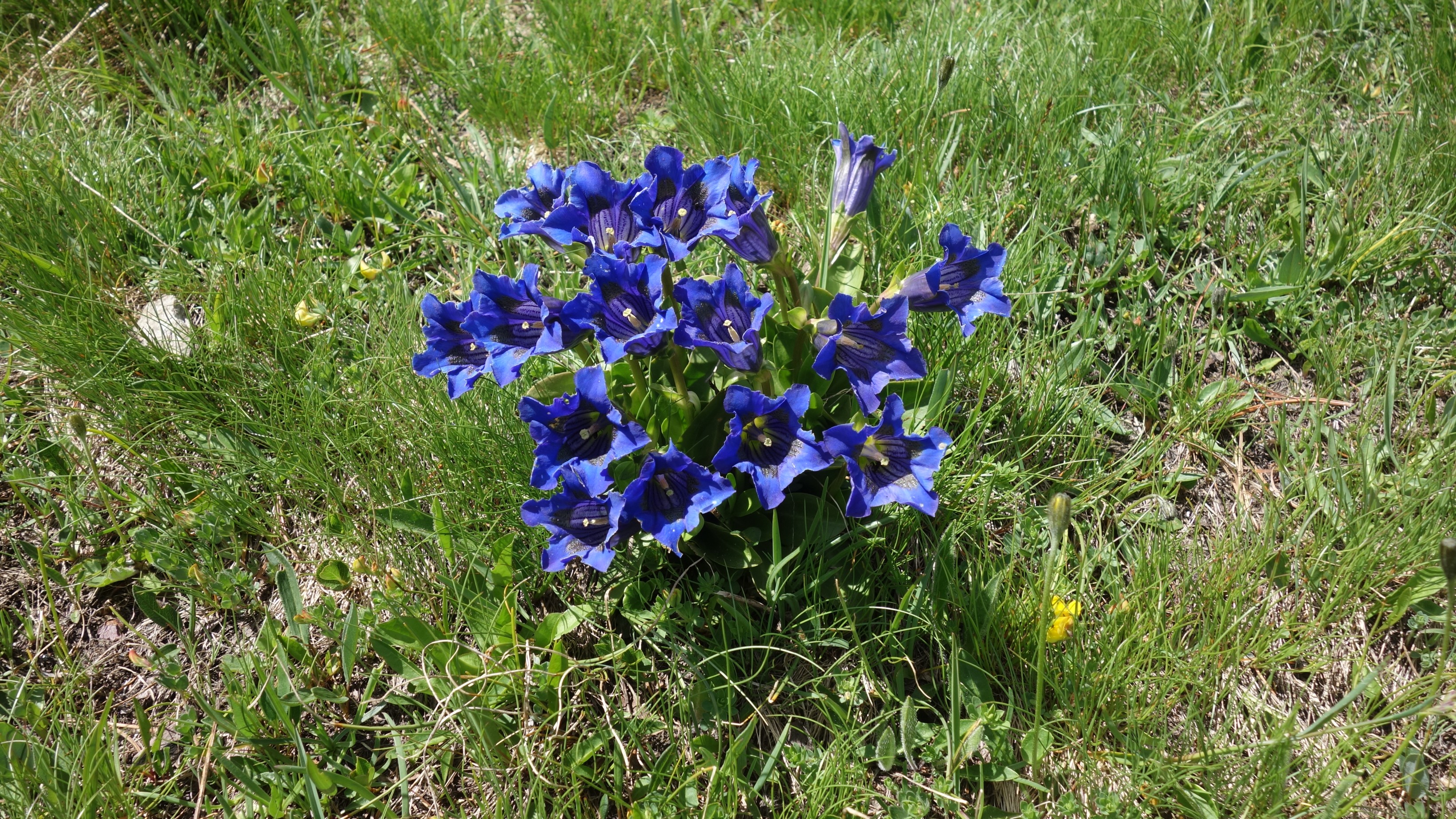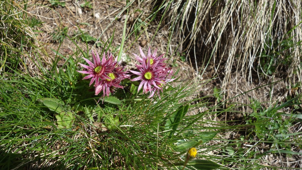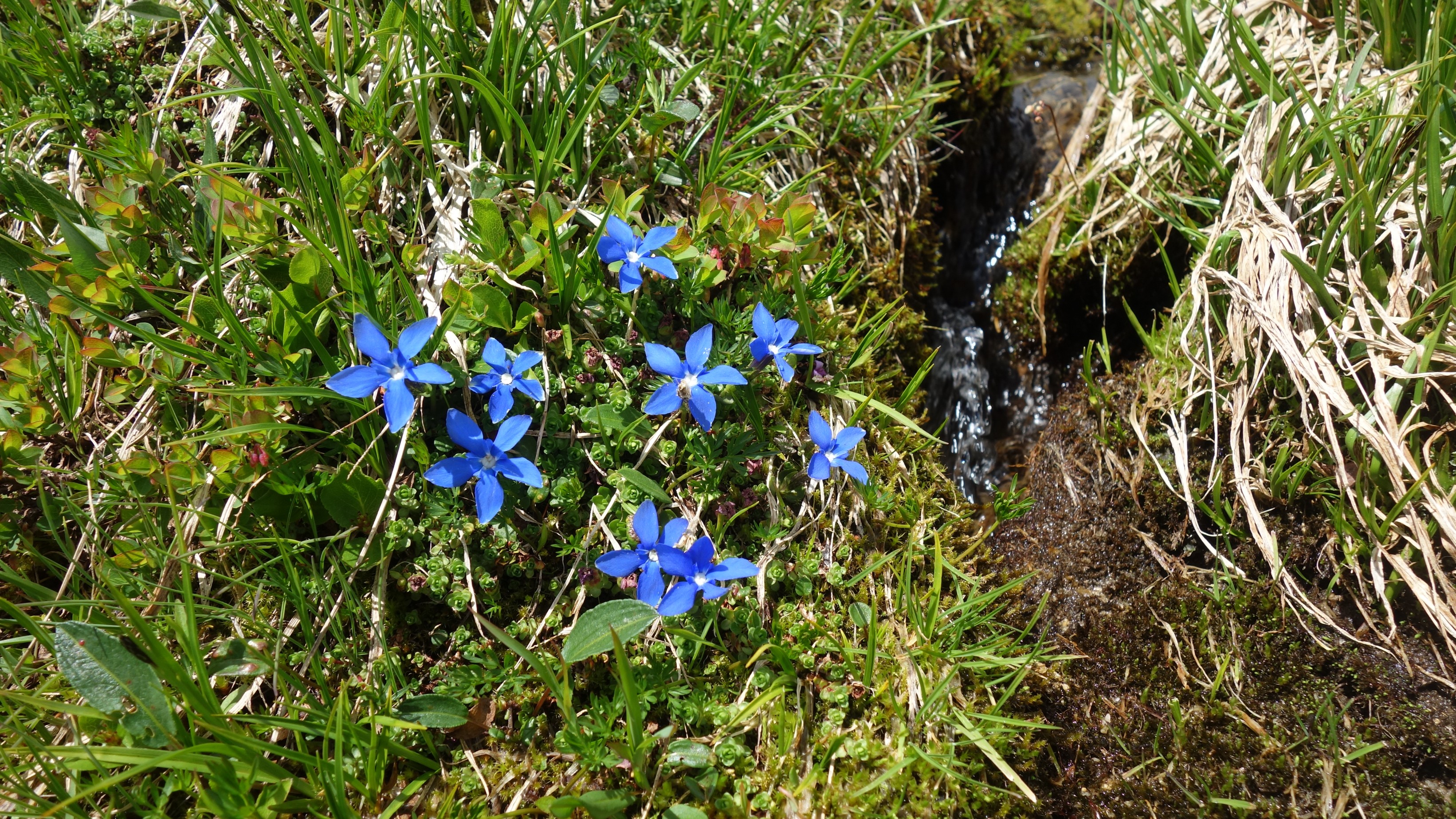 Gezien je als bergwandelaar vooral naar je voeten zit te turen, krijg je ook veel bloemen te zien. De alpenanemoon (witte kroonbladeren met geel hartje) geeft blijk van een kalkrijke ondergrond. Ook de blauwe gentiaan is makkelijk te herkennen, je vindt ze vaak in twee variëteiten: lentegentiaan met de kleine bloemetjes en Kochs gentiaan met de grotere klokken. De Berghuislook slaat zijn energie in zijn blaadjes op en de roze bloemen torenen hoog boven de grond uit, om op die manier meer insecten aan te trekken. En de frêle paarse ‘Soldanelle des Alpes’ duikt typisch op net nadat de sneeuw weggesmolten is.