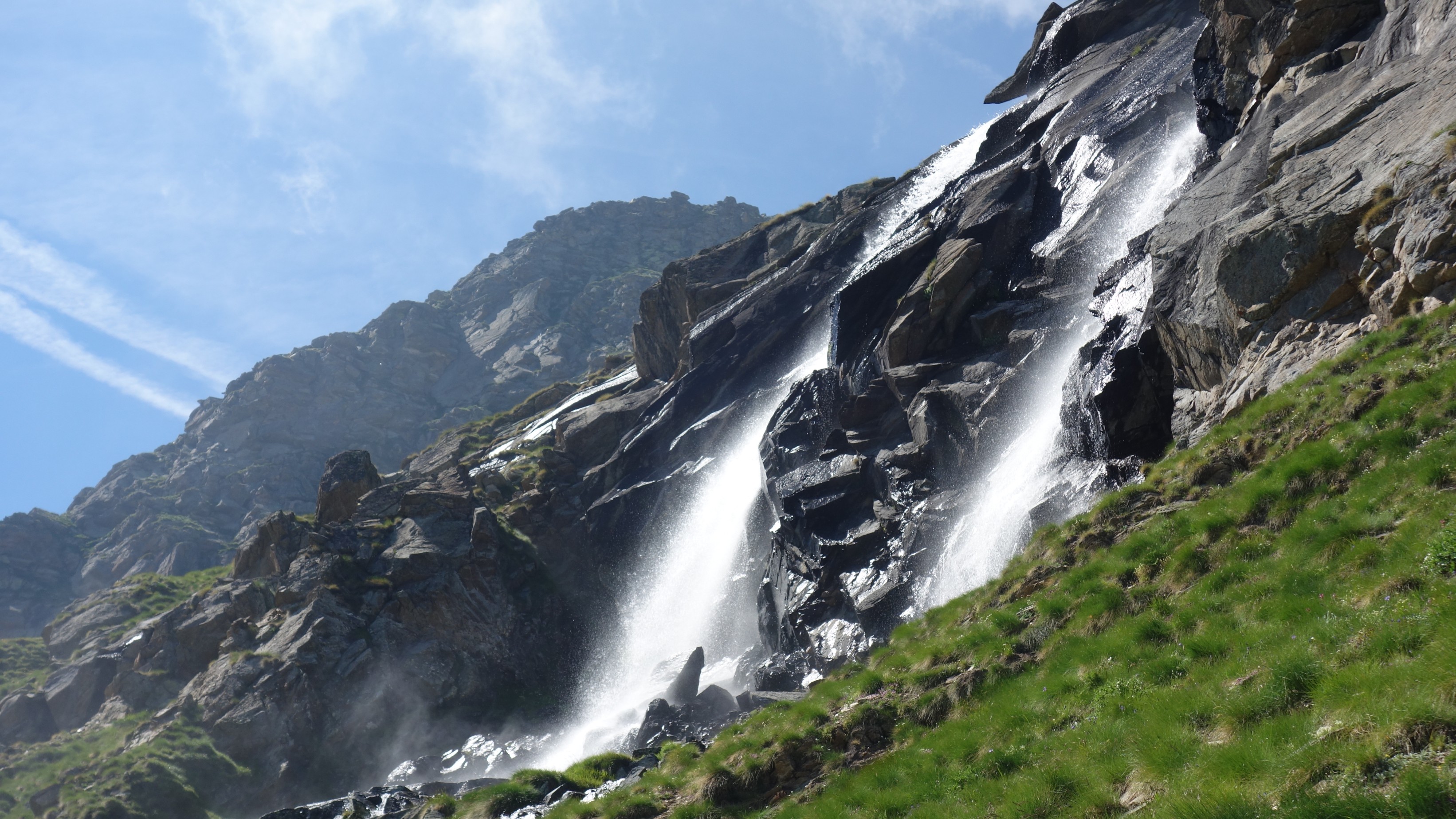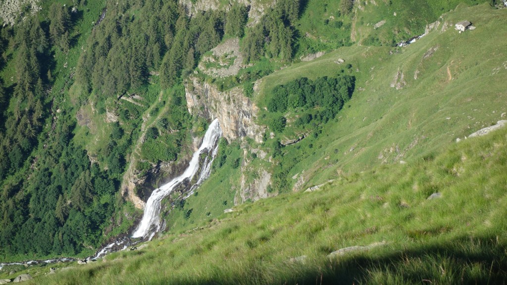 Er is nog wat verteertijd op weg naar Lillaz waar het echte klimwerk begint. Langsheen enkele mooie watervallen gaat het stevig omhoog naar Lac de Loie. Met de benen zit het goed, of toch die van mij. Terwijl Ivo op twee wielen de snelste is in de bergen, ben ik dat op twee benen. Een prachtig zicht over de vallei van Cogne ontvouwt zich als we even achterom kijken.