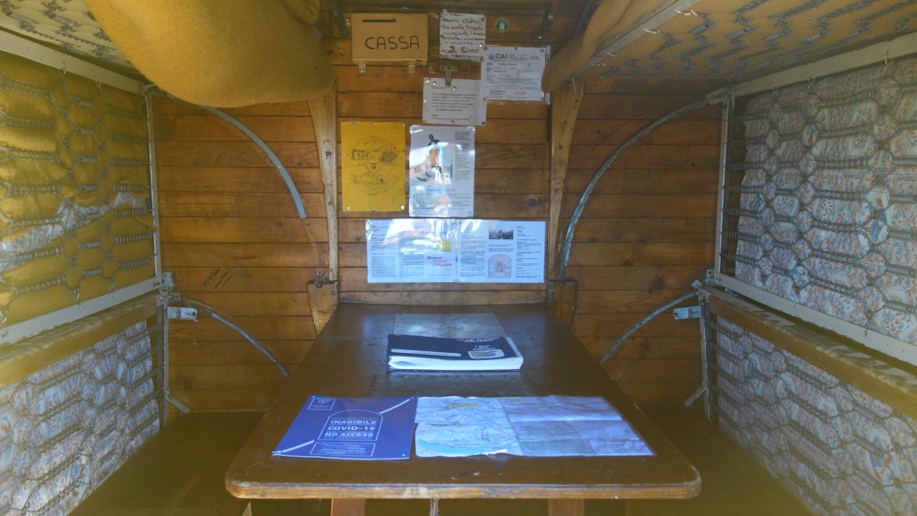 Het hutje zelf is toegankelijk maar op tafel ligt de instructie om hier niet te slapen. De 3 bedden aan weerszijden mogen enkel in uiterste nood gebruikt worden. Jammer, want dit is echt wel een bijzondere plek.