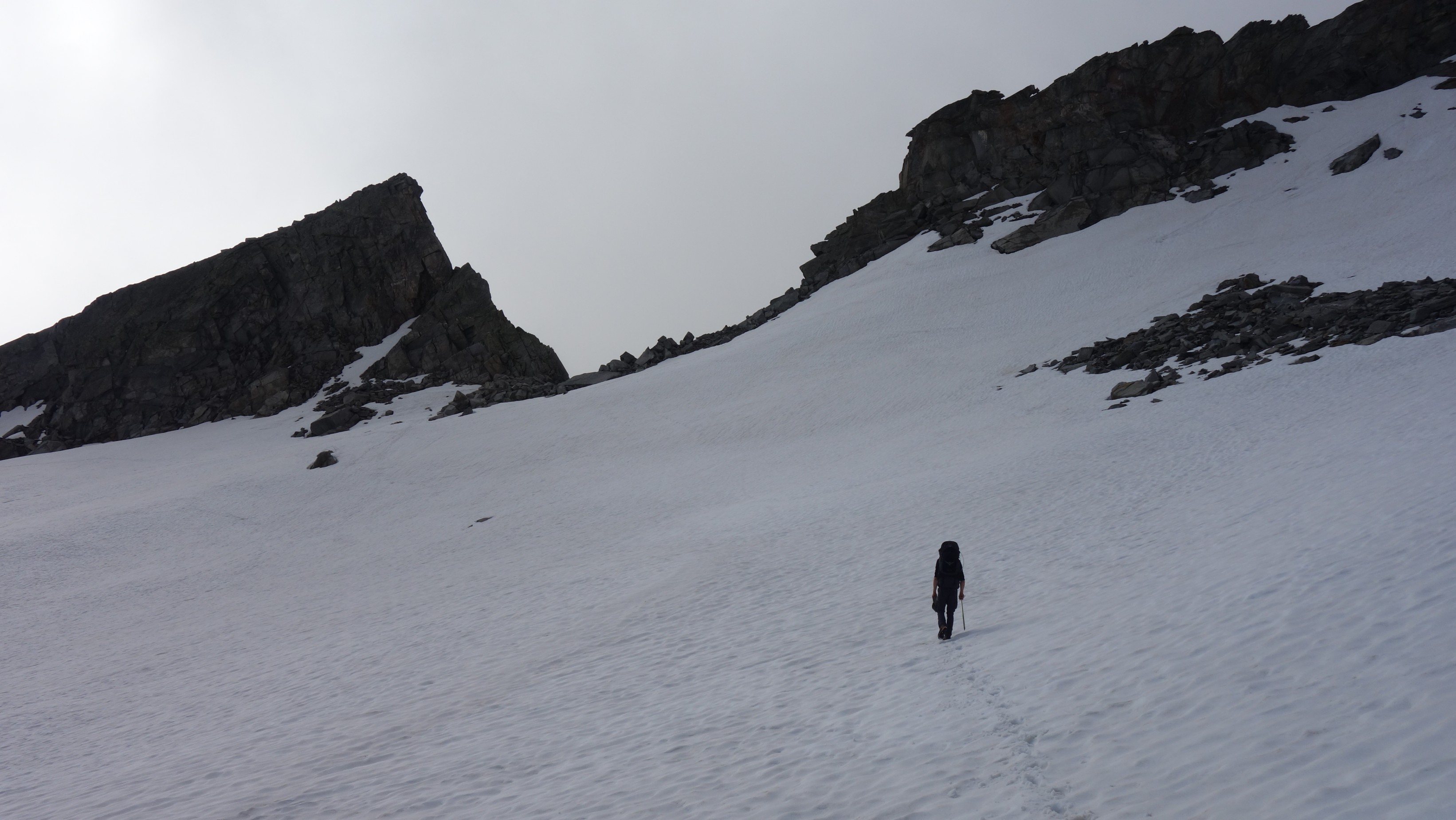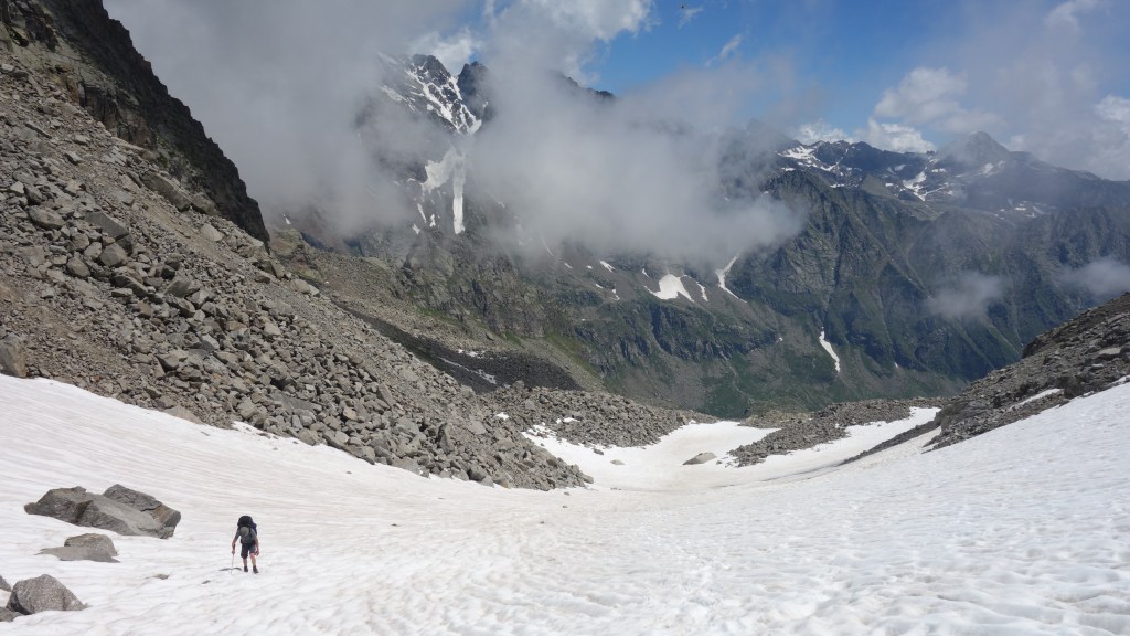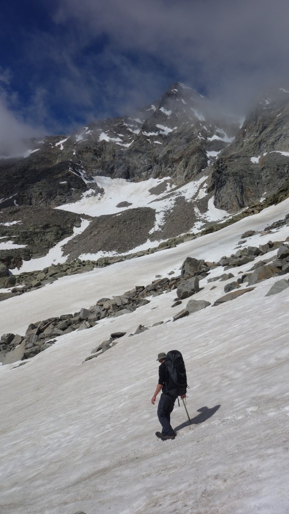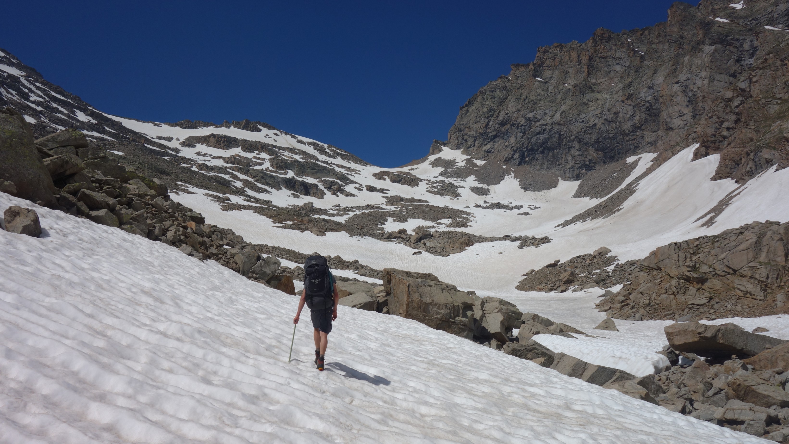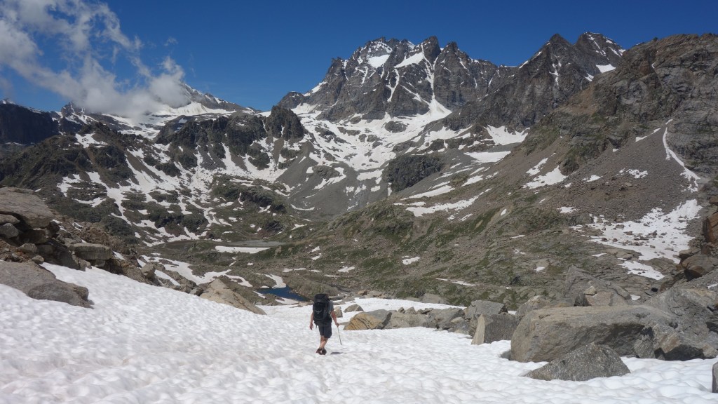 De route naar Colle della Porta, die de 3000m overstijgt, belooft terug stevig te worden. De sneeuwvelden liggen er alweer maagdelijk bij. Af en toe zijn de contouren van het wandelpad nog herkenbar, maar geregeld ook niet. We zoeken ons zelf een weg naar boven. Het voelt een beetje als pionieren aan.