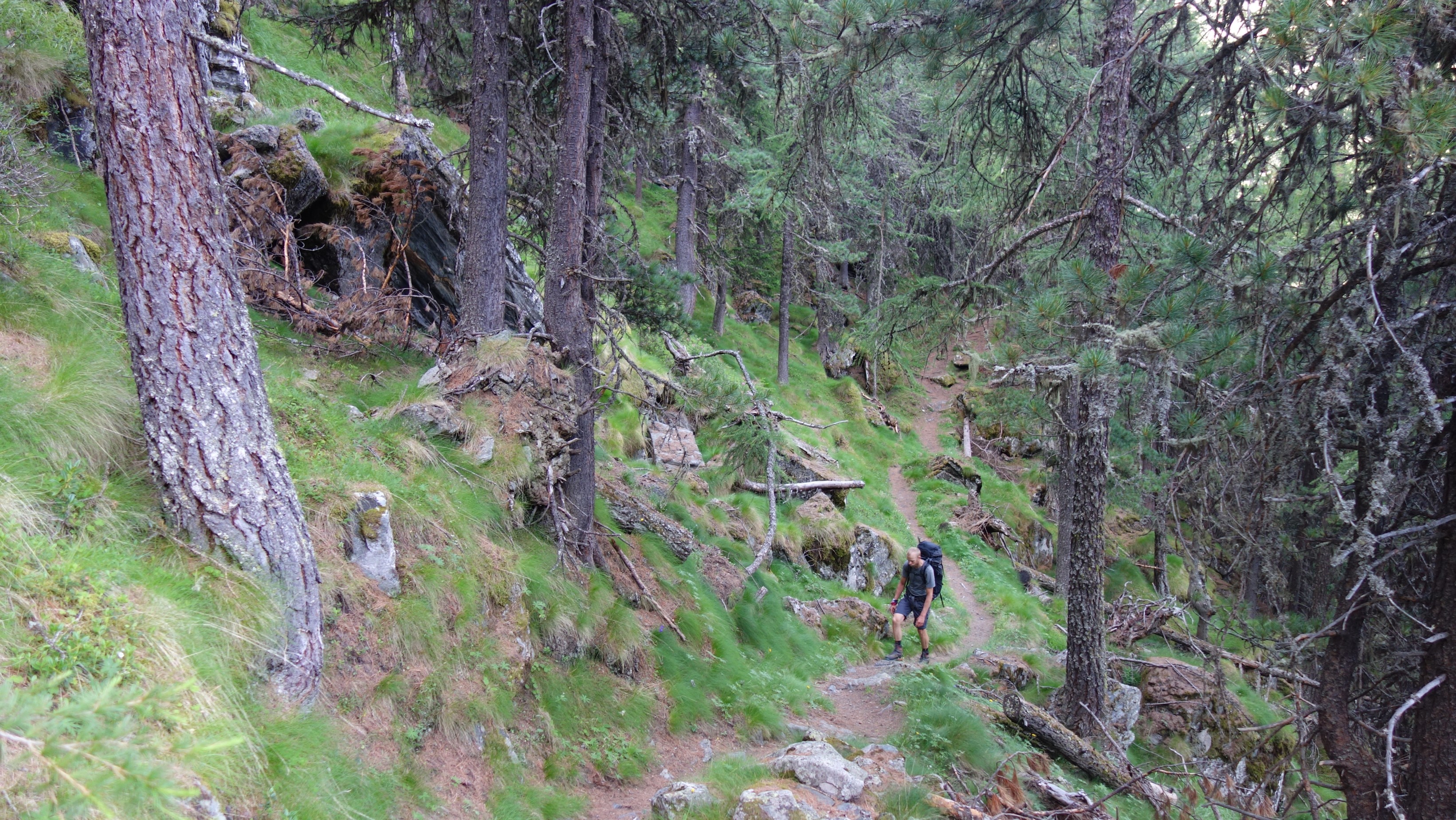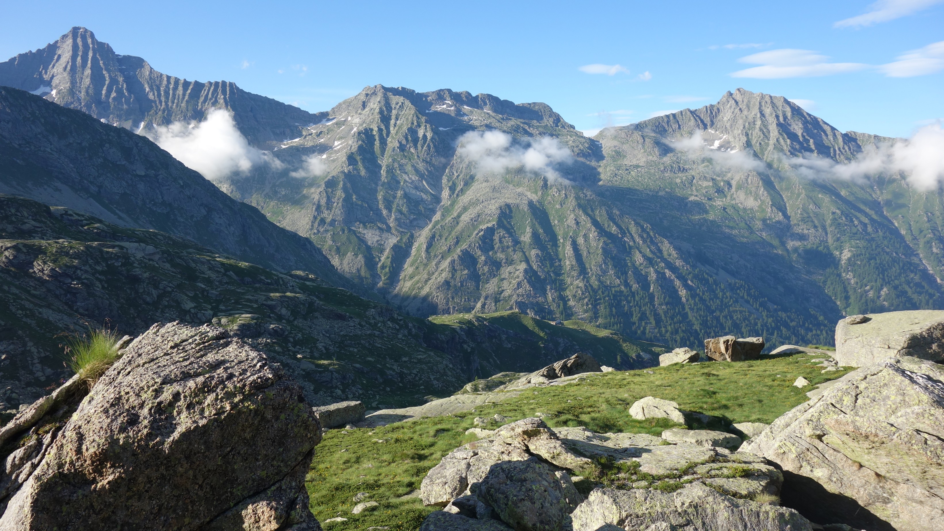 Alpe la Motta, Alpe di Goui en Alpe la Bruna, allemaal idyllische groene ‘pelouzes’ om de tarp neer te zetten, maar Ivo wil nog een beetje verder zetten. De laatste energiedruppels worden ingezet op weg naar de Bochetta del Ges. Een stuk chocolade op de col is de beloning en moet ons nog wat moed geven.