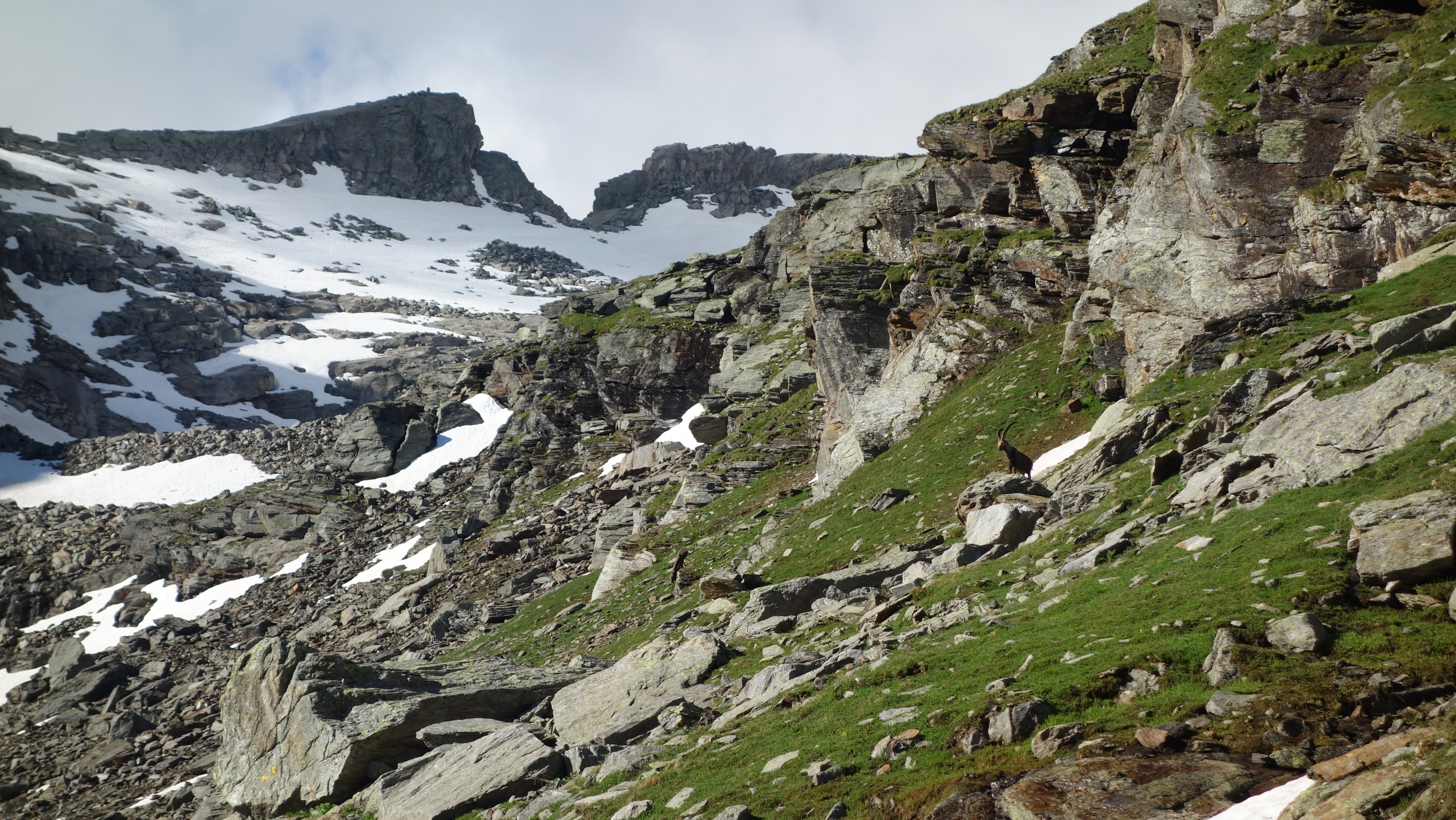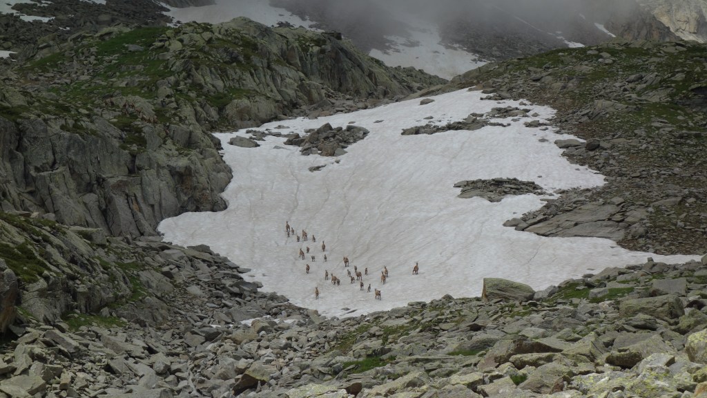 De afdaling naar Lago Lillet is al even wit, slechts enkele sikkels in het meer zijn ijsvrij. Het is hier minder steil en in telemarkstijl dalen we af. Het zigzagpad naar Colle della Terra is door het witte goedje op de steile flank wat precair. Enkele gemzen kijken ons meewarig aan. Herkenbaar aan hun fijne hoorns en gestreepte kop. Ze zijn veel schuwer dan steenbokken en zetten het al snel op een lopen.