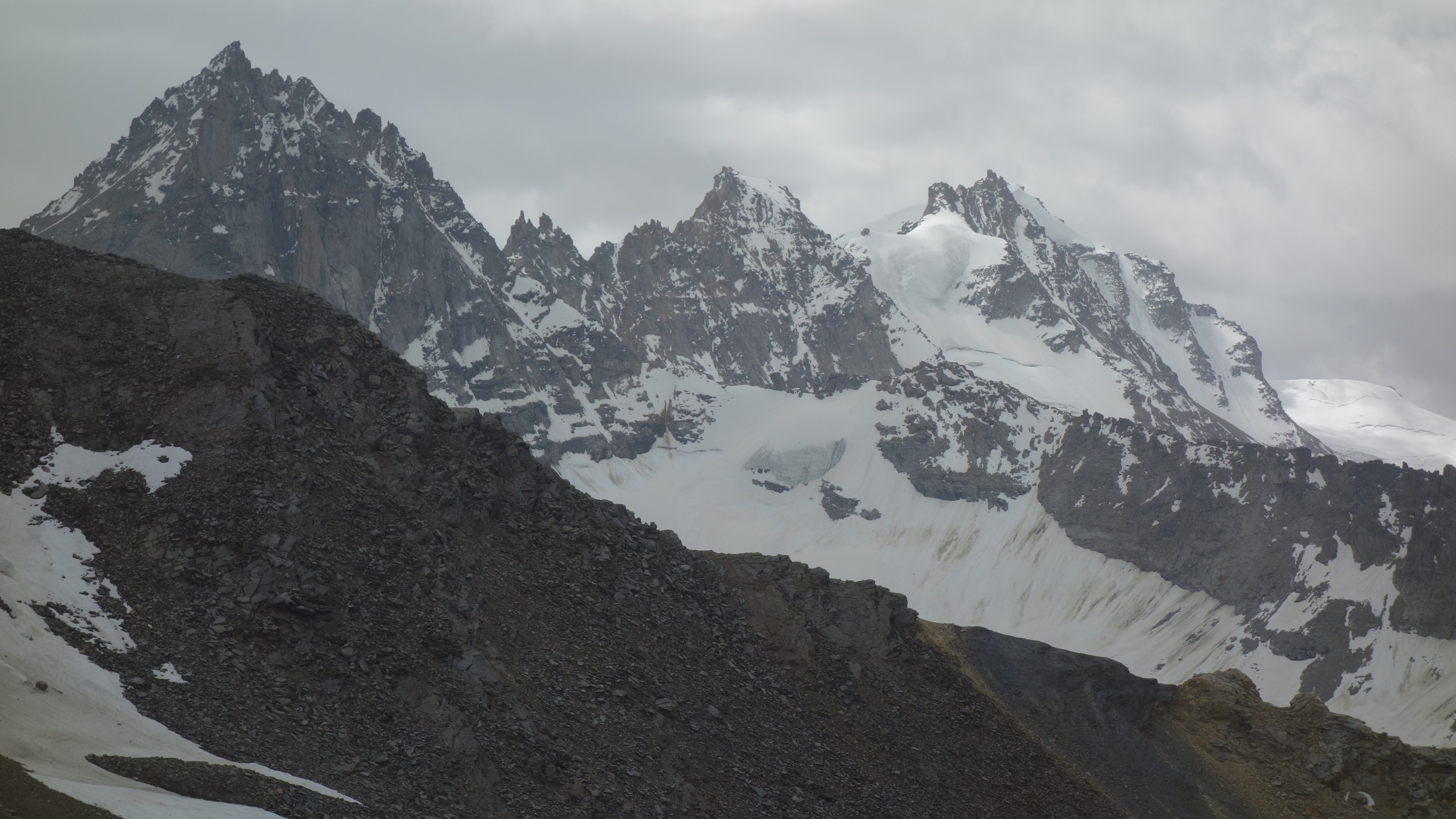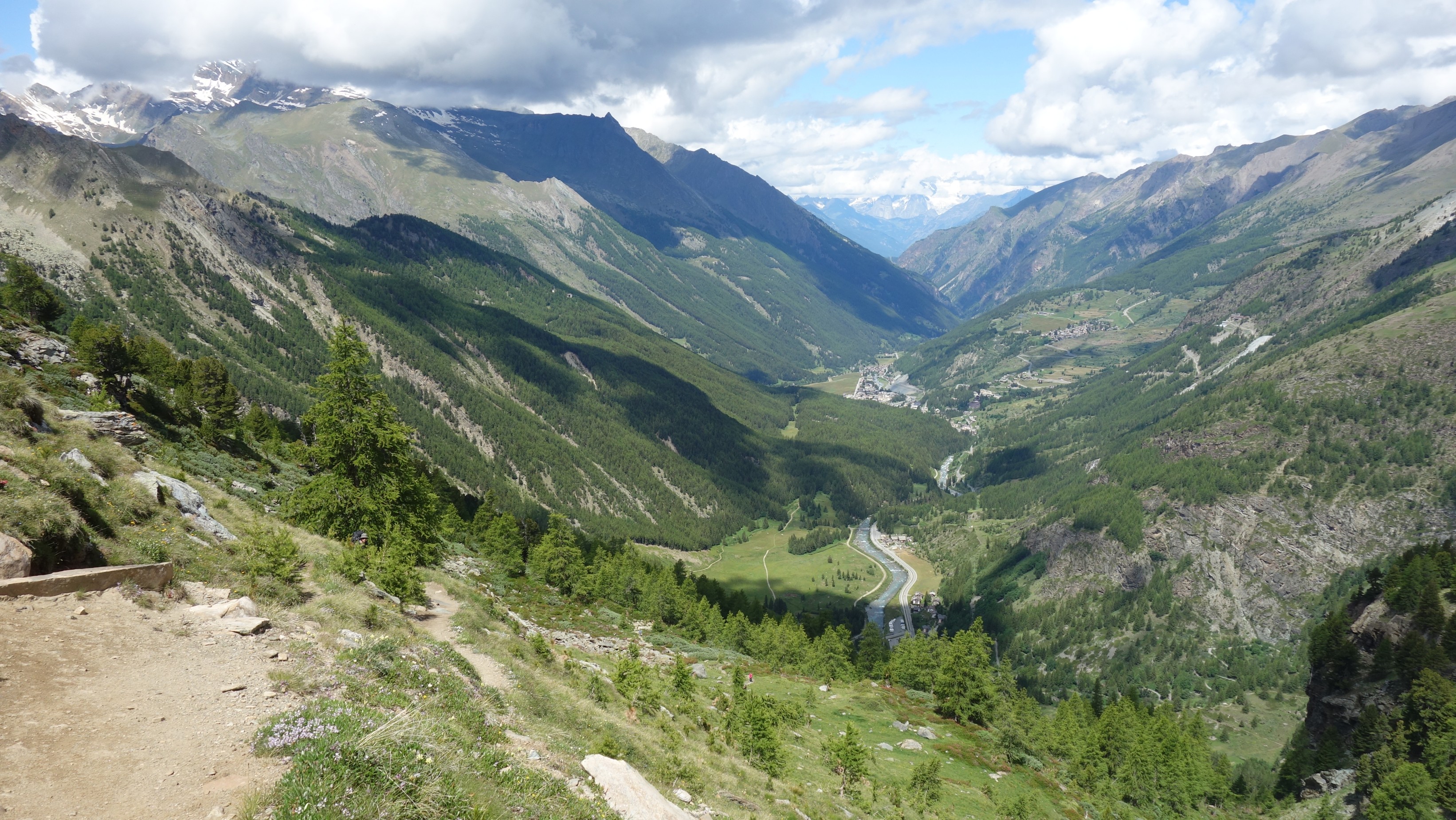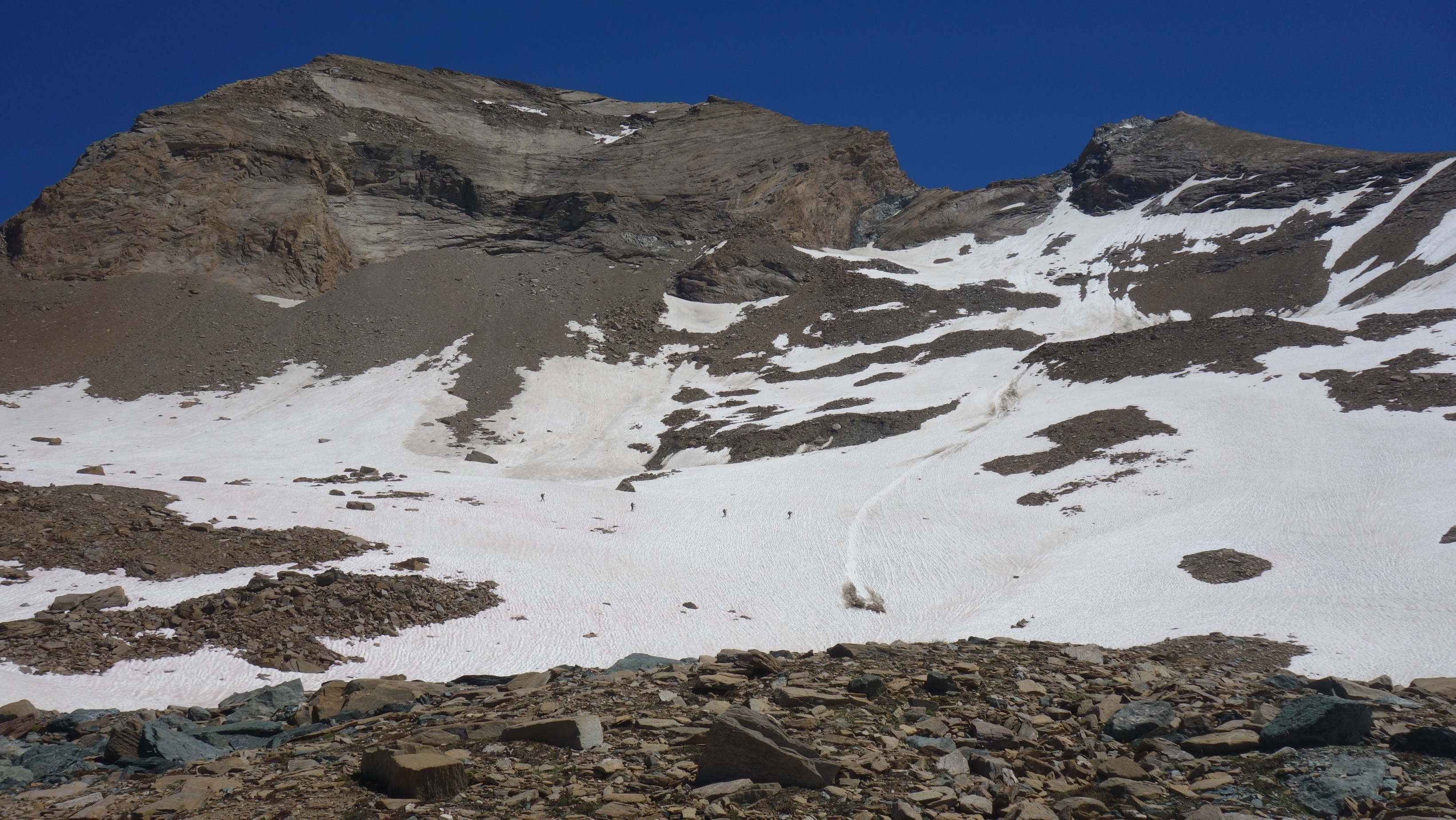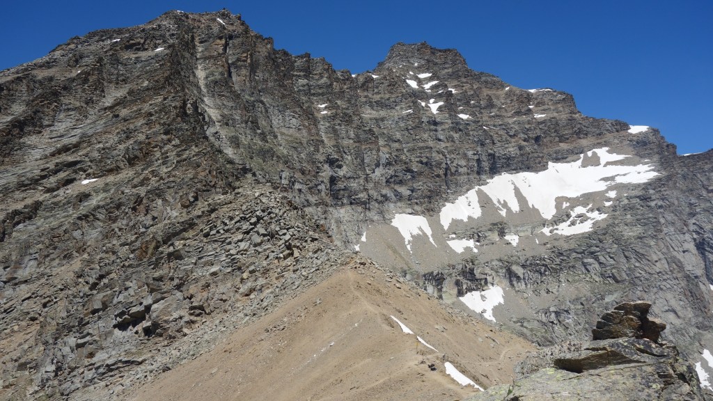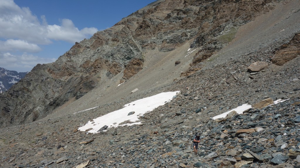 Op de Punta Rocchetta kijken we uit over de brede Valle Orco. Langs de westelijke kant ziet de wereld er gans anders uit. Er is geen vlokje sneeuw meer te bespeuren, wel een slingerend pad temidden een zandkleurige grintflank.