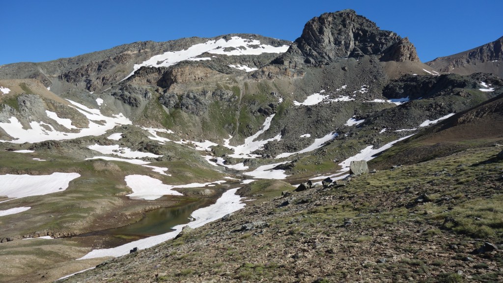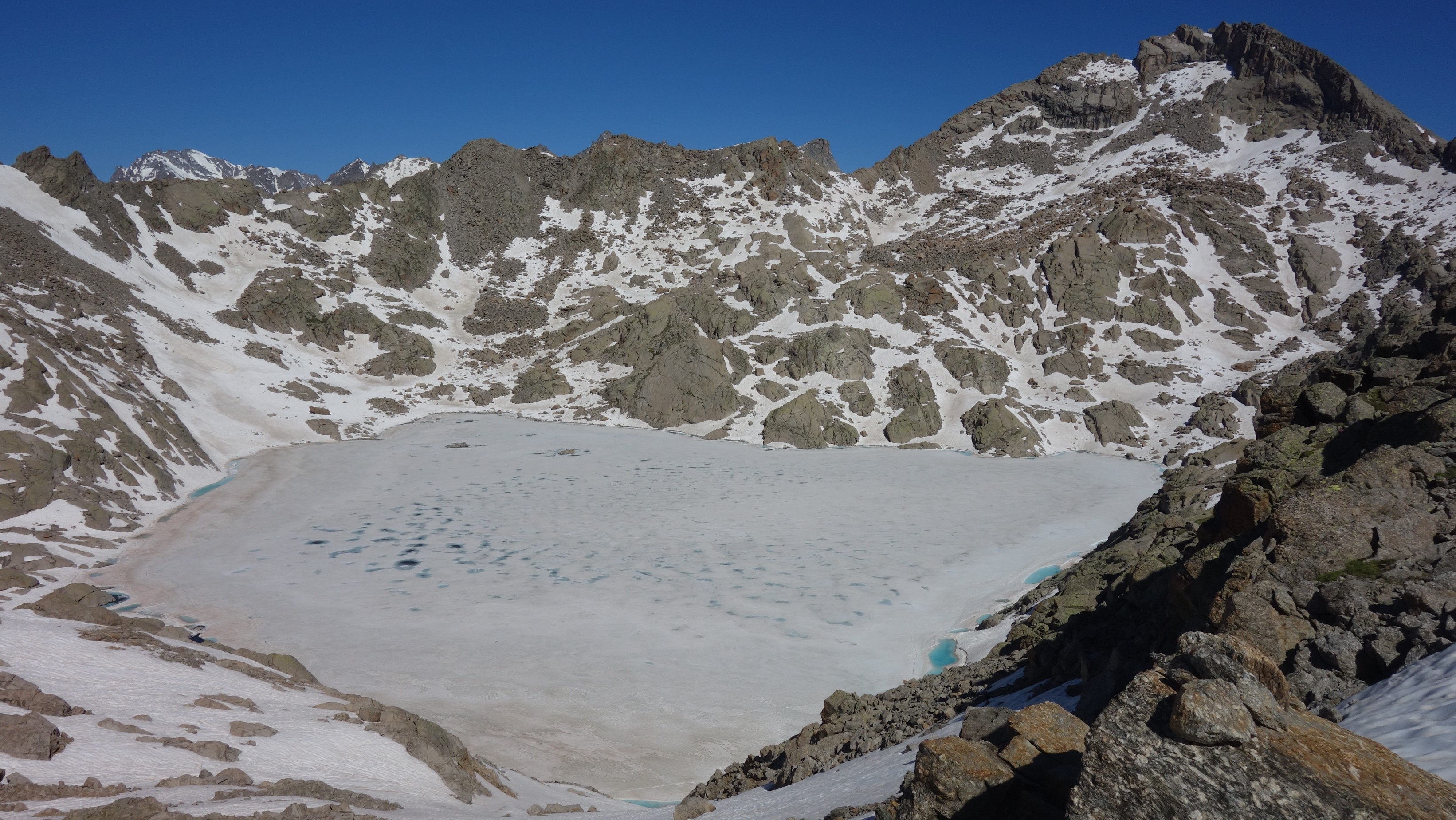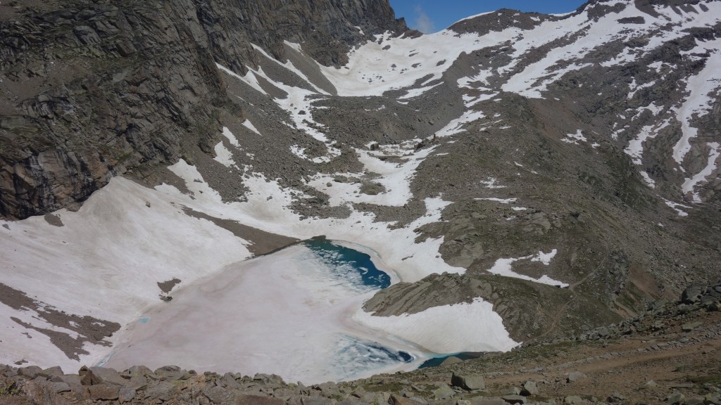Na een erg steil sneeuwveld staan we boven op de col. Lago Gelato heeft zijn naam niet gestolen. Zelfs begin juli is het meer nog dichtgevroren.