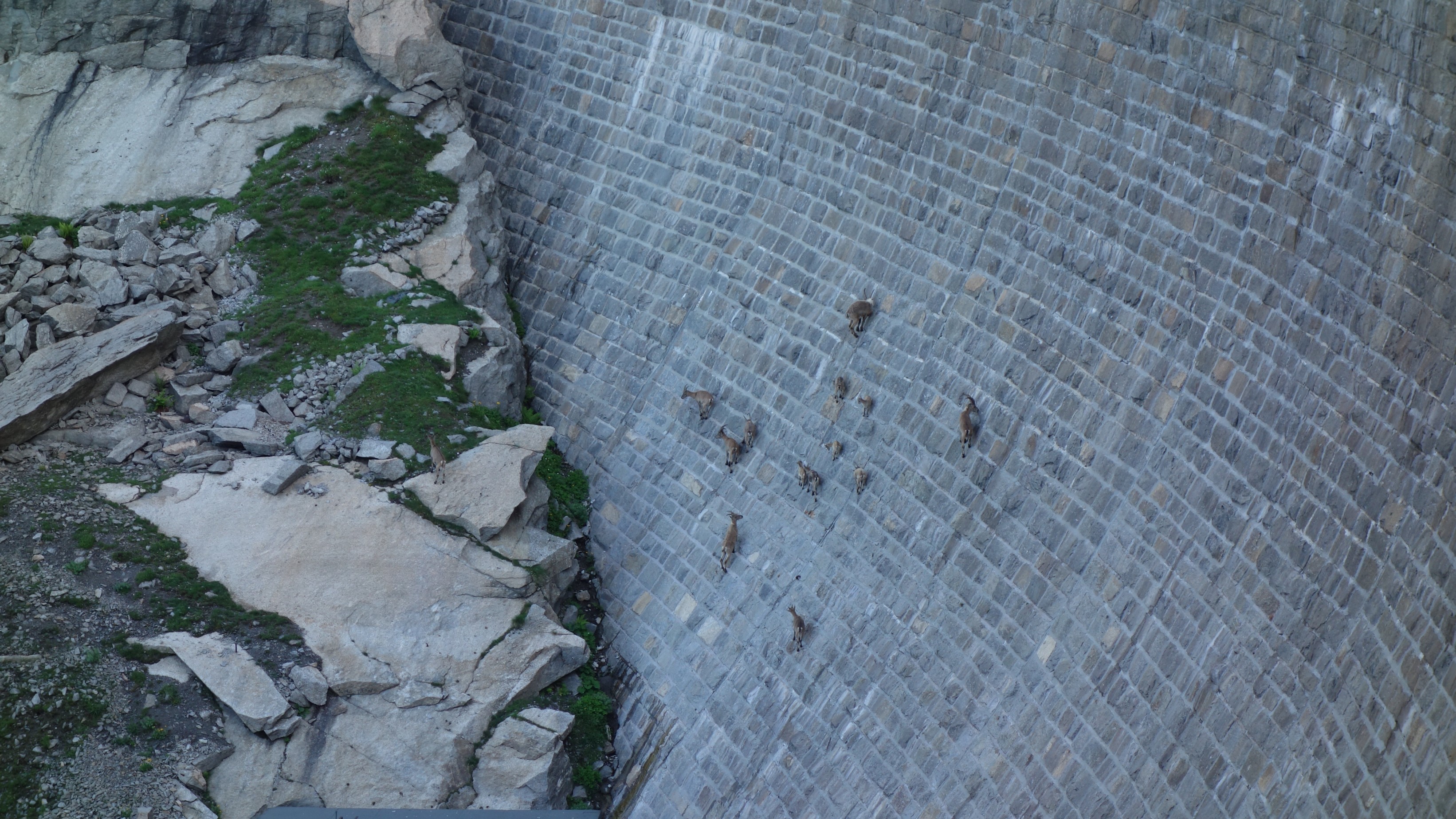 Op de bijna loodrechte dam zien we een kudde steenbokken grazen. Indrukwekkend met welk gemak ze zich voortbewegen. Hun korte poten zorgen ervoor dat het zwaartepunt zich dicht bij de grond bevindt, en hun speciale hoeven geven veel grip.