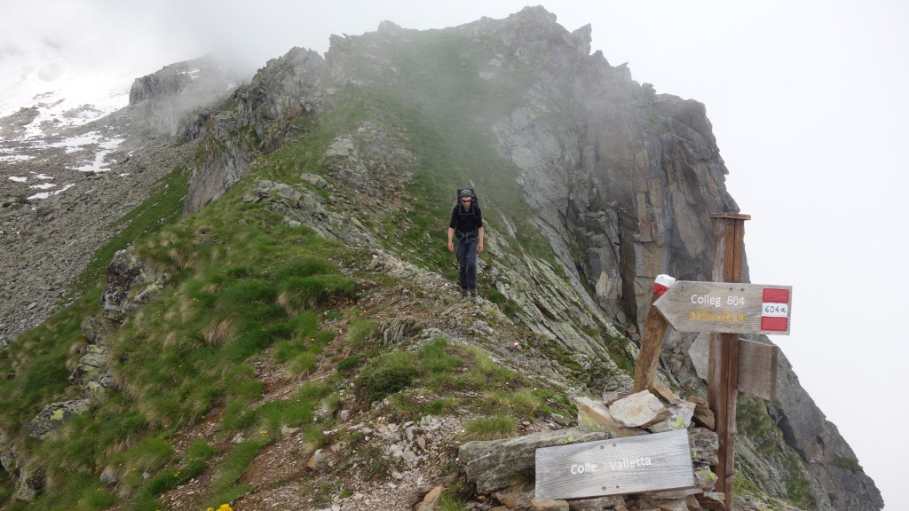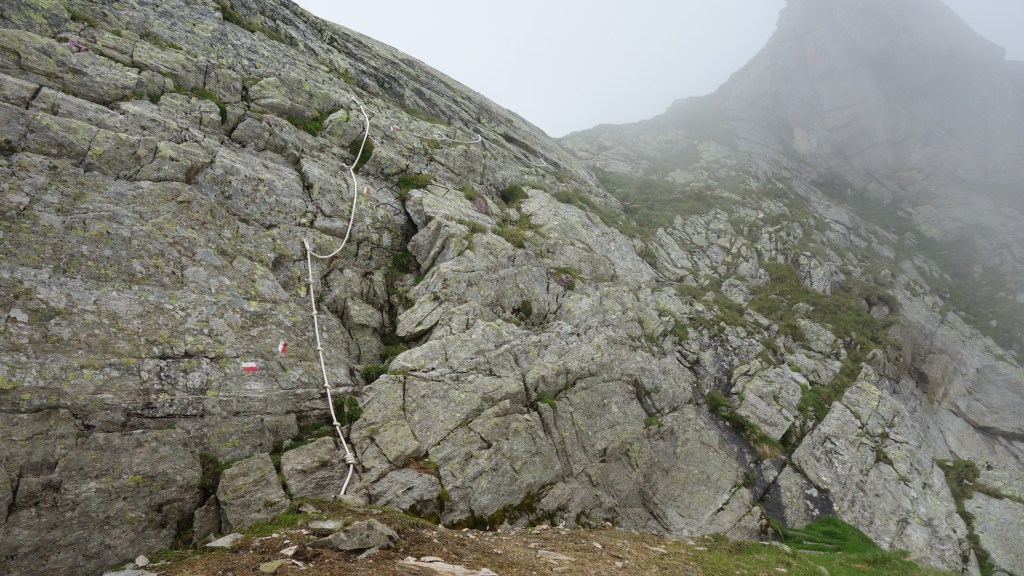 Touwen hangen op weg naar de Colle Valletta o Finestra. De wolken komen op en laten slechts enkele korte glimpen toe op de vele drieduizenders rondom ons. Bij Lago della Valletta komen we de eerste dagwandelaars tegen.