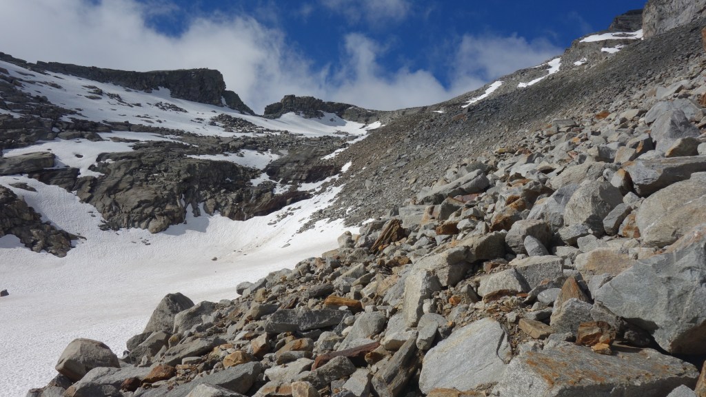 Via een uitgestrekt en schijnbaar onaangeroerd sneeuwveld bereiken we Colle di Bardonney. Het is mij al snel duidelijk dat we iets te westelijk zitten. De afdaling lijkt doenbaar maar het blokkenveld is toch wat groter dan ingeschat. Hier zijn we wel eventjes zoet mee. Terwijl wij zitten te zweten, zoekt een grote groep gemzen verkoeling in een sneeuwveld boven ons.