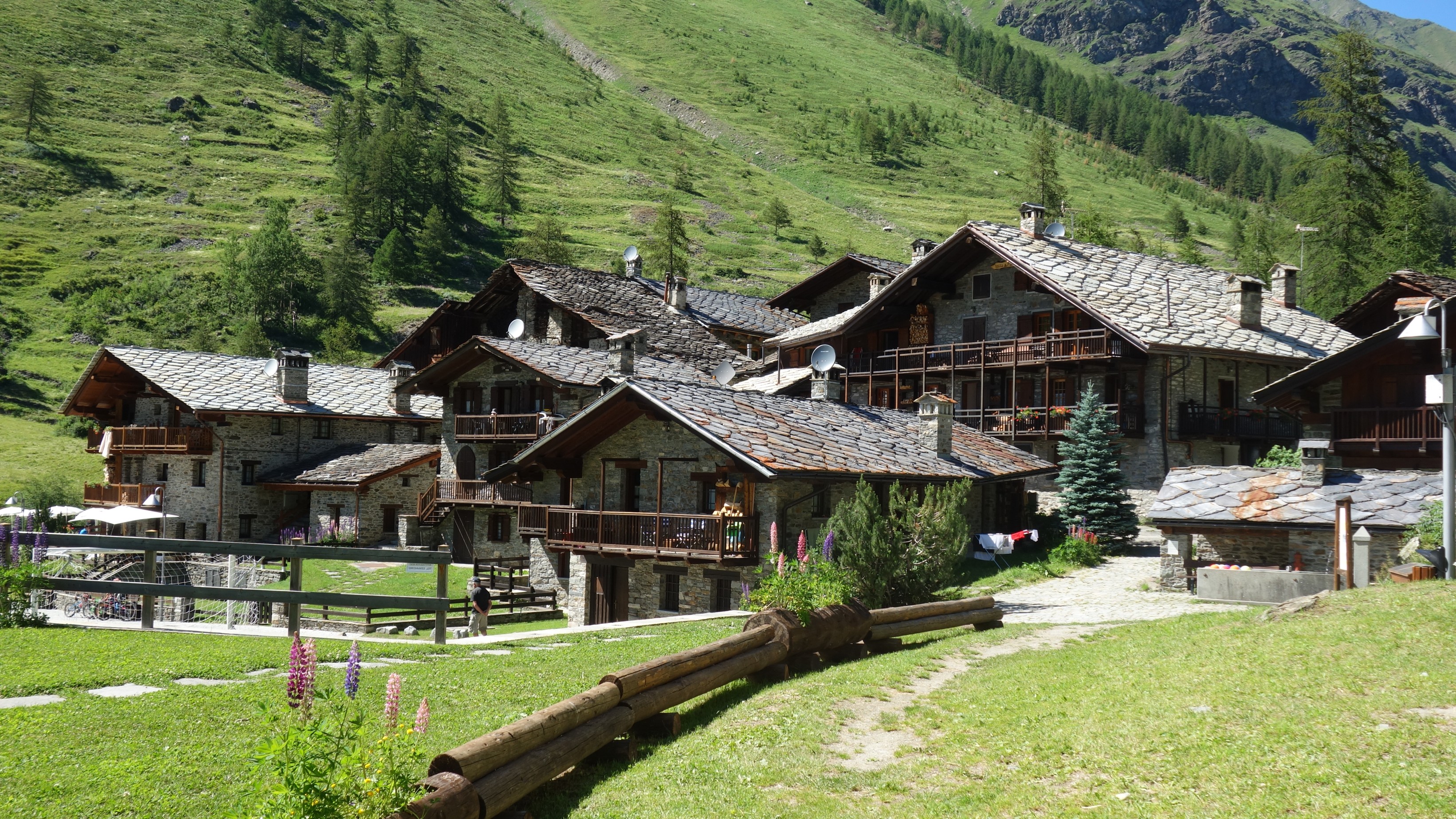 De temperatuur is nu echt aan het oplopen en de afdaling begint stilaan door te wegen. Frisgroene lorken bieden een welkome schaduw. Het is wat kilometers malen naar Rhêmes-Notre-Dame. Veel oog voor de idyllische gehuchtjes met de vele natuurstenen huizen hebben we niet meer. We hunkeren naar verkoelend zoete frisdrank en ijscrème.