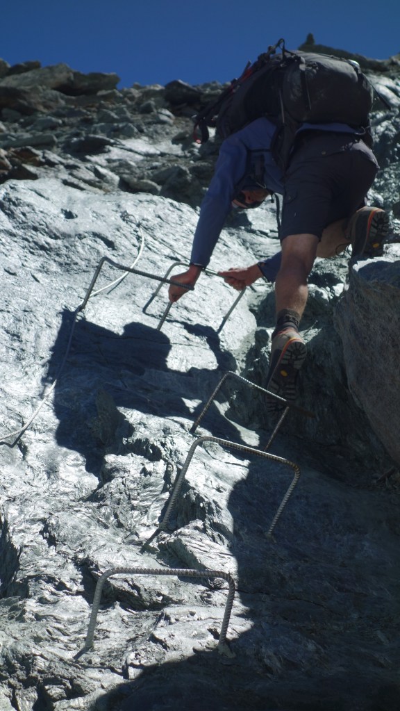 Ivo krabt even in zijn haar als hij me bezig ziet, maar eenmaal hij zelf op de ijzeren treden staat die zijn aangebracht op de steile rotswand, merkt hij hoe groot de stappen wel zijn. Met een zware rugzak niet van de poes. Behoedzaam dalen we af.