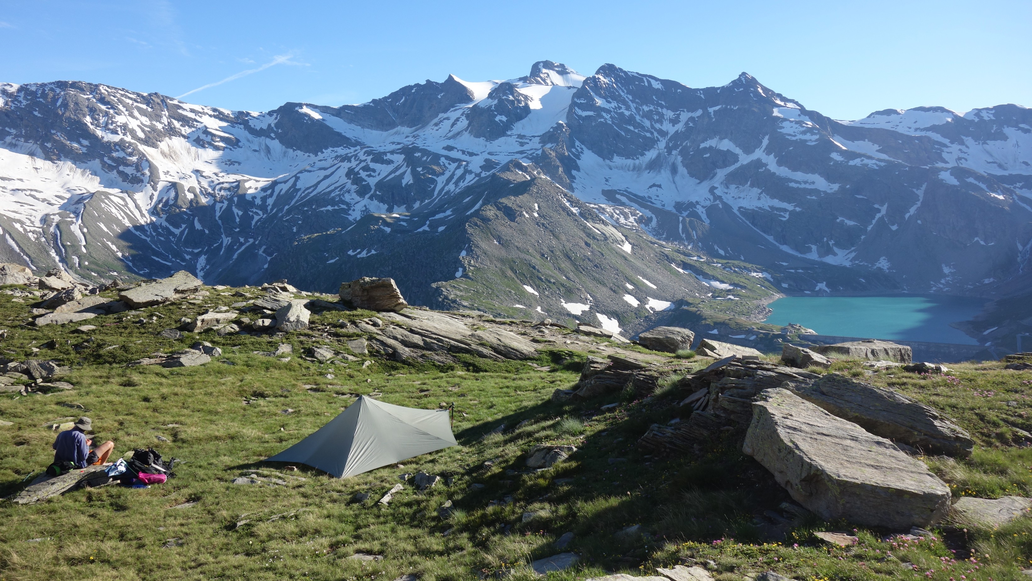 Intussen kijken we uit naar een mogelijke bivakplek maar kieskeurig als we zijn, duurt het tot Laghi Losere voor we neerstrijken. Ook dat is geen ideale plek maar het uitzicht is top, er is water in de buurt…en mijn vat is af.