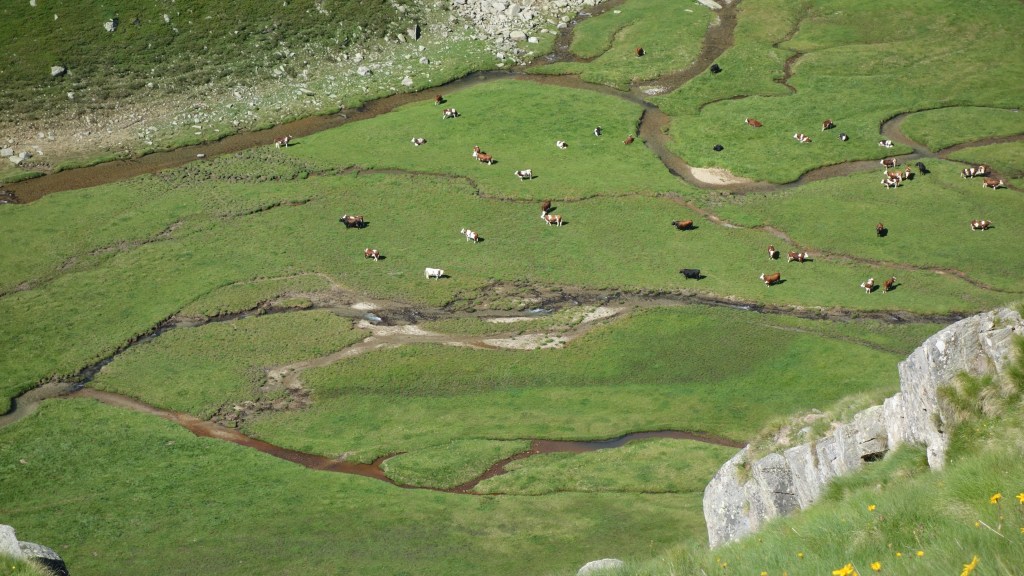 Een panoramapad slingert langs de flank naar Lago di Broglio. Alsof we uit de hemel neerkijken, zien we enkele boerderijen, grazende koeien temidden een meanderende rivier en een prachtige waterval.
