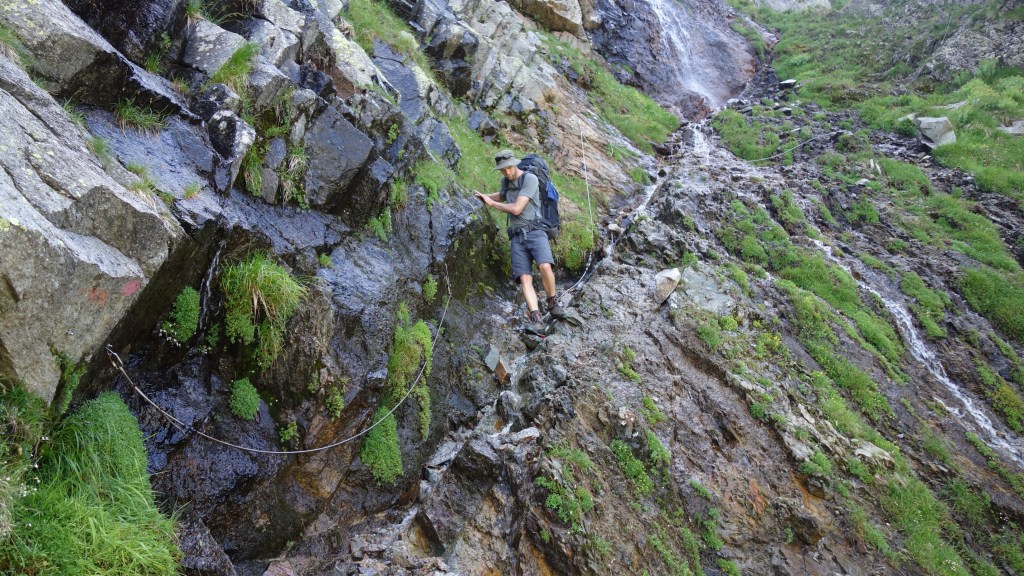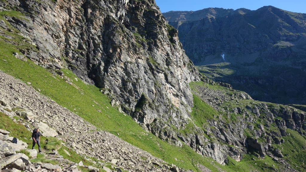 We komen in een spectaculaire vallei terecht. Het smalle pad slingert langs de heel steile bergflank verder naar Rifugio Pontese. Hier en daar hangen kabels op het bij wijlen glibberige en rotsige parcours. Voorzichtigheid is de moeder van alle bergwandelaars.