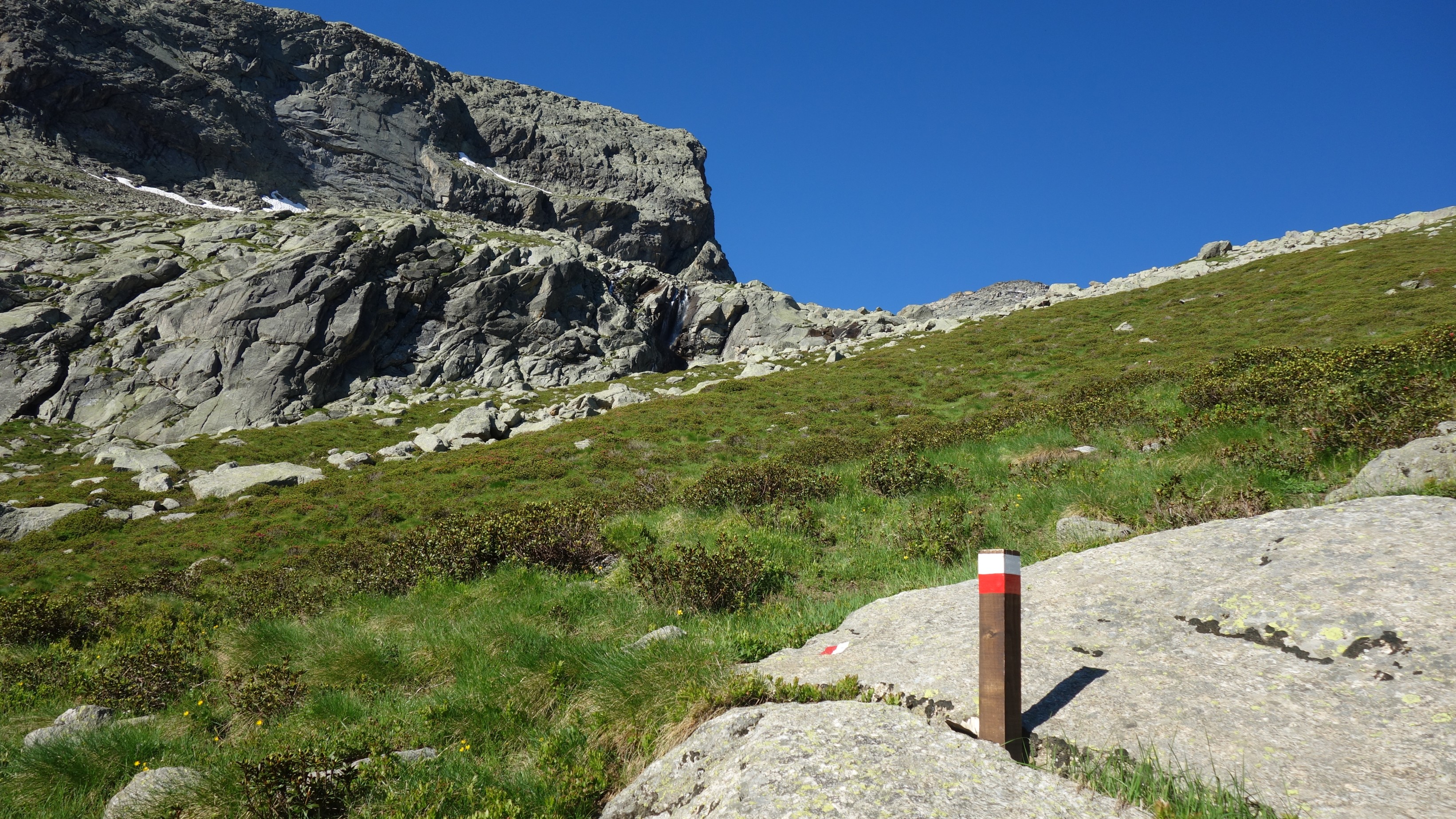 Tegen de verwachtingen in blijken er gloednieuwe witrode paaltjes te staan richting de Passo di Lago Gelato. De markering is er, het pad nog niet, en het gaat recht omhoog door weerspannige rhododendronstruikjes.