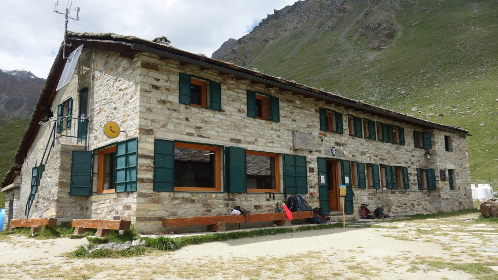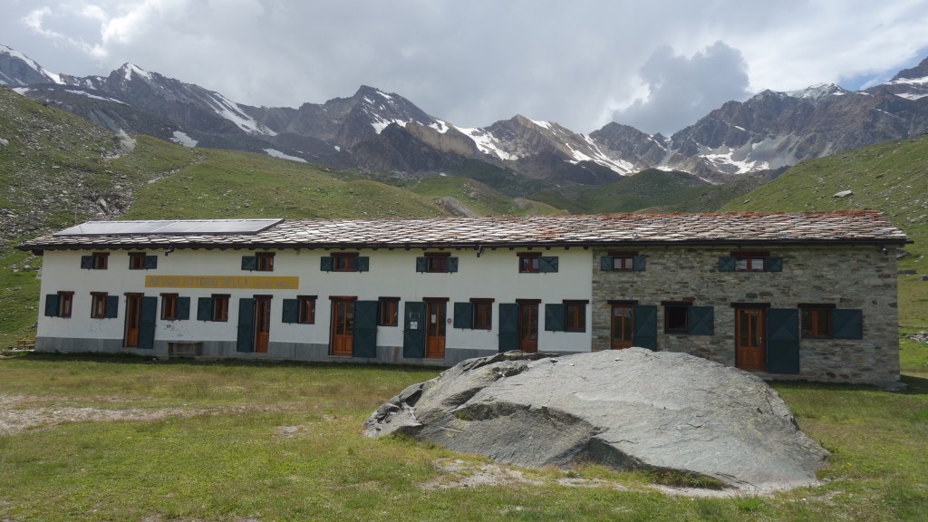 Rifugio Vittorio Sella is een voormalig jachtpaviljoen van de Italiaanse koning en nu één van de bekendste berghutten van het gebied. Met een dreigend onweer in de lucht besluiten we toch om binnen een spaghetti te eten.