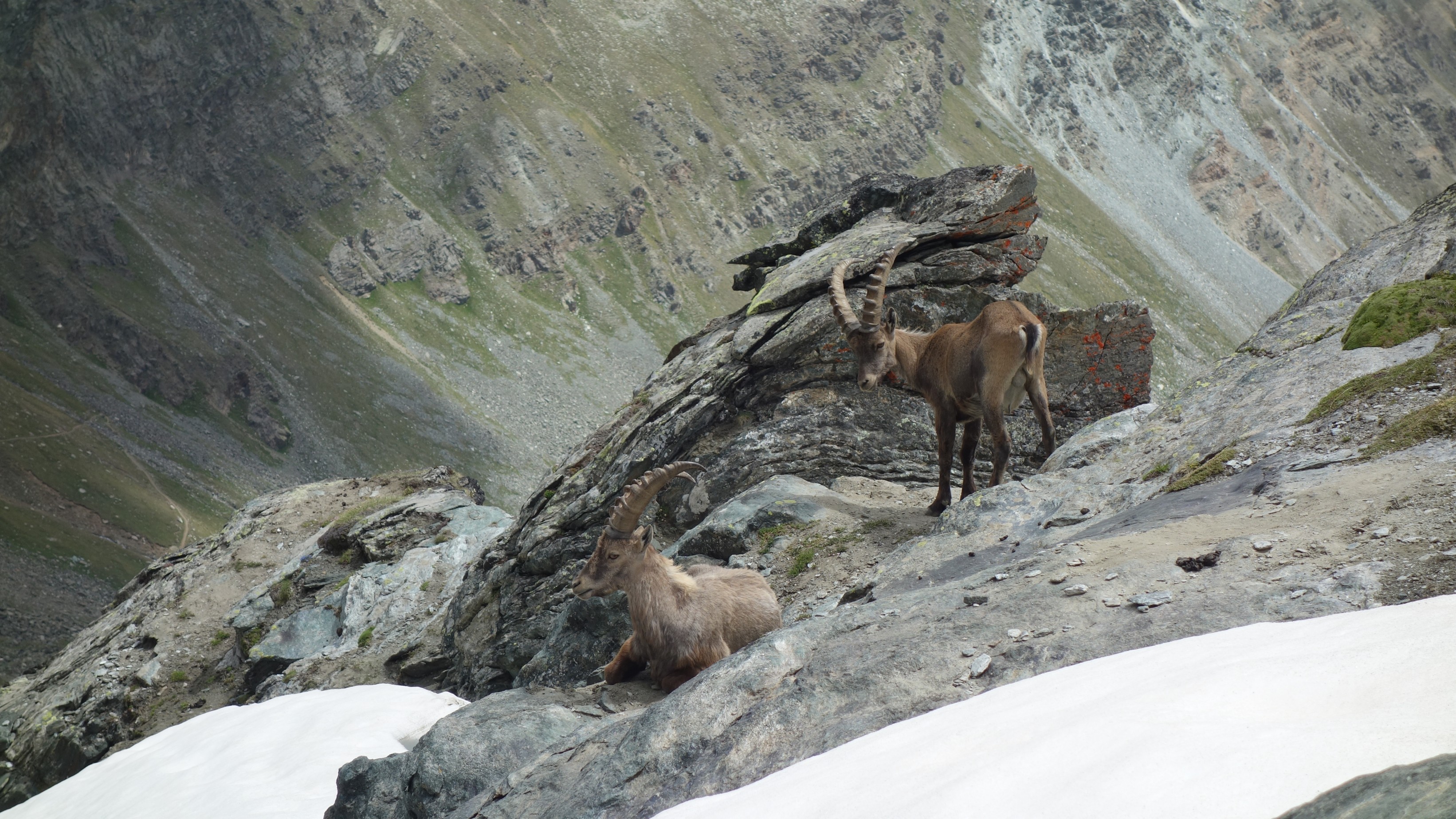 Na het overwinnen van een hoog sneeuwmuurtje in de afdaling duiken opeens twee steenbokken op. Die zijn niet meteen van plan hun poep te lichten en bieden met plezier hun stoïcijnse blik aan voor de foto. We proberen ze te omzeilen, kwestie van niet van de berg geramd te worden door hun stevige hoorns.