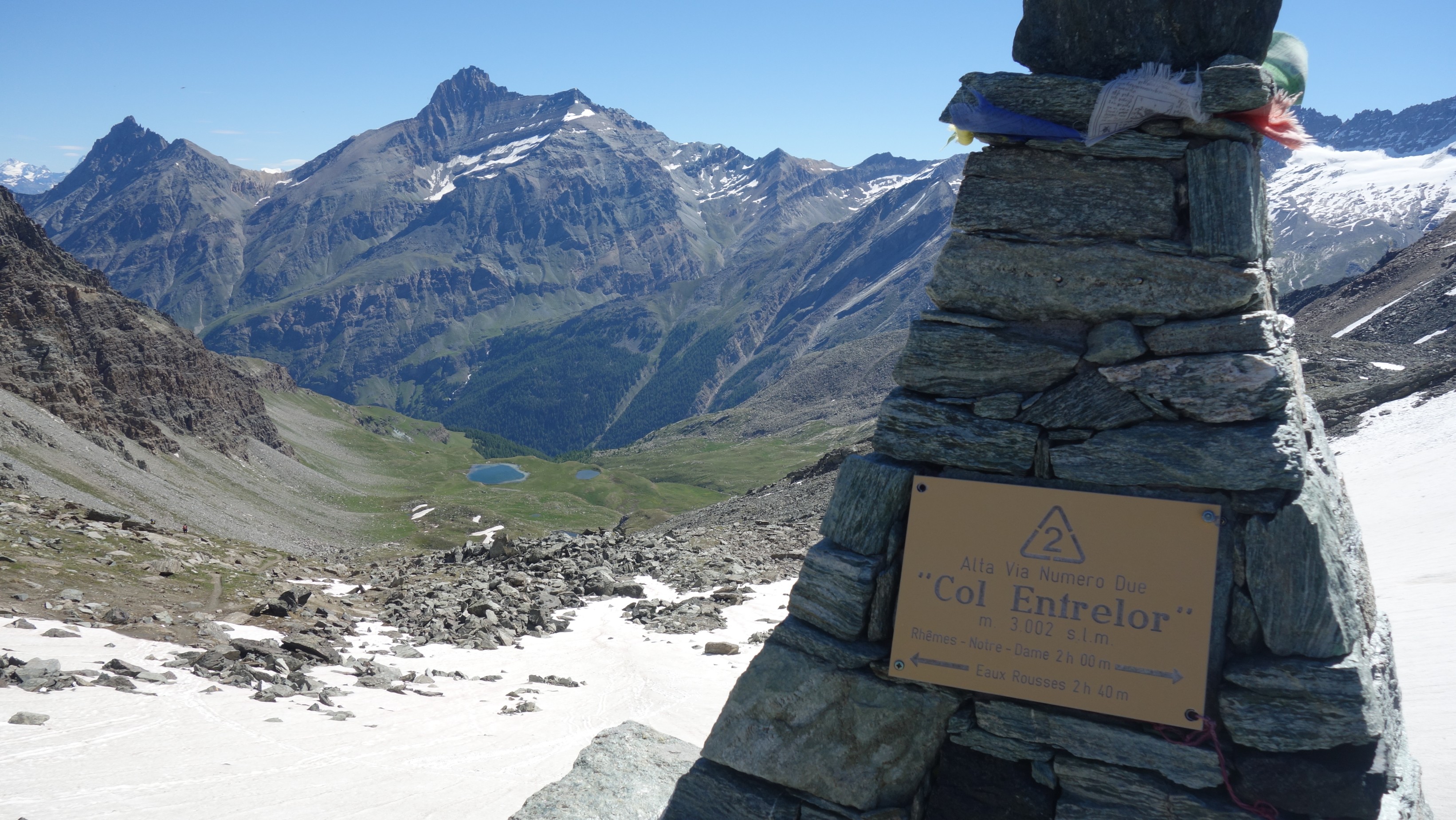 We zijn op de Alta Via nr. 2 terechtgekomen, ook wel de Alta Via dei Giganti (Reuzen) genaamd, die samen met zijn broertje nr. 1, de ganse Aostavallei omsluit. Gelukkig dat we houden van de nodige hoogtemeters, want Col Entrelor ligt op 3.008m en dat betekent behoorlijk wat klimmen vandaag. En onze honger naar toppen is nog niet verzadigd, want we trekken nog wat verder naar Pointe Percià Sud (3.225m).