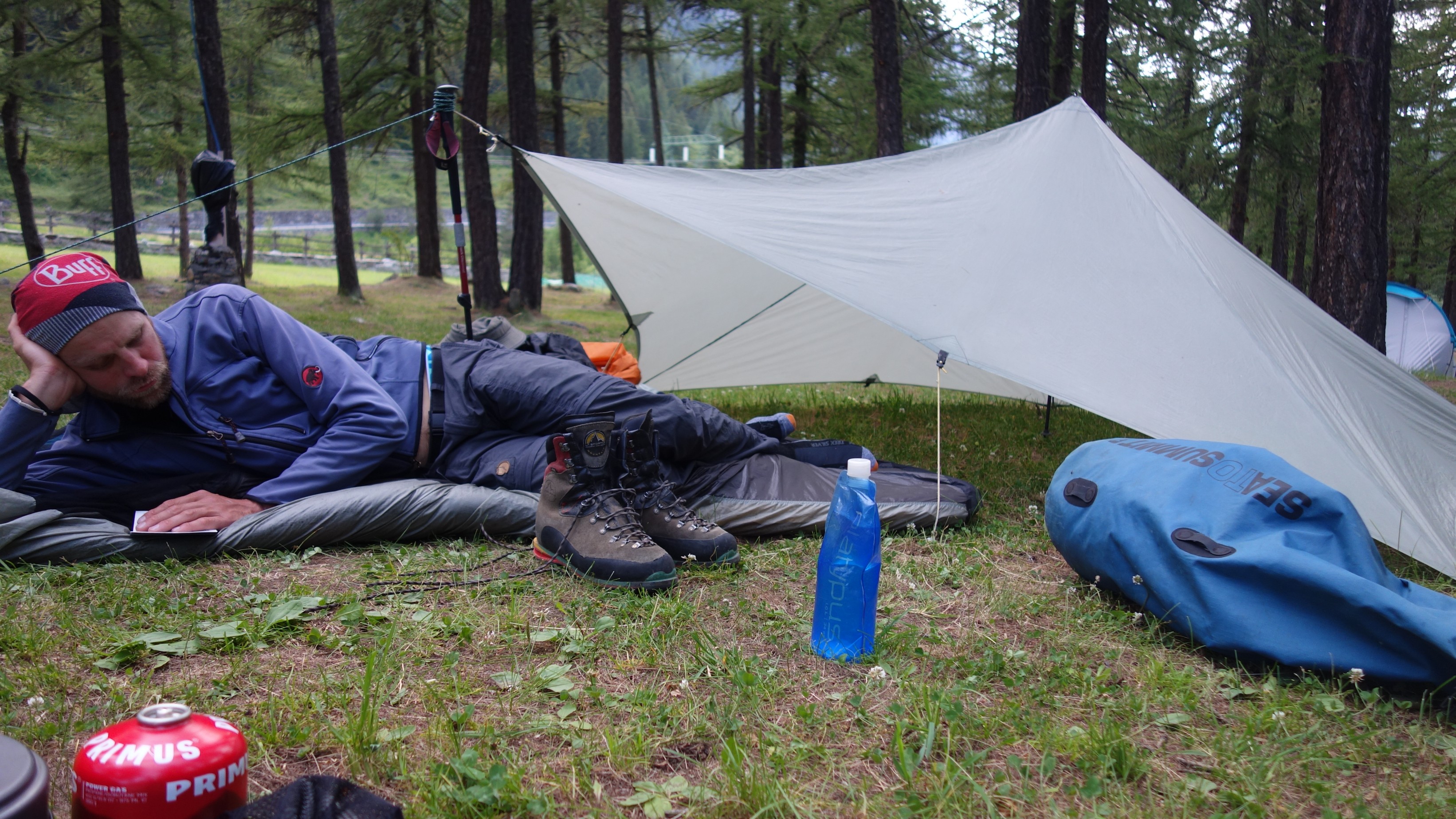 De dag startte erg zonnig maar de wolken zien er steeds grijzer en dreigender uit, en net voorbij de schapenboerderij van de Vallon De Bardonney voelen we de bui hangen. Tijd om de tarp te zetten…en best zo snel mogelijk. Net als de laatste haring de grond is ingeduwd, breekt een stevig onweer los. We duiken letterlijk weg uit de hagelstorm. Tijd voor een siësta die uiteindelijk de rest van de namiddag gaat duren…