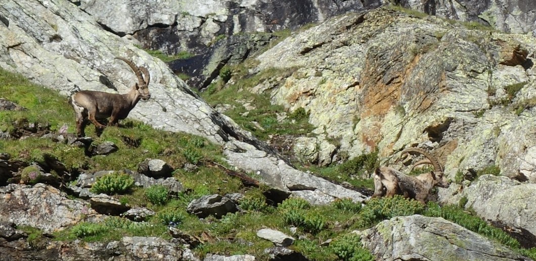 Via een weinig belopen pad gaat het rustig omhoog naar de bergpas. De eerste steenbokken duiken op. Het zijn enkele mannetjes, duidelijk herkenbaar aan hun dikke hoorns die naar achteren gekruld zijn. Enkel in de bronstijd, december-januari, zoeken zij de vrouwtjes op die de rest van het jaar samen met hun jongen in kuddes leven.
