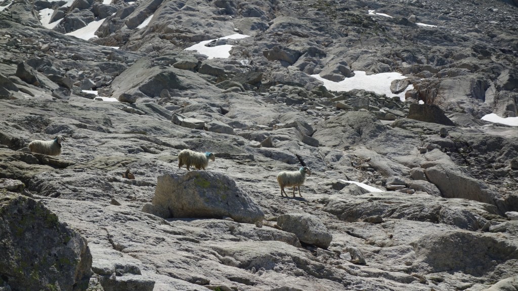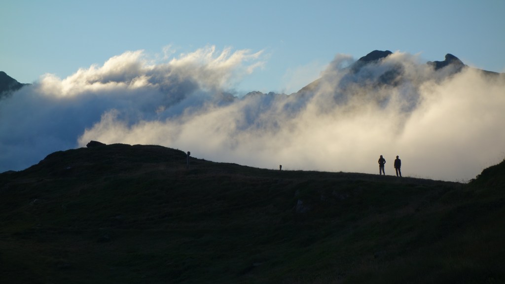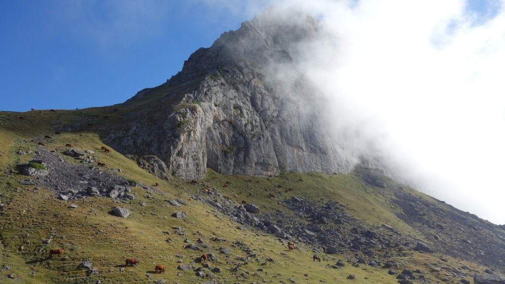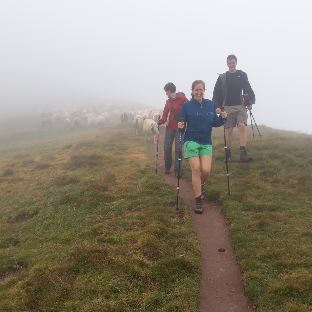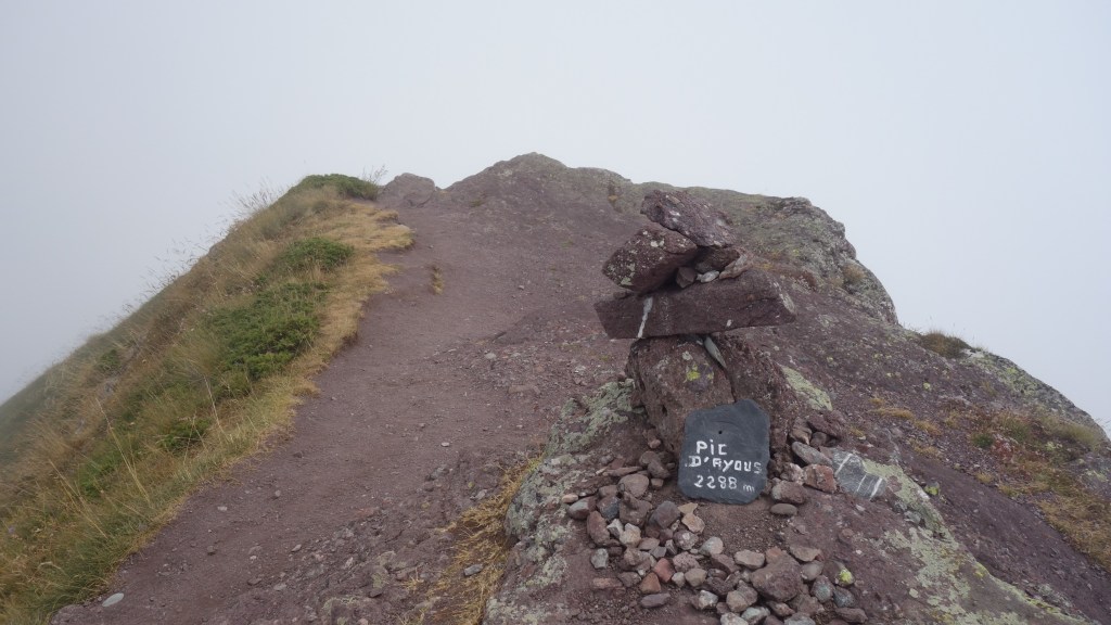 De rugzakken worden achtergelaten om naar de Pic d’Ayous te klimmen in de ijdele hoop boven de wolkenzee uit te komen. Op de top staren we ietwat beteuterd op een witte muur, de animo komt gelukkig van een enorme kudde schapen en de bijhorende patou. Hoewel de herdershonden vaak heel beschermend zijn, bleek het bij ons toch te klikken. Met als gevolg dat we de ganse meute achter ons aan krijgen terwijl we terug naar beneden wandelen.
