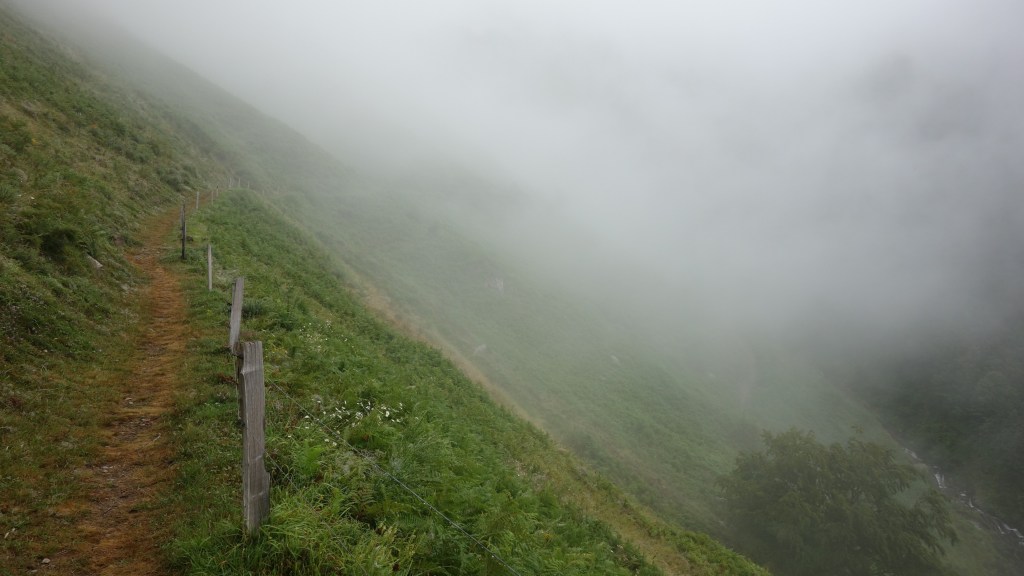We klimmen tot boven de boomgrens en…het zicht verdwijnt in het lage wolkendek. De mist zorgt voor een ietwat beklemmend gevoel. Het is bovendien erg vochtig weer en dus een beetje killig.