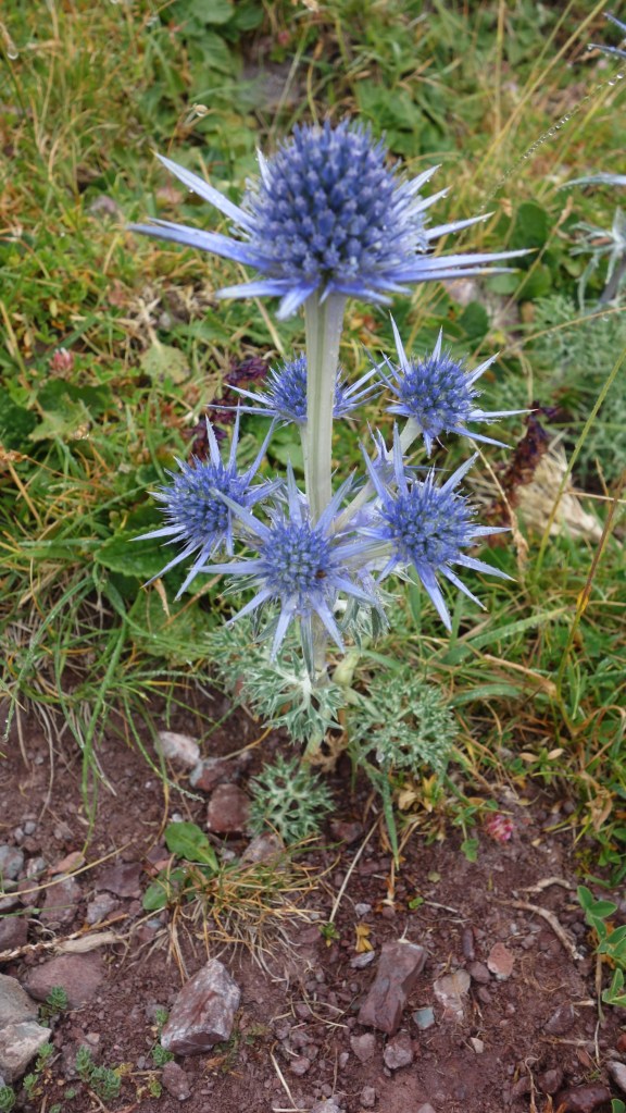 Bij een jonge herderin kunnen we lekkere ‘fromage de brébis’ inslaan, dat is alvast een culinair hoogtepunt bij de droge tortilla’s waarbij ik de vulling er vaak moet bij fantaseren. We piepen even binnen in de onbemande maar mooie Refuge de Larry, en trekken daarna verder naar Col d’Ayous waar we op het parcours van de bekende GR10 terechtkomen. Al is het intussen augustus, er is nog wat flora te zien o.a. de ‘Iris des Pyrénées’ et de ‘Chardon bleu des Pyrénées’, die bij ons ‘kruisdistel’ wordt genoemd.
