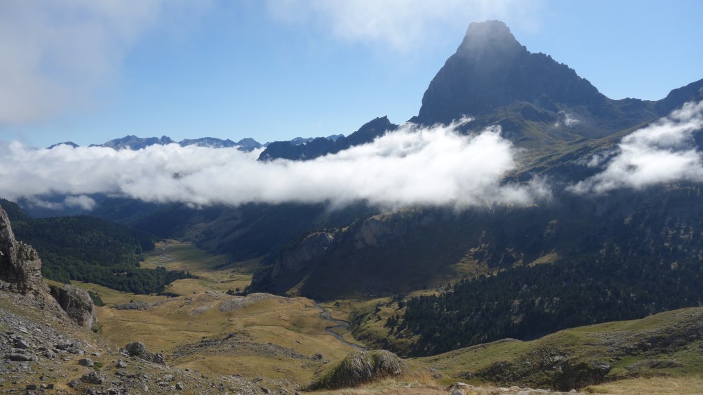 Het is pas de volgende ochtend dat het indrukwekkende decors tevoorschijn komt. De laatste wolkenflarden stijgen op uit de vallei en de zon wint steeds meer terrein. De impressionante Pic du Midi d’Ossau doemt op aan de horizon. Een droomochtend!