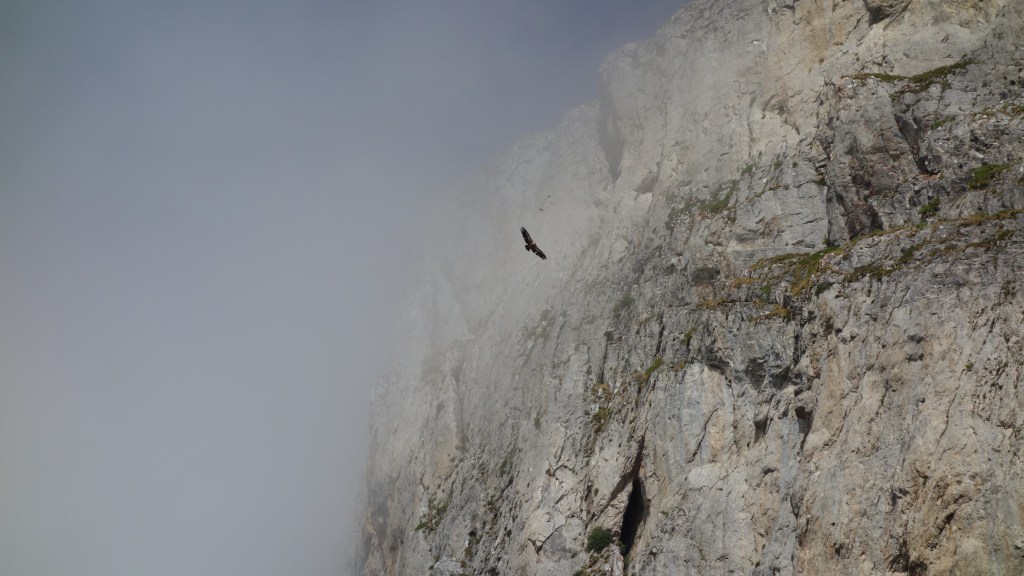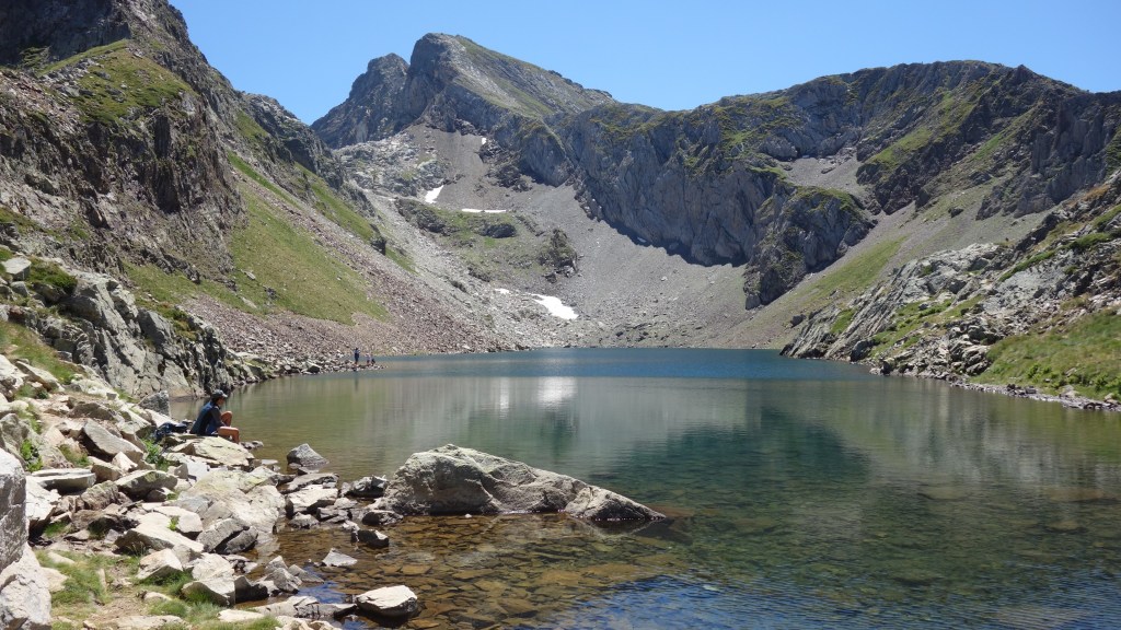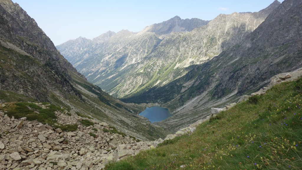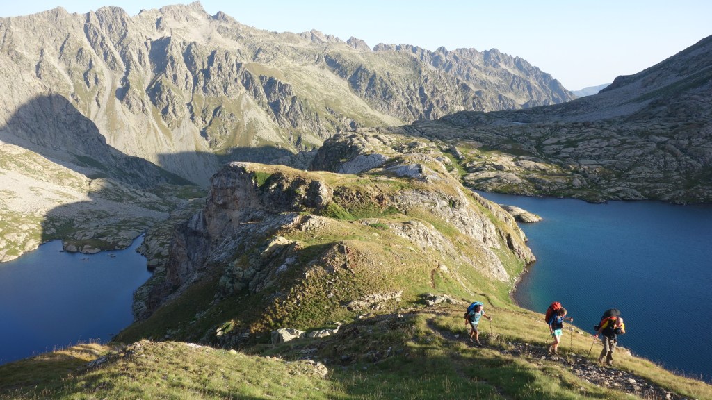 De populaire GR10 buigt gelukkig terug af naar het noorden, en we trekken via een variante route langs Lac Bersau en Lac Castérou naar Refuge de Pombie. Aan de loodrechte rotswand van Pic Castérou laten vale gieren zich op de thermiek naar boven zweven. Met open mond staan we te kijken, de verrekijker komt goed van pas om de vederloze lange nekken van deze aaseter te herkennen.