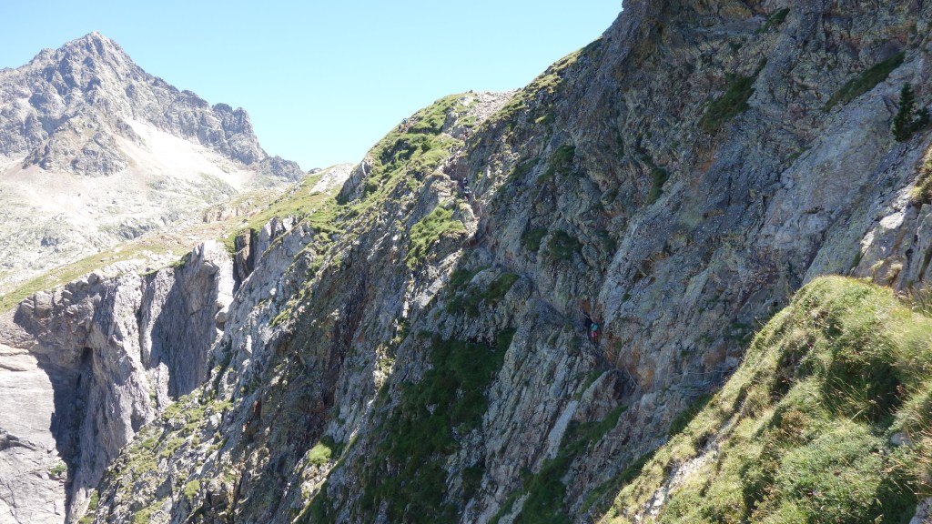 Het gaat terug stevig bergop naar Col d’Arrious en de befaamde Passage d’Orteig, de eerste luchtige passage van onze tocht. Voorzichtigheid & handenwerk zijn hier nodig, maar in droge condities geen probleem, tenminste voor wie niet kampt met hoogtevrees. De afgrond is namelijk best indrukwekkend. Er hangen ook kettingen.
