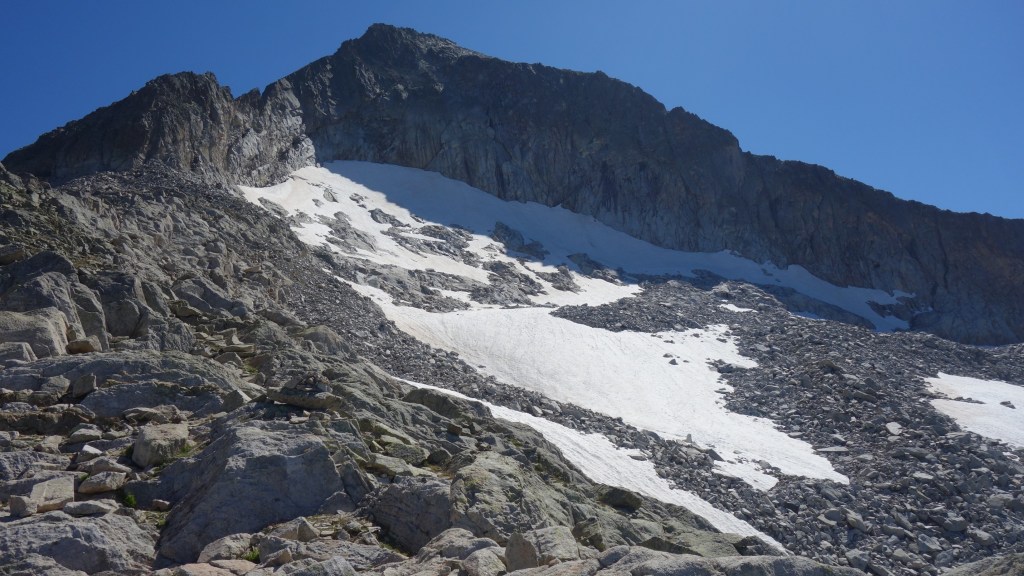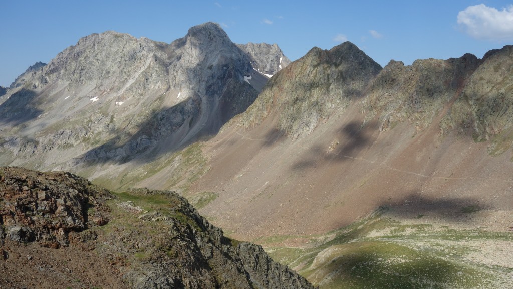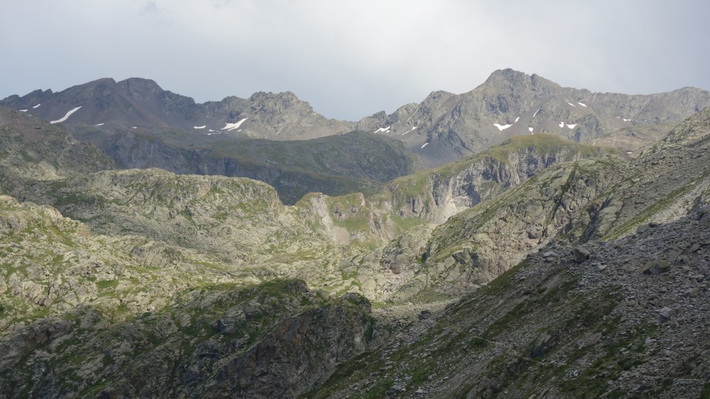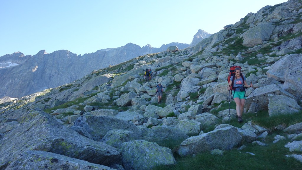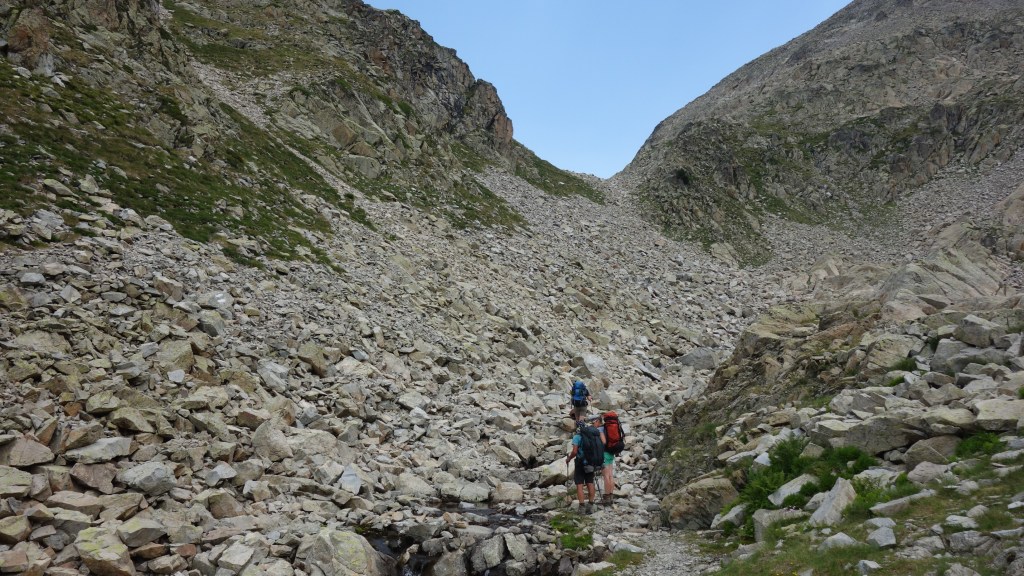 We komen iets te hoog uit op de bergkam en moeten terug een stukje afdalen om de couloir te vinden waar we kunnen doorsteken. Met de zware rugzak is het wat labeur om boven te geraken. Ook bij de afdaling blijft het terrein ruw en mentaal vraagt het energie om continu elke stap te overwegen.
