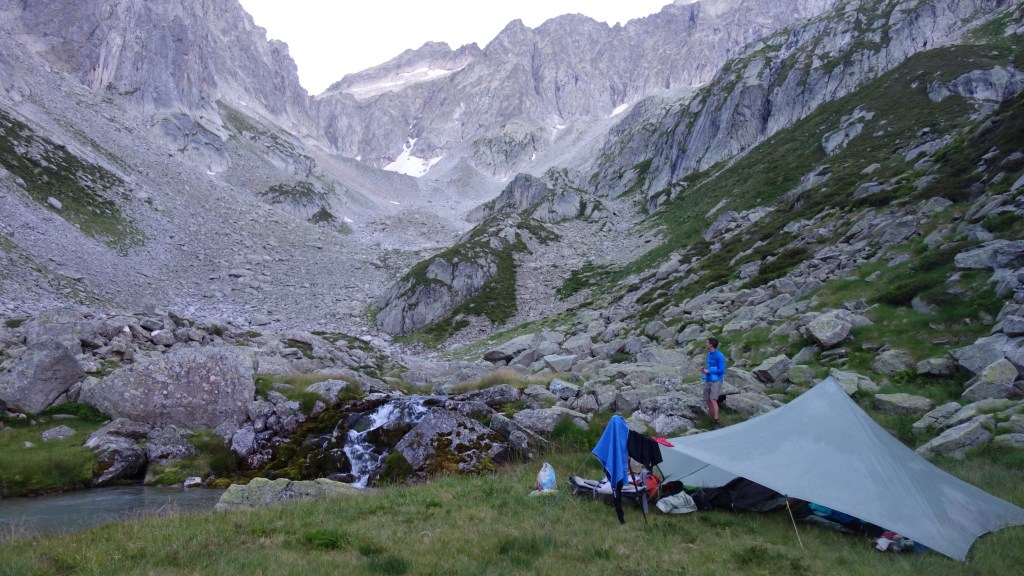 Nabij Refuge de Pombie is het bivakterrein ietwat hobbelig en het is dus wat zoeken naar vlakke stukken. Eenmaal de tarp gezet, gaan we nog een koffietje en stukje taart bij de hut halen om dan, alweer tijdig, onze slaapzak in te duiken. Nog een paar blaadjes lezen in de dwarsligger en dan vallen de ogen vanzelf dicht na een ganse dag gezonde berglucht.