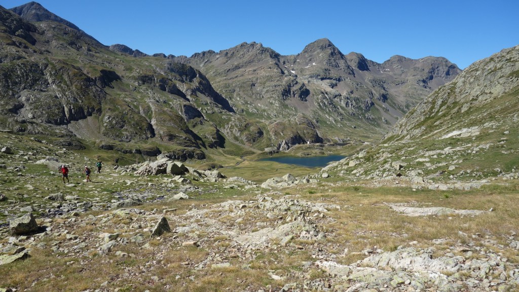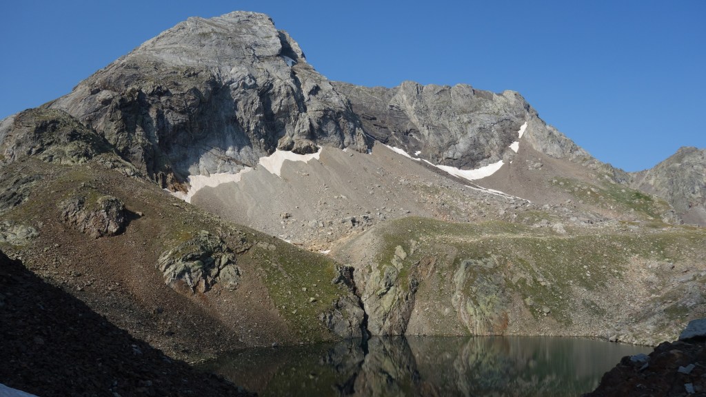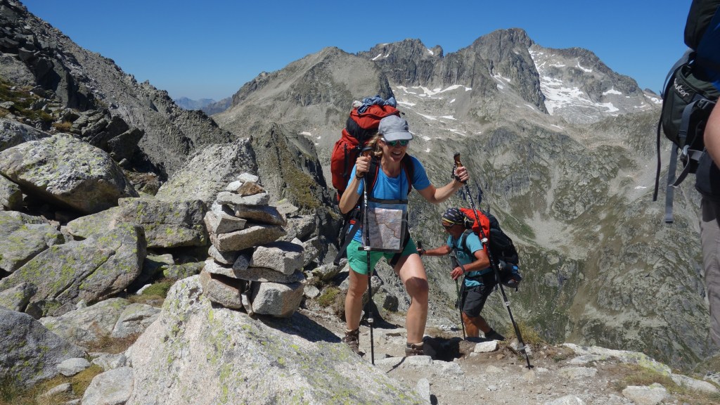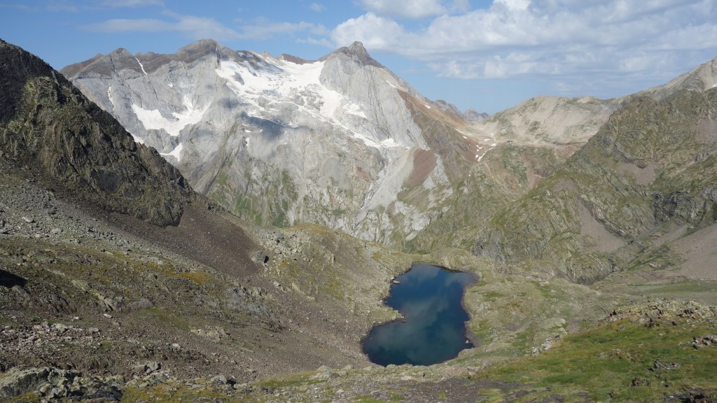 Een mooi bergpad leidt ons voorbij diverse meren tot Lac Glacé. Daar is het terug op kaart navigeren om over ongebaand terrein de Col des Gentianes te bereiken. Op de pas kijken we uit op de Glacier d’Ossoue en de normaalroute naar de top van de Vignemale waar we enkele touwgroepen zien klimmen.