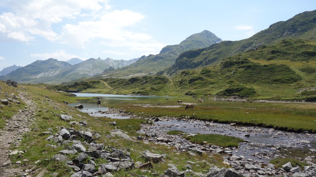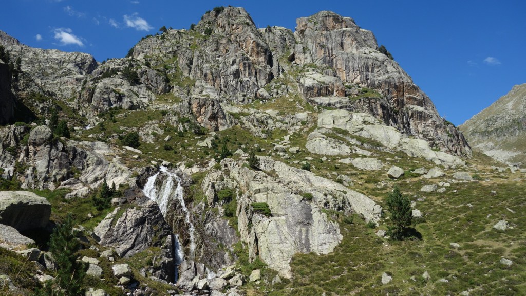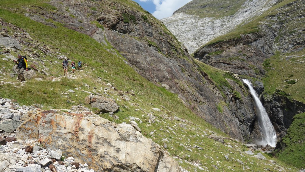 We duiken terug naar beneden richting de veelbelopen GR10 die we volgen tot Refuge Granges de Holles. Bij de Cabane de Lourdes gaan we even de verhitte voeten in het riviertje steken om daarna de laatste, lange, hele lange, warme, hele warme kilometers naar ons eindpunt af te werken.